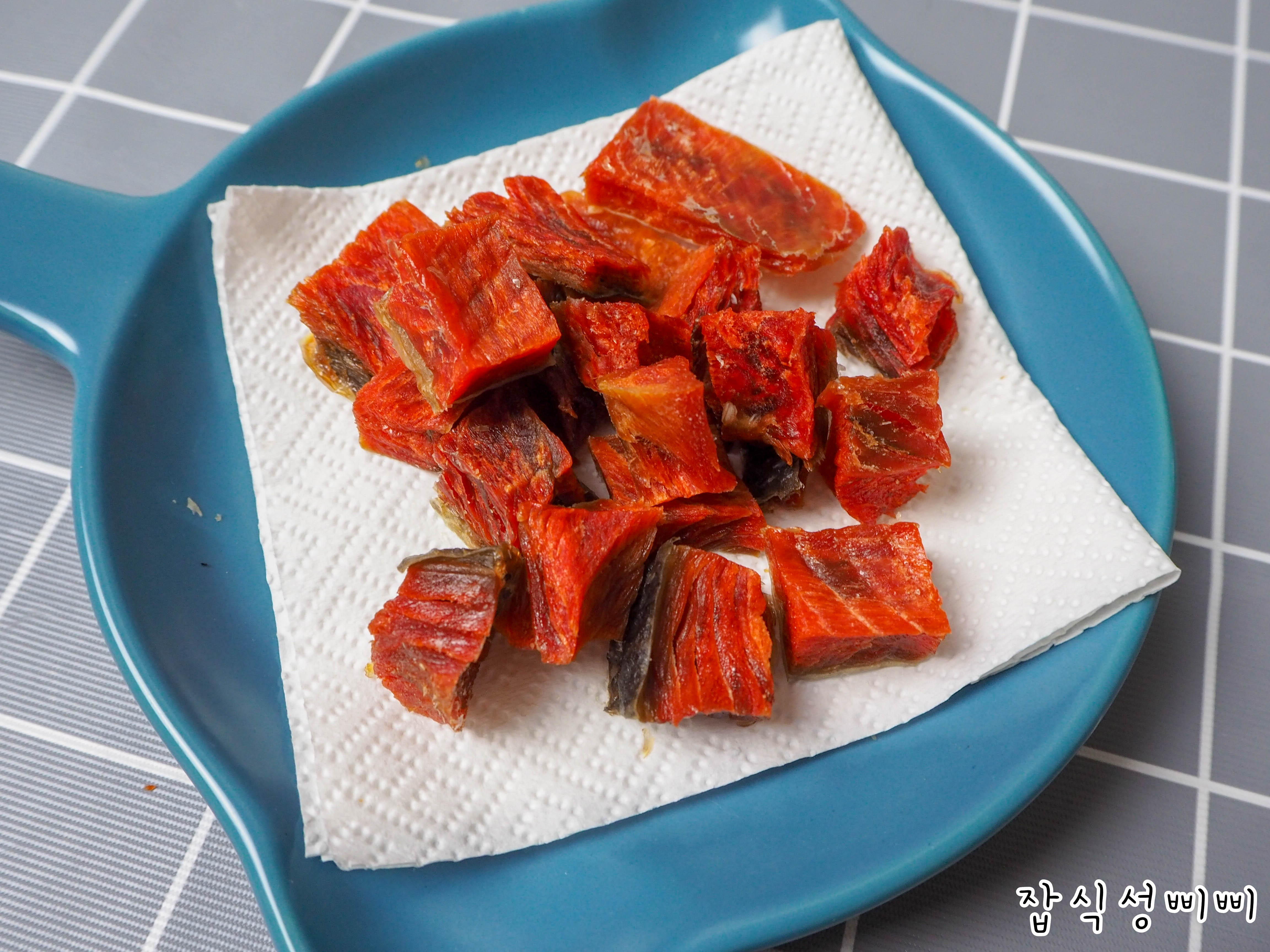 손질도 간편하고 건조할 때 역한 냄새가 심하지 않아서 간편하게 만들 수 있었던 연어큐브간식!