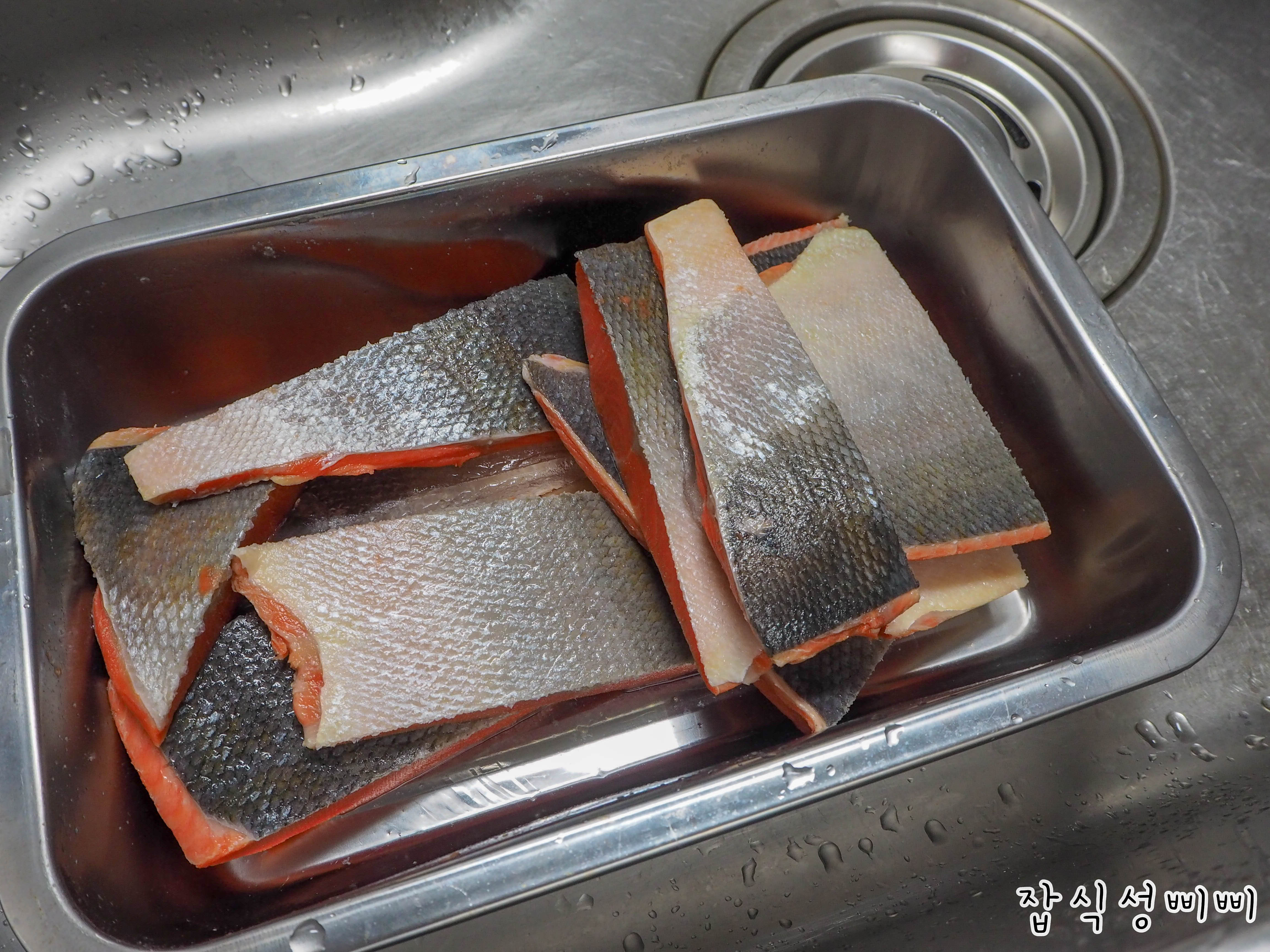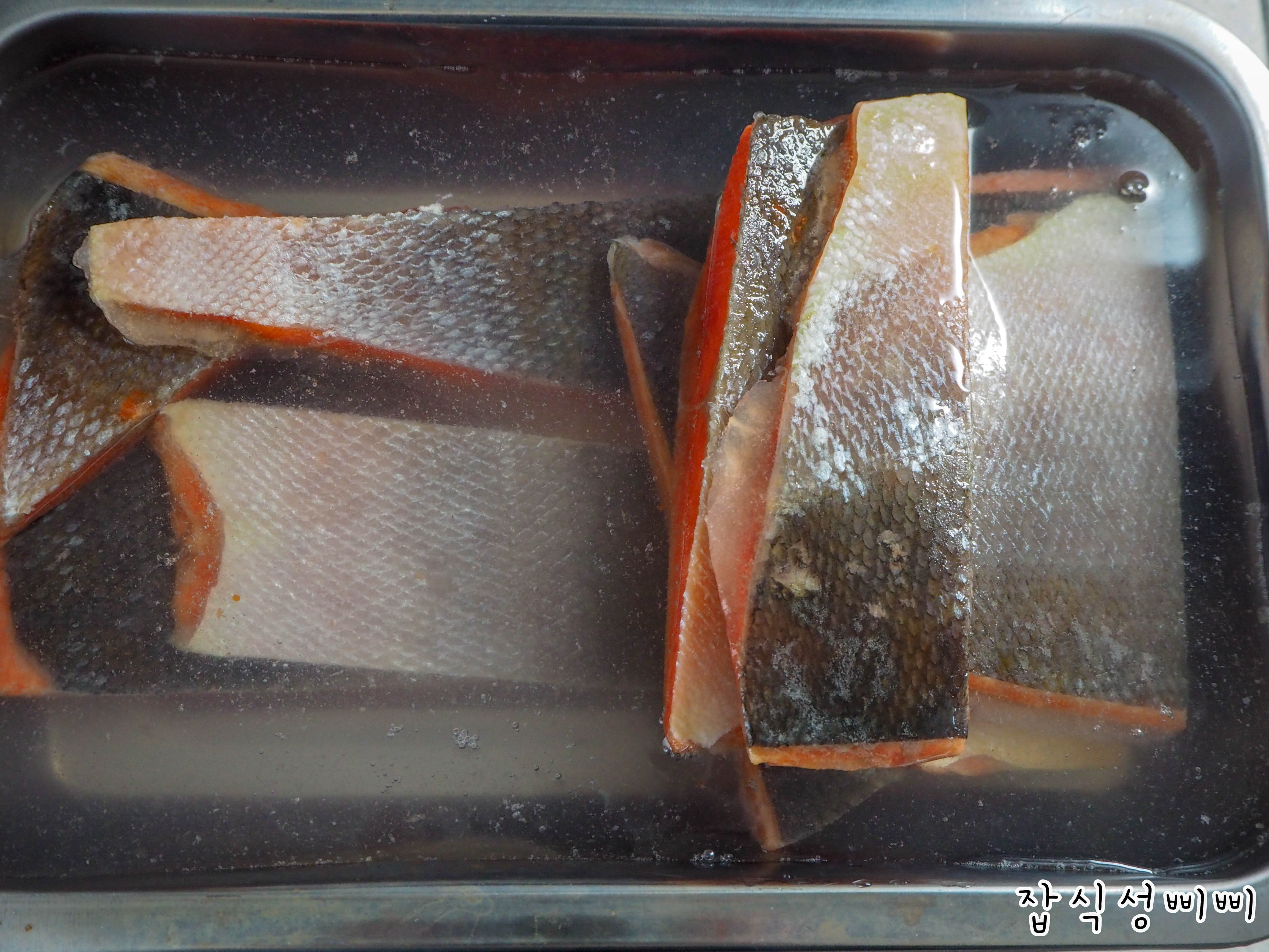 연어가 워낙 기름기가 많다 보니, 저는 해동도 하고 기름기도 조금 뺄겸 해서 물에 조금 담궈뒀어요!
