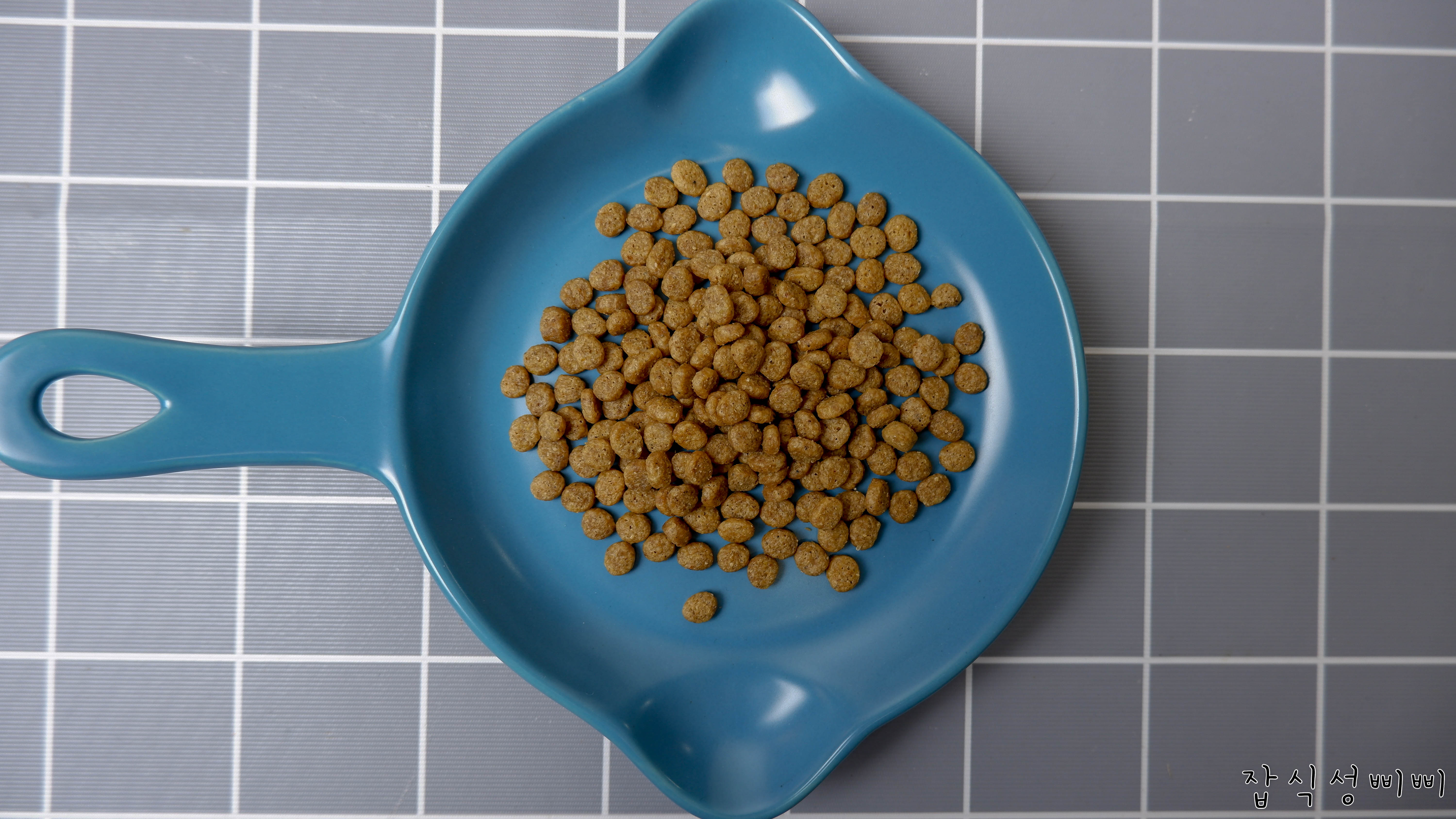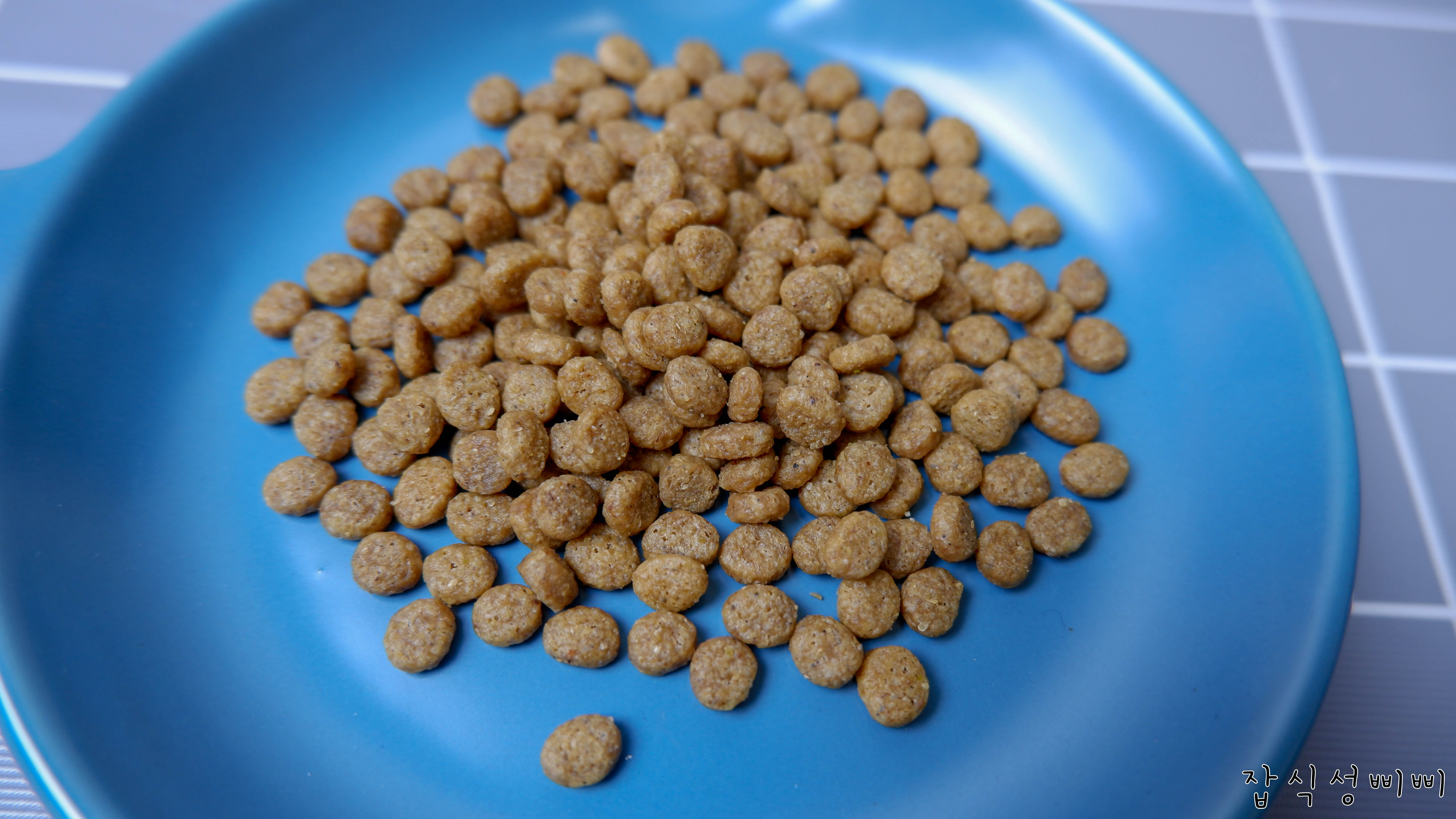 알이 굉장히 작은 편에 속해요. 초롱이는 알이 큰 사료를 완전 싫어하는데, 작은 키블이 완전 마음에 든다:)