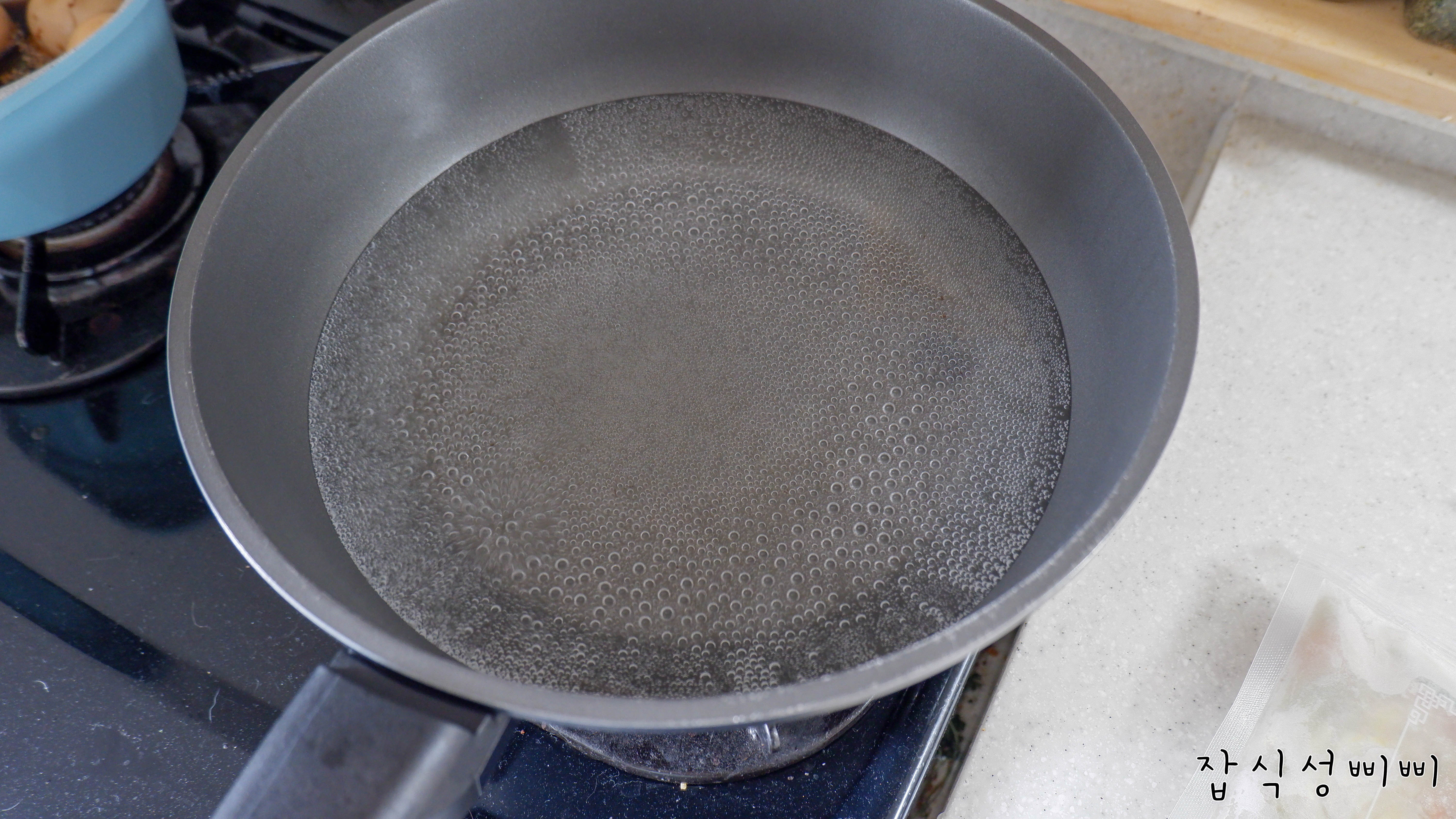 1. 소스는 끓는 물에서 해동 후 팬에 부어 1분 30초간 끓여준다.