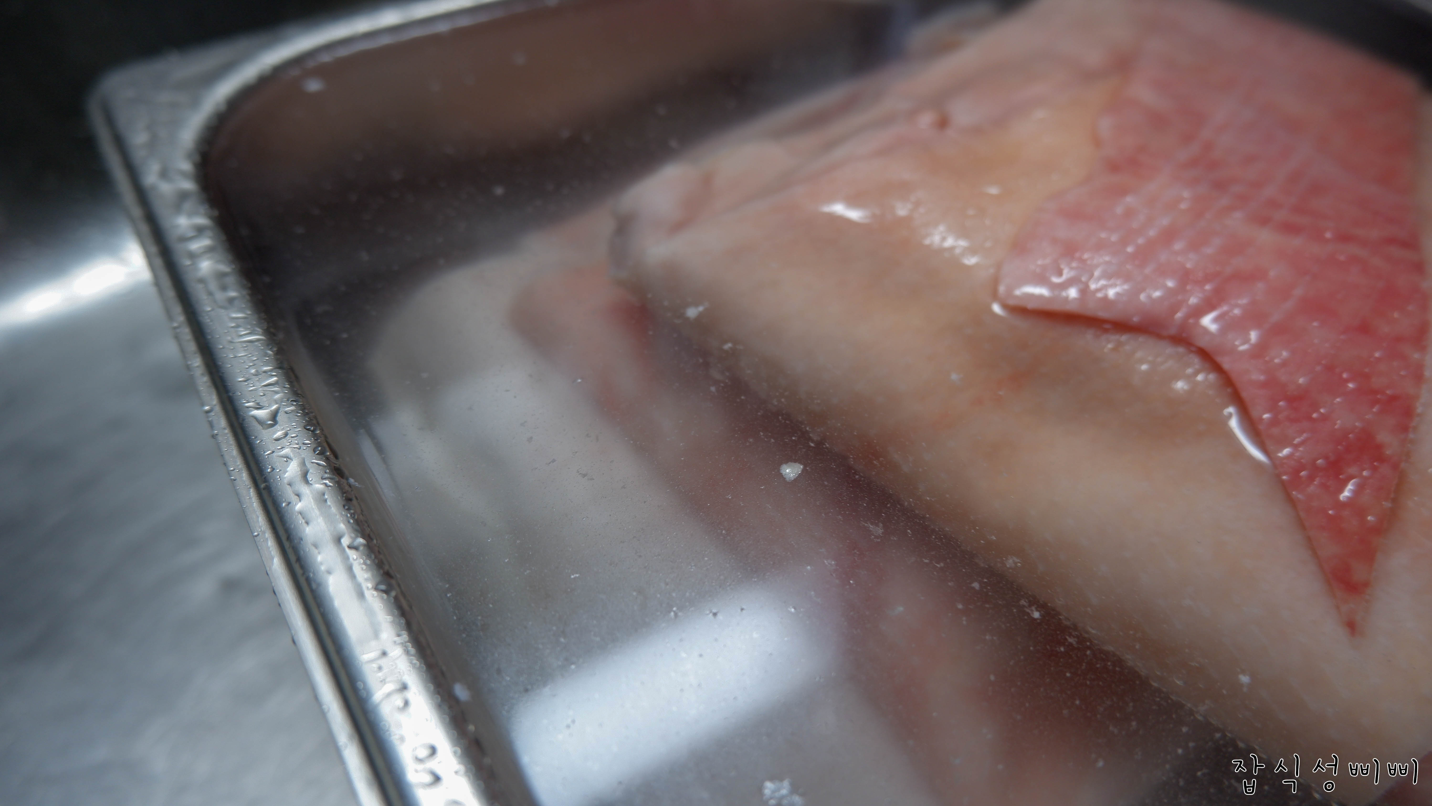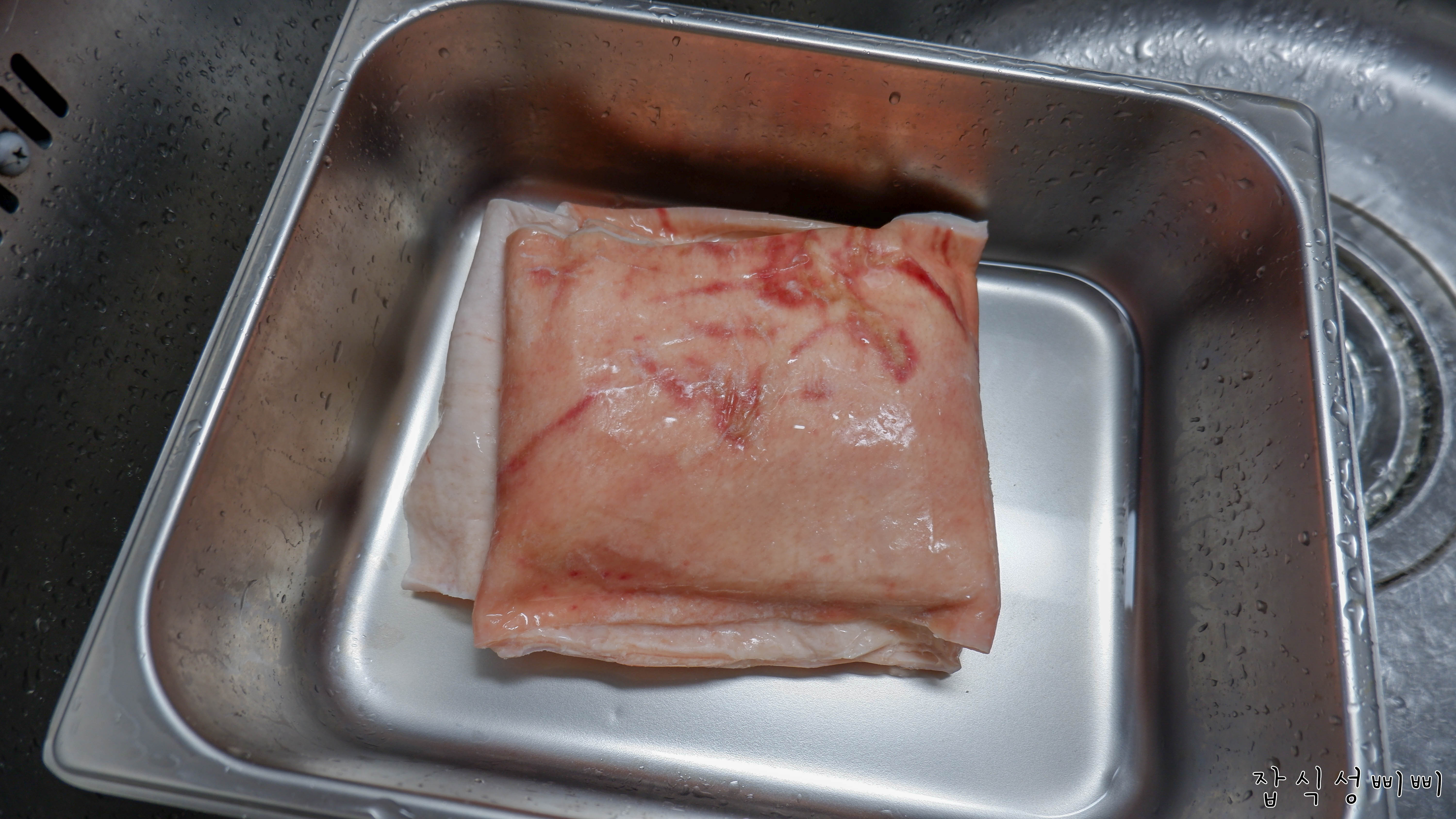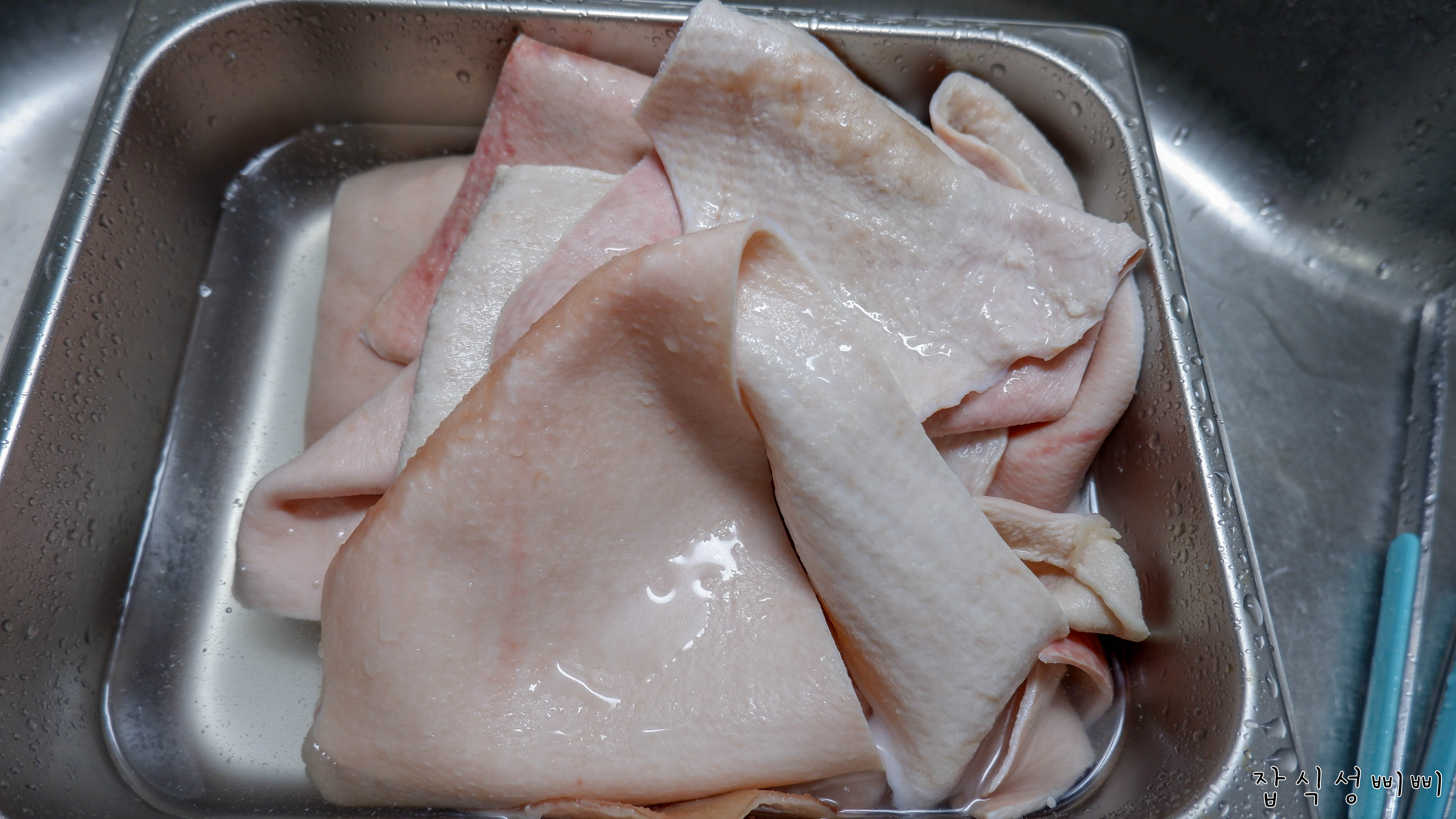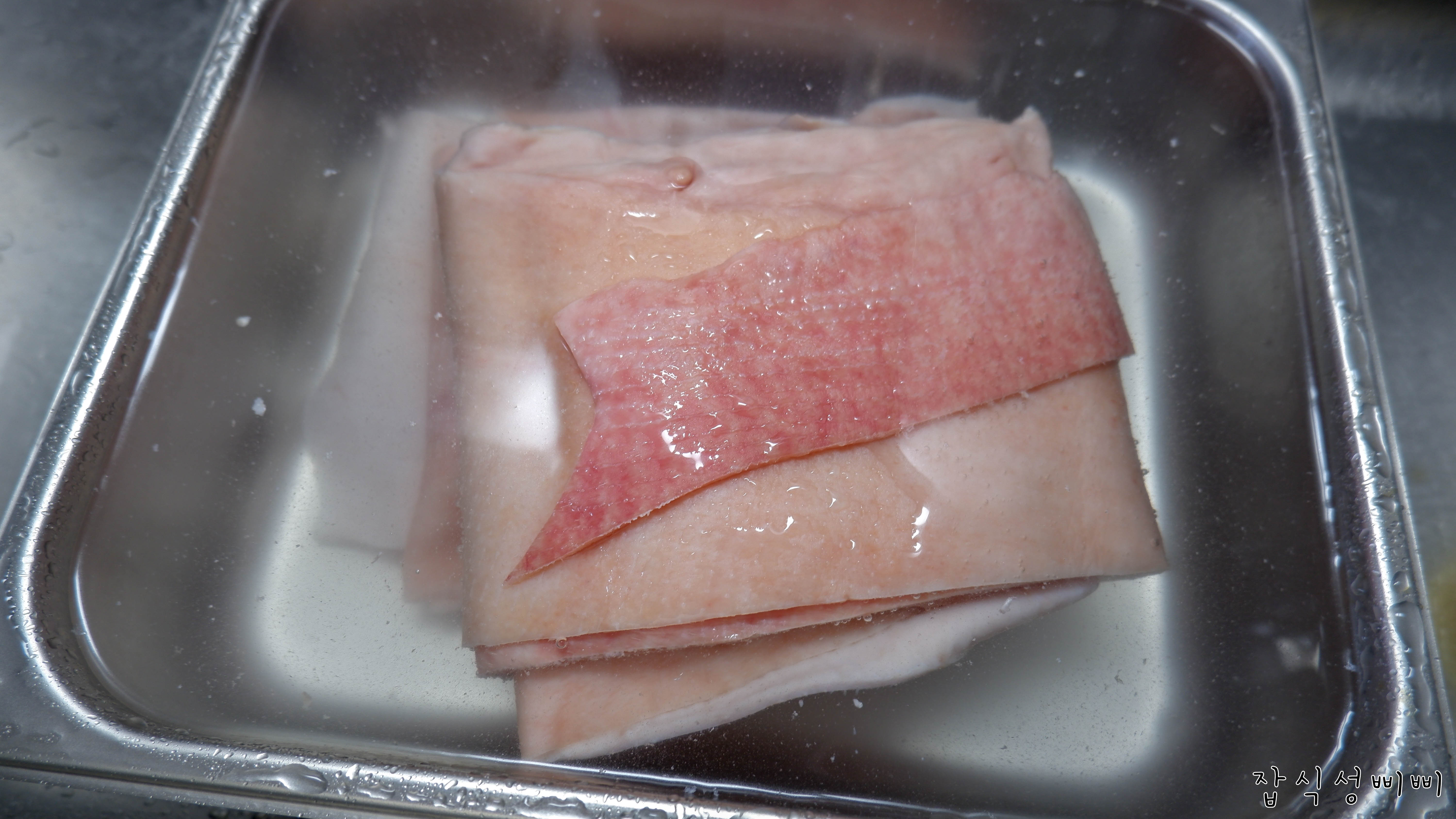 손질을 해야하기 때문에 돼지껍데기 온도를 낮춰주는 목적입니다. 불순물도 씻겨내려가구요.
