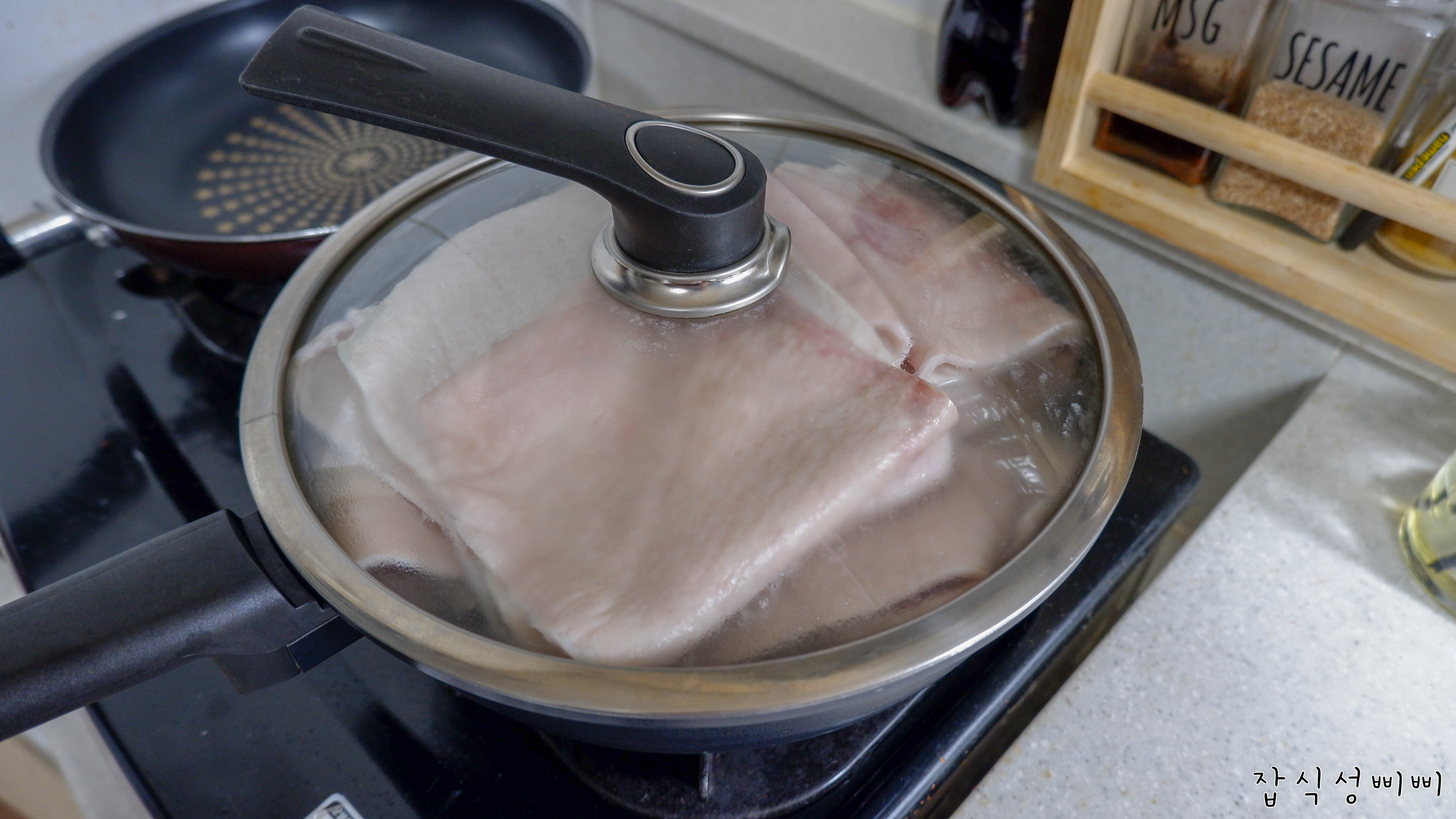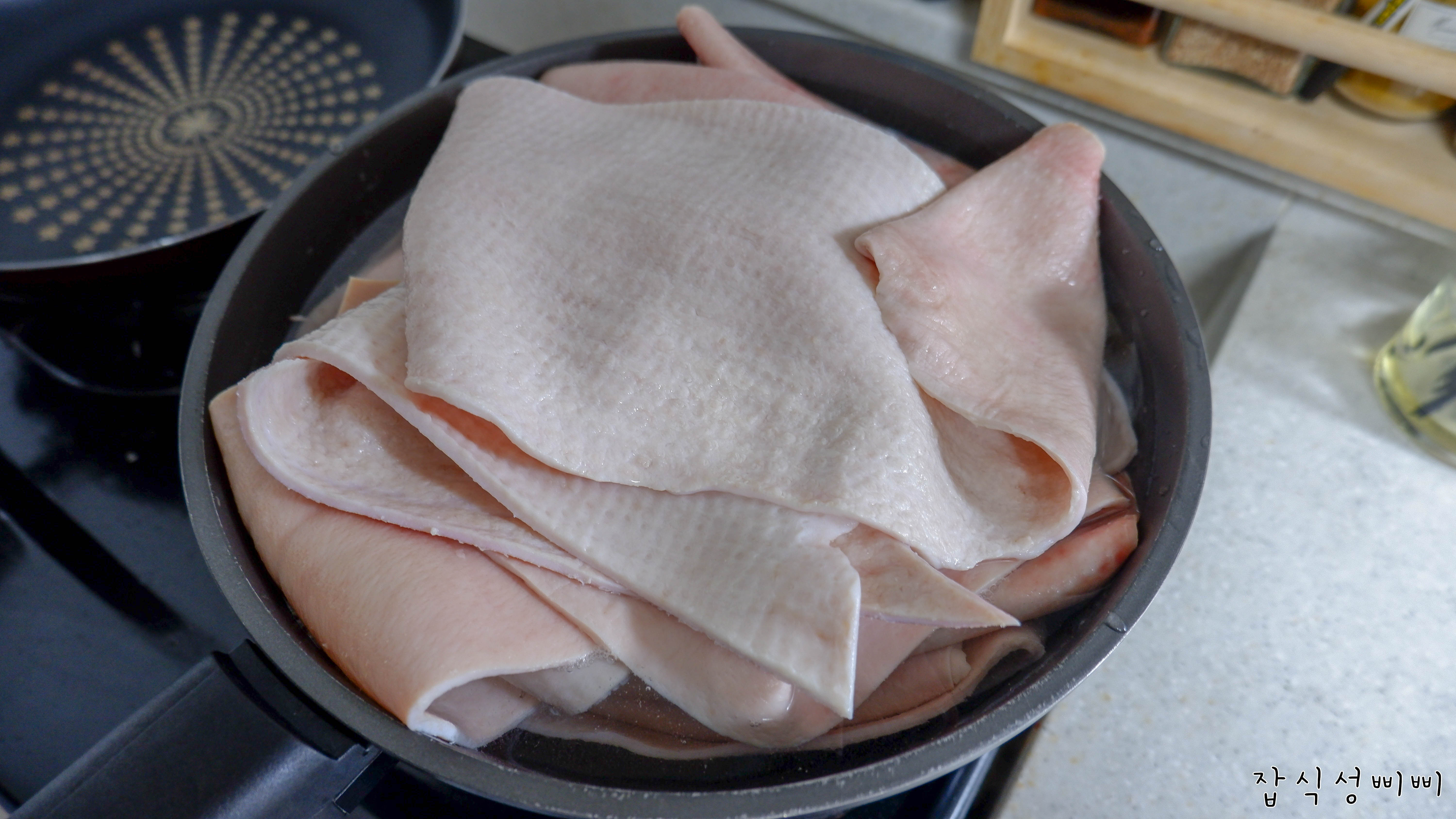 이제 돼지껍데기를 한번 데칠겁니다.. 생으로 손질하게 되면 정말 지옥을 맛보실거에요.