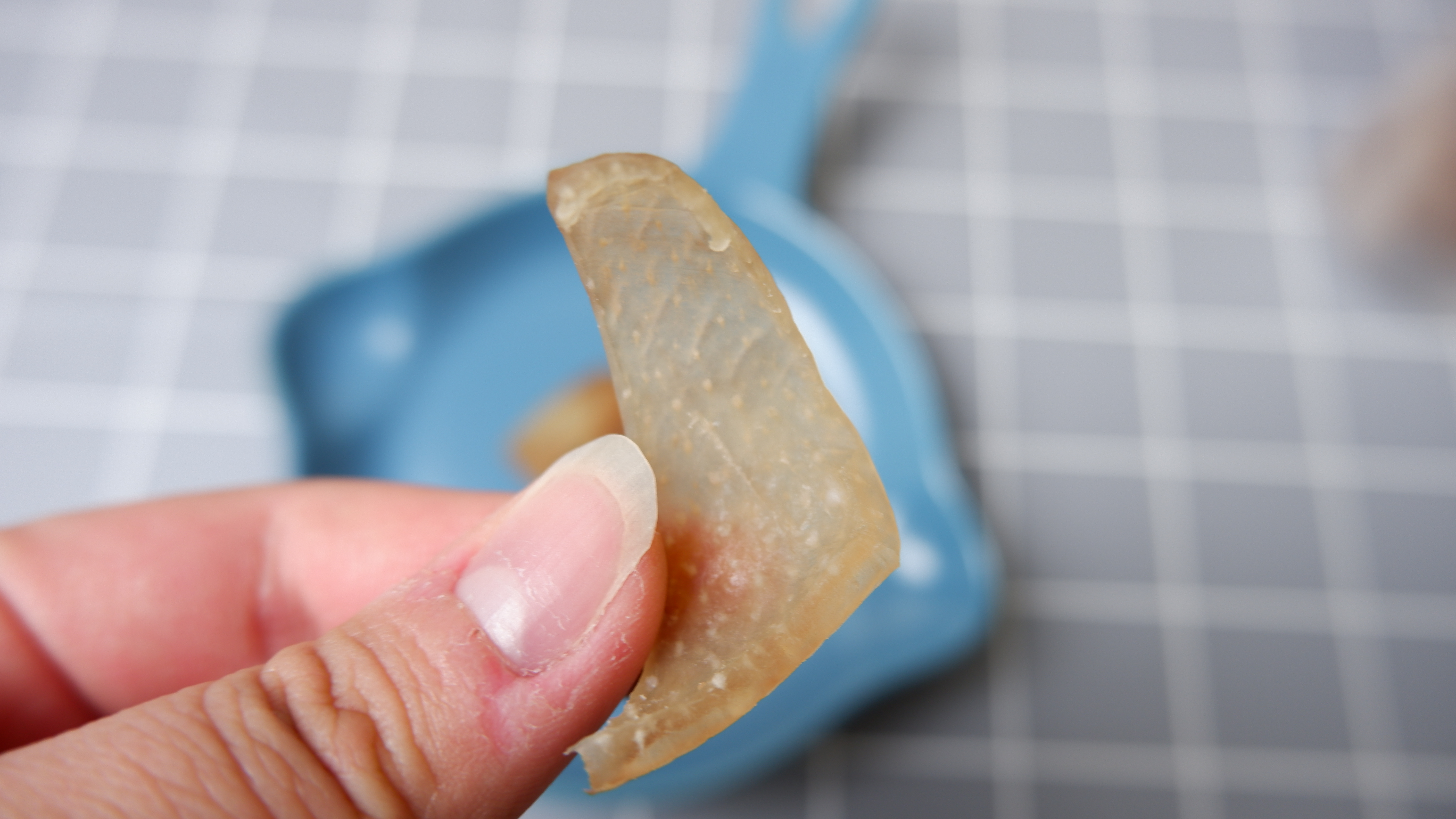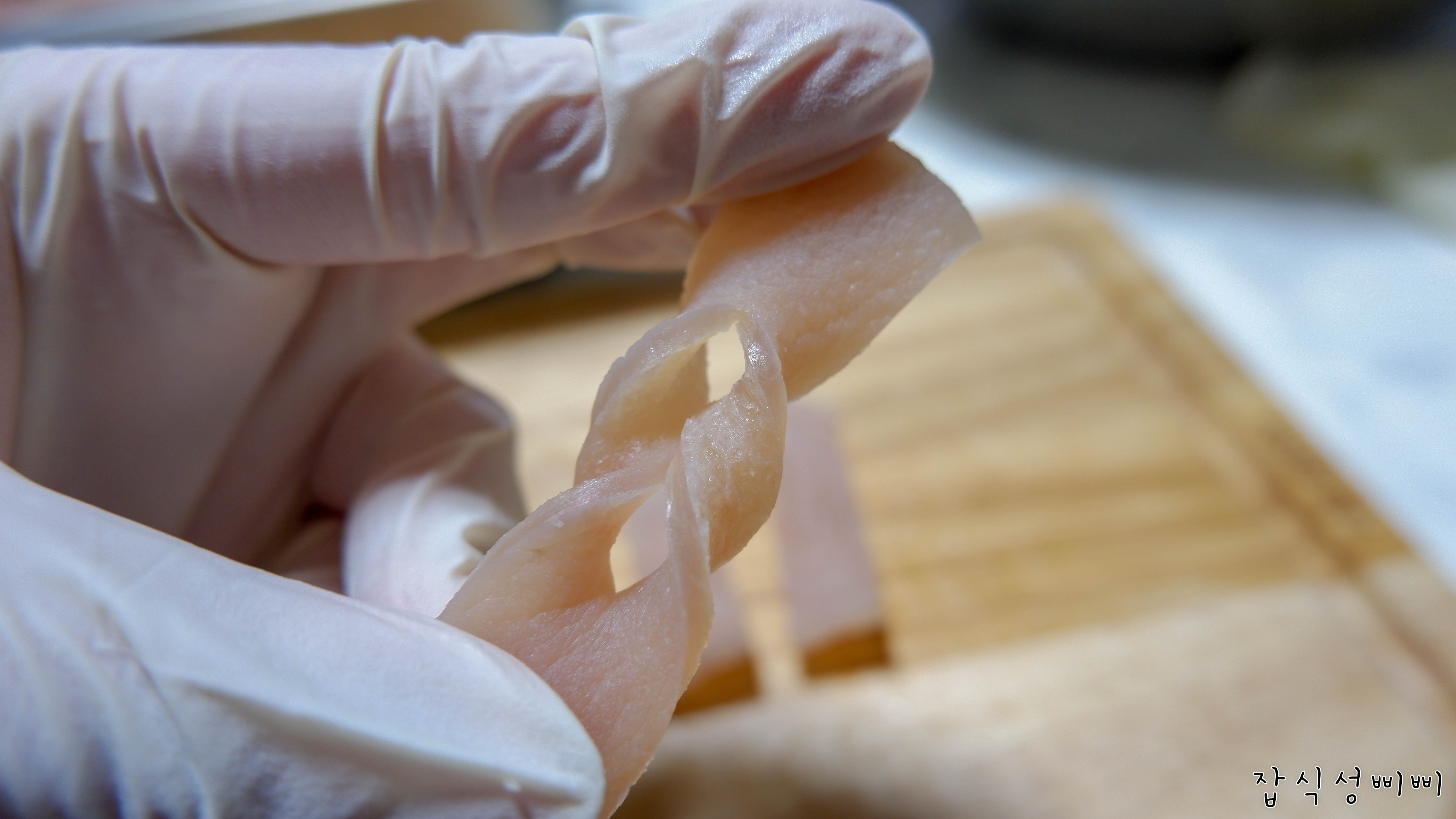 돼지껍데기 건조를 위해 물기를 제거하고~ 아이들이 먹기 좋은 크기로 모양 잡아줄거에요.
