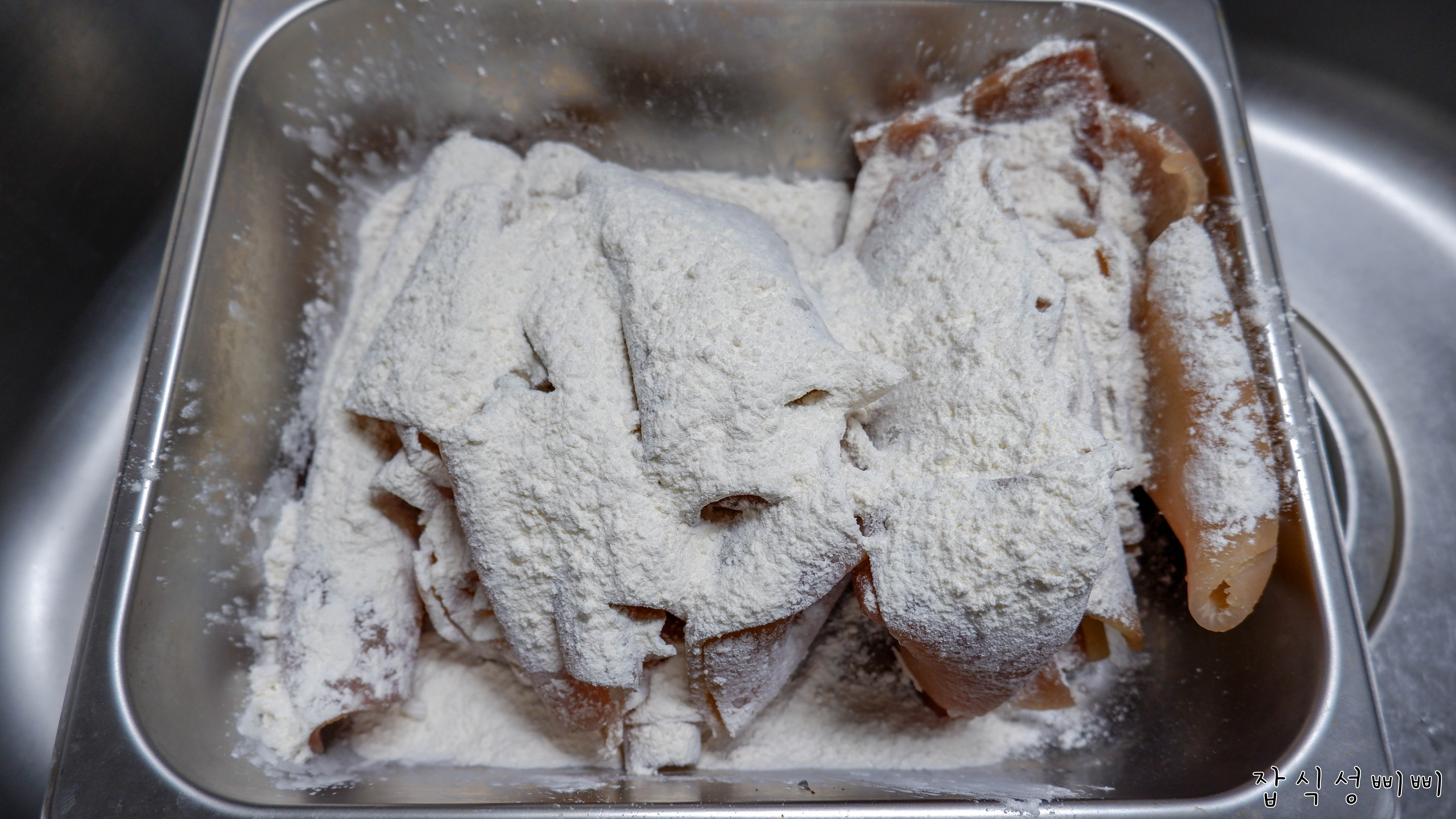 다시 다음날, 밀가루를 넣고 냄새와 기름을 잡기 위해 세척합니다..