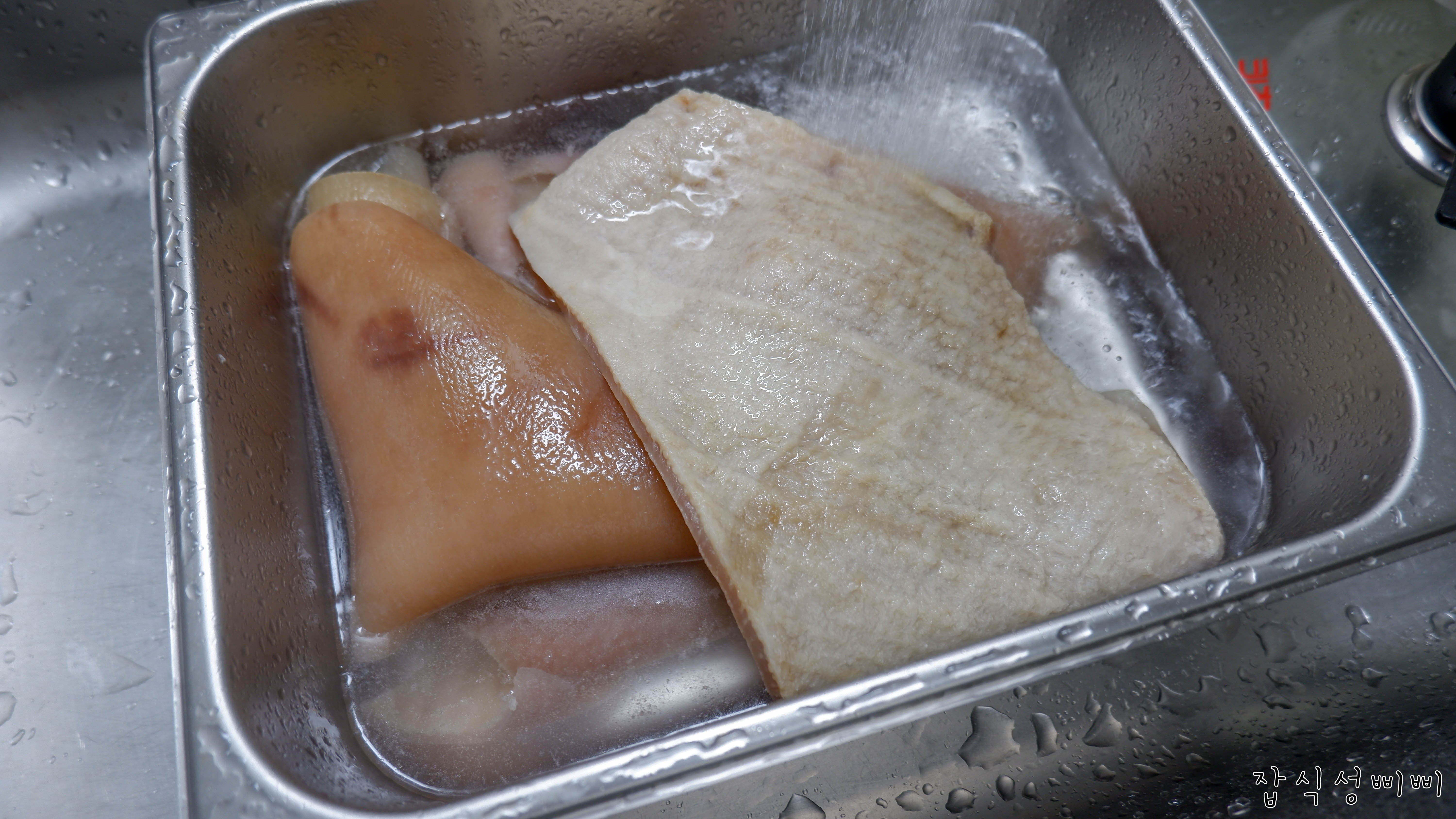 뜨겁게 삶아낸 돼지껍데기를 흐르는 물에 씻어주세요.