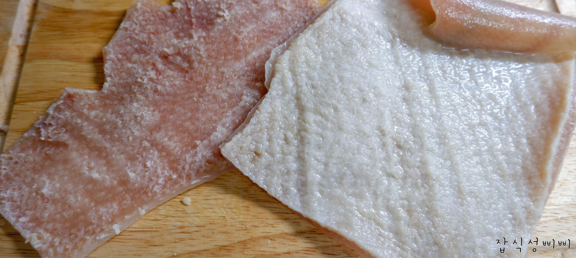 왼쪽이 손질 완료한 돼지껍데기입니다.