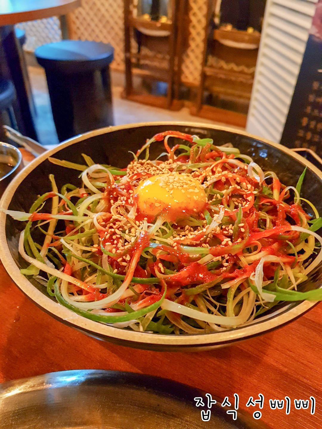거기다 계란 노른자가 톡 올라간 콩나물파채까지~ 고기와 잘 어울리더라구요.