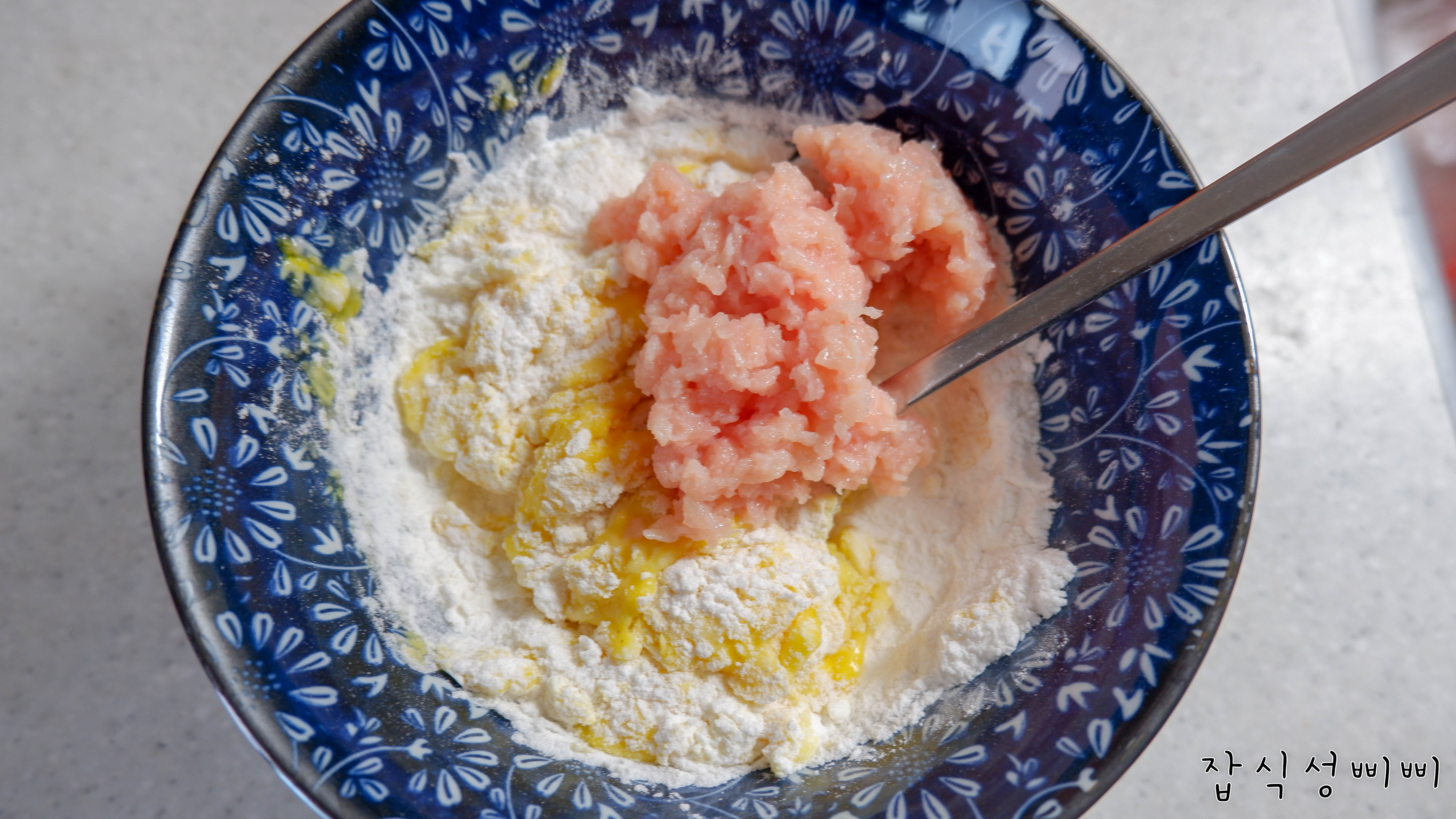 닭가슴살이 100% 해동된 게 아니라서, 수분이 조금씩 나오더라구요. 감안하고 반죽 농도를 조절할거에요.