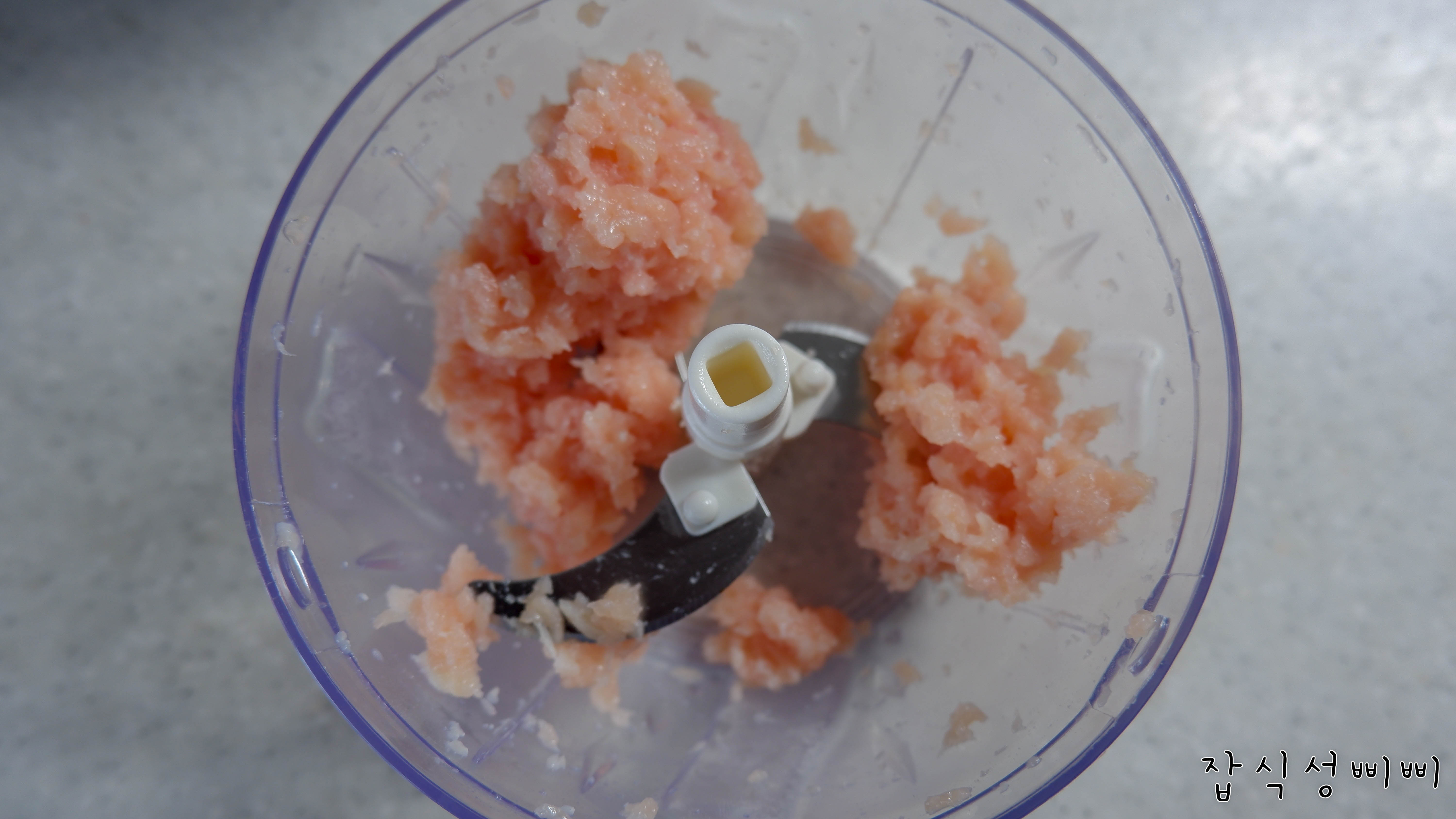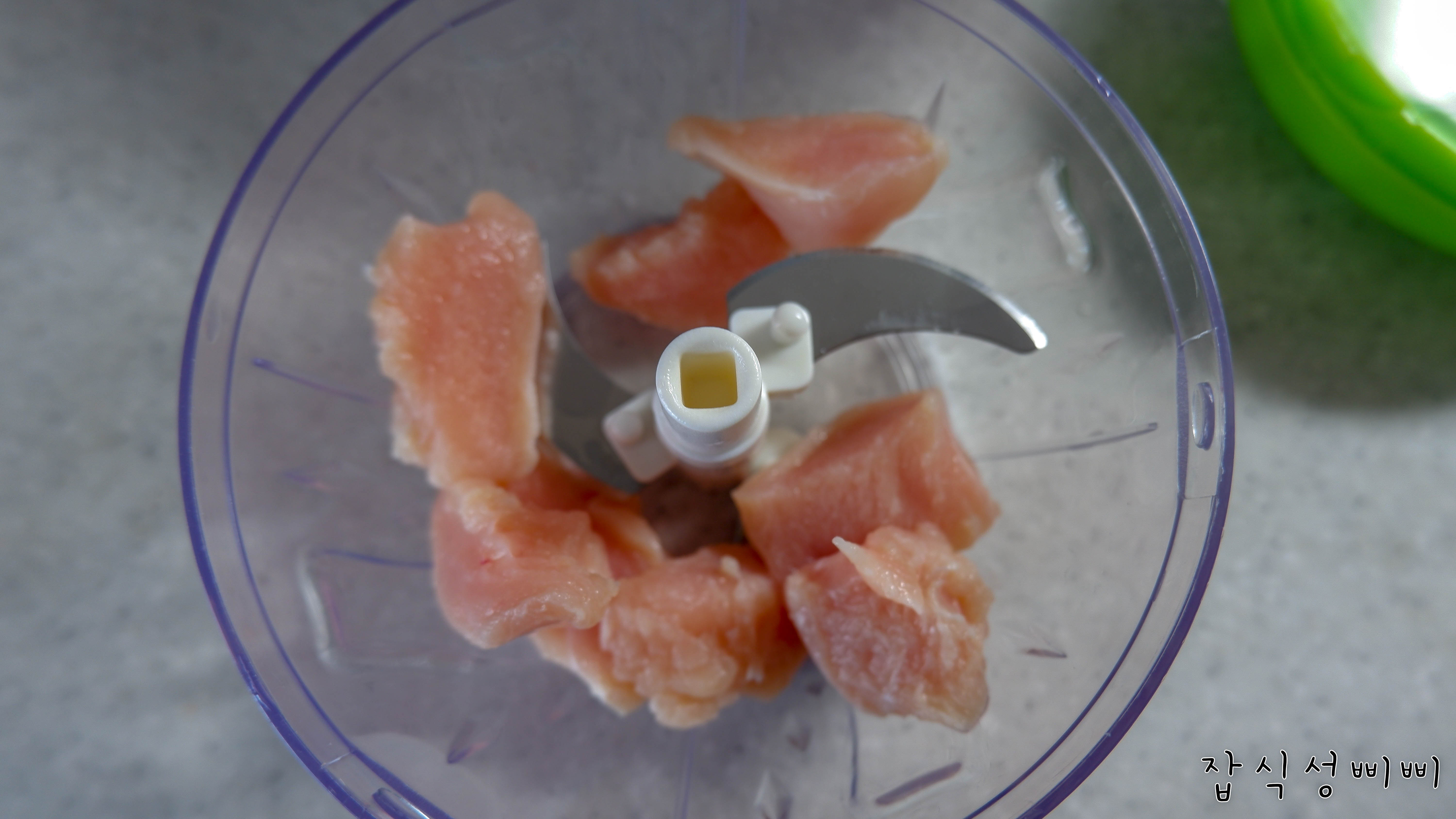 그리고 기호성을 높이기 위해 냉동 닭가슴살을 갈아서 넣어줬어요.
