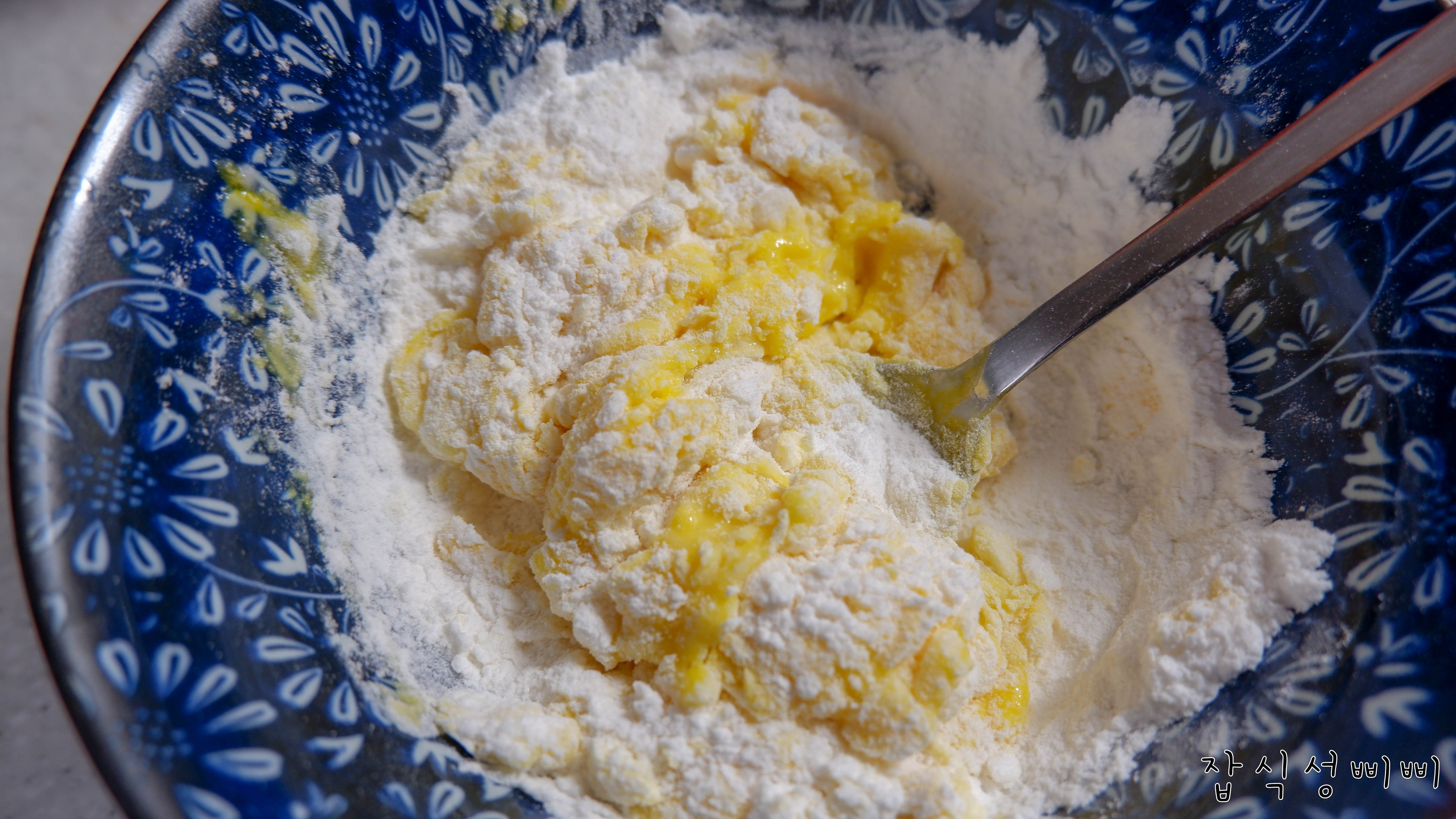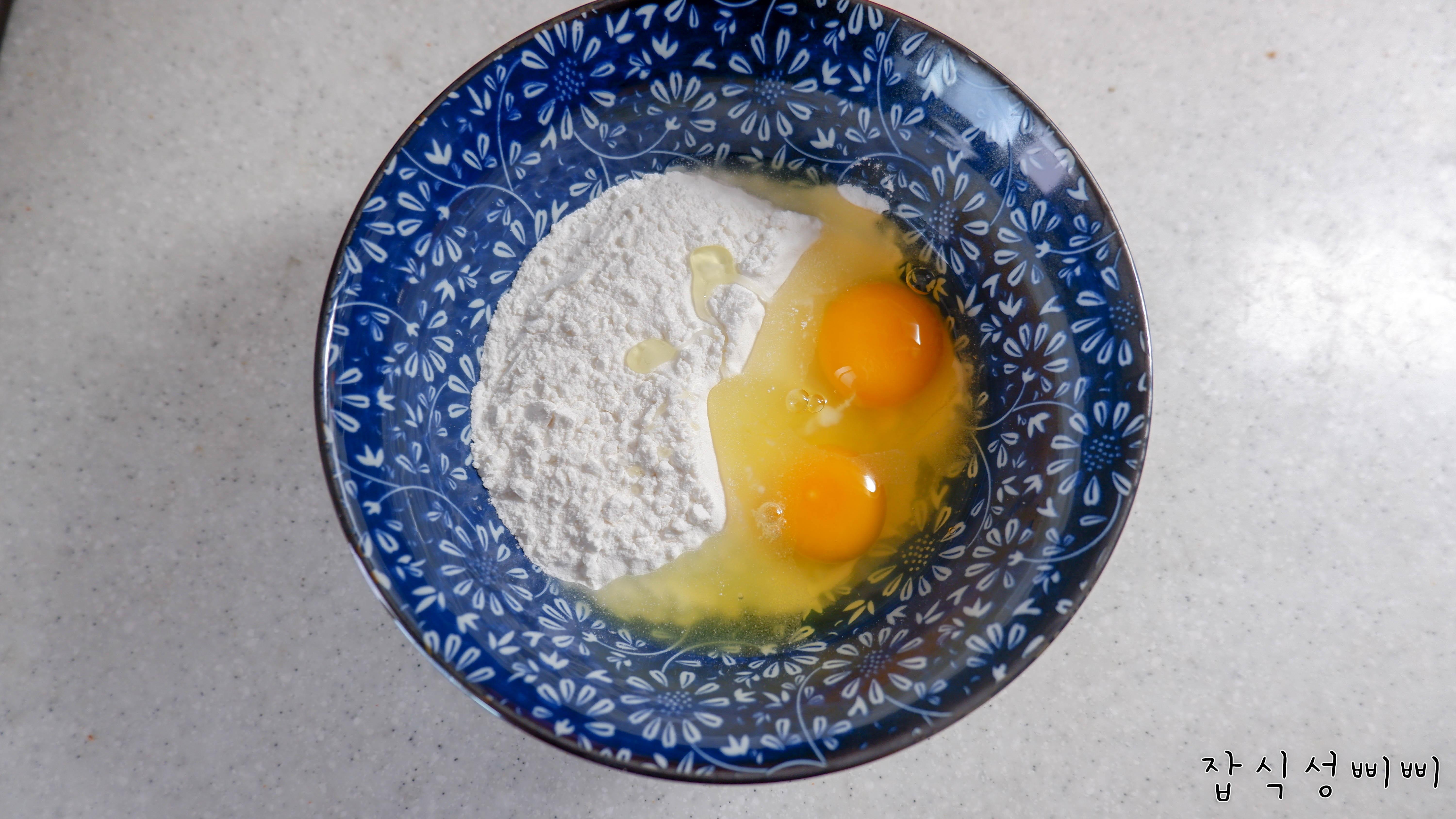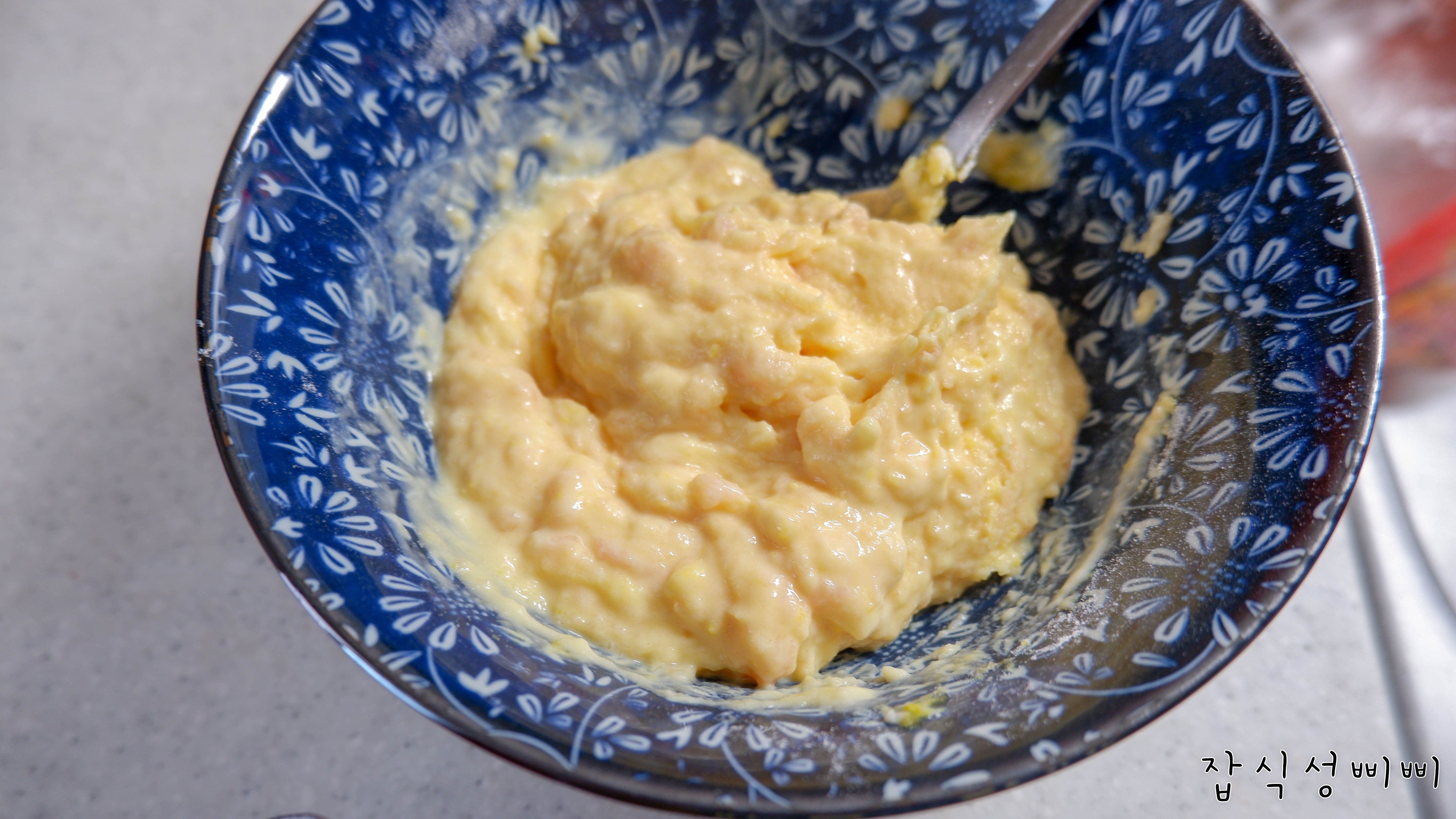 물처럼 묽진 않지만, 숟가락으로 떴을 때 살짝 되직한 농도로 반죽을 맞췄어요.