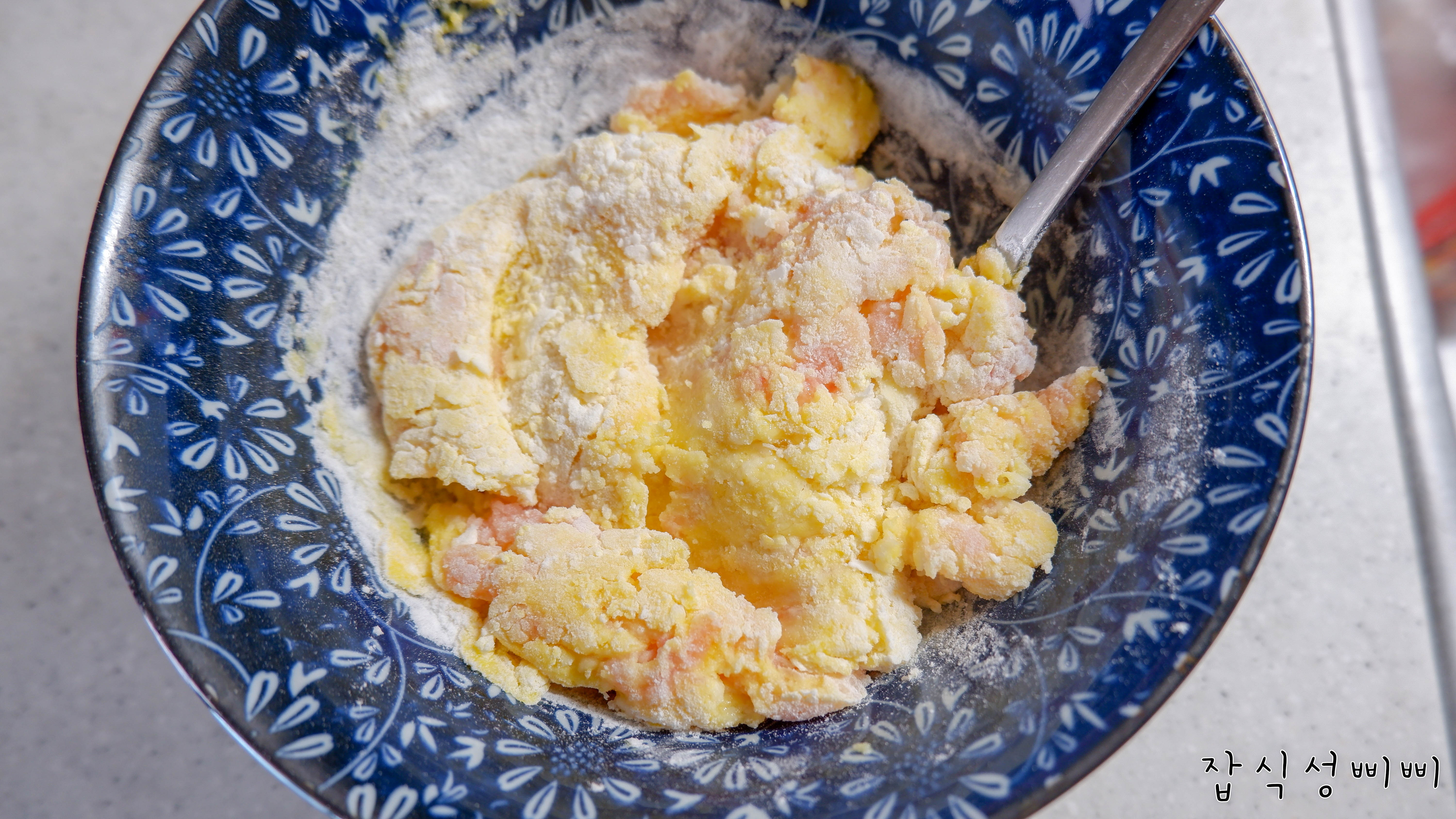 쌀가루가 날릴 수 있으니, 계란과 쌀가루를 반죽하듯 잘 섞어주세요.