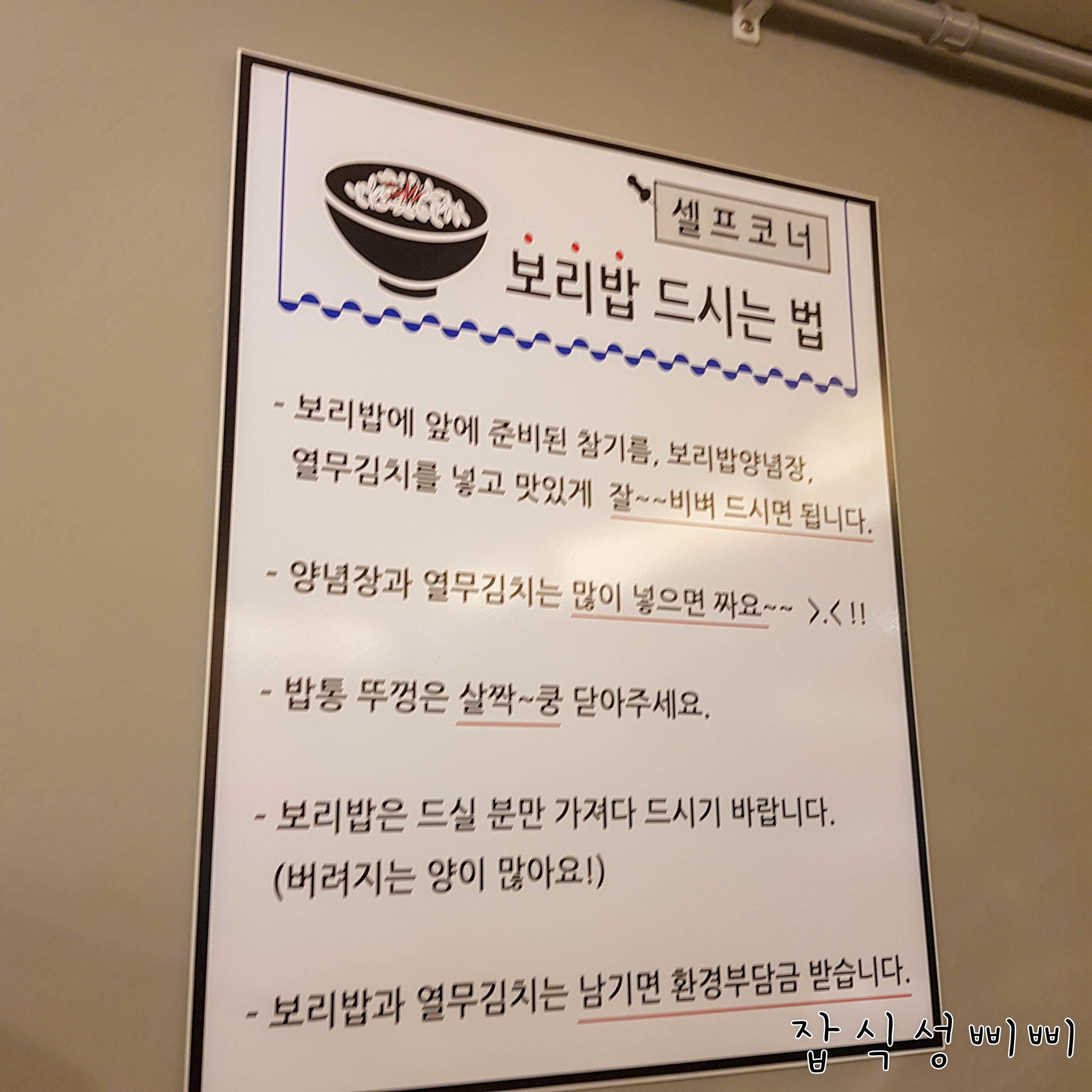 단, 보리밥을 욕심내서 드시다가 남기면 환경부담금 있다는 사실~! 욕심은 금물이랍니다.