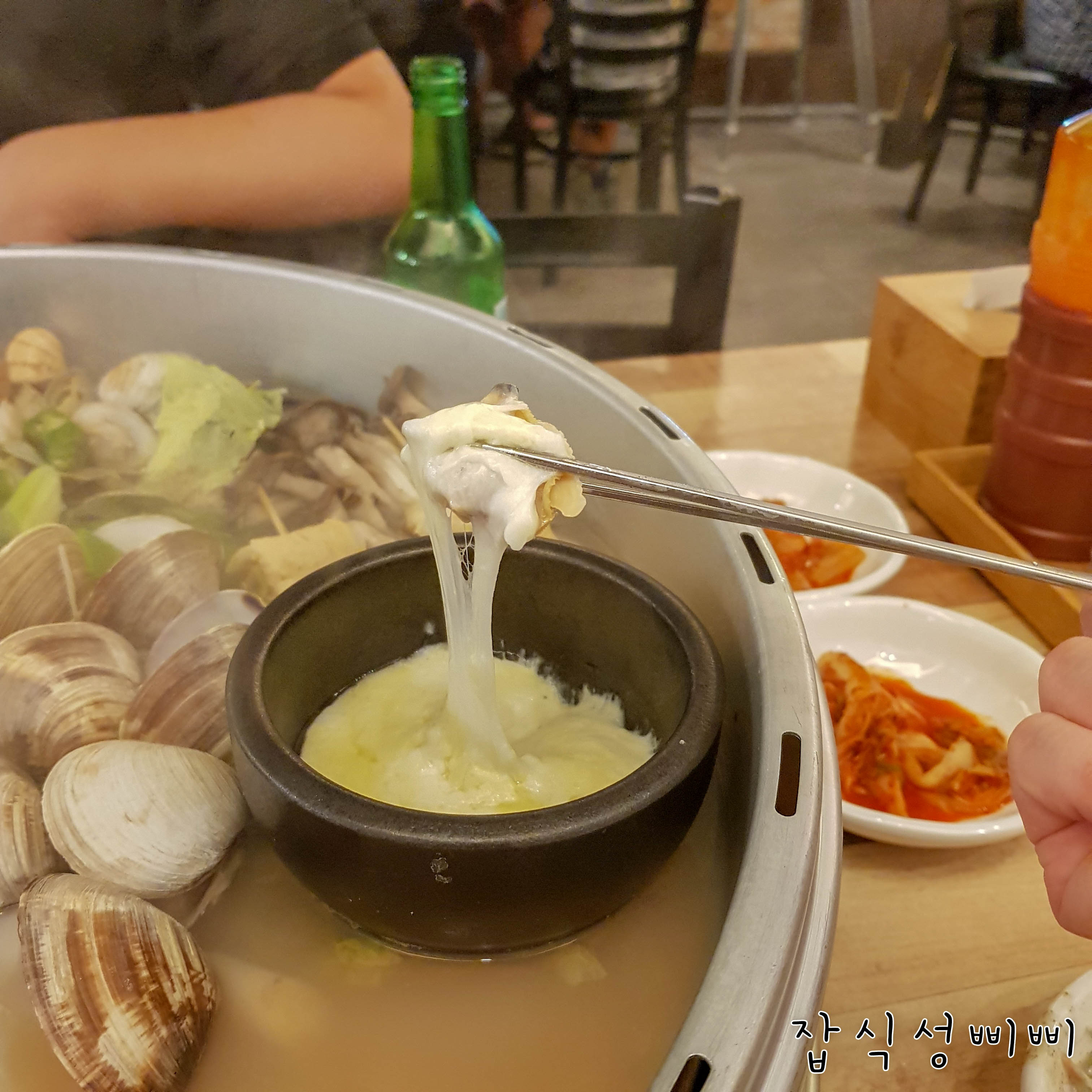 뚝배기에 잘 녹은 치즈는 조개를 찍어 먹으면 맛있어요!