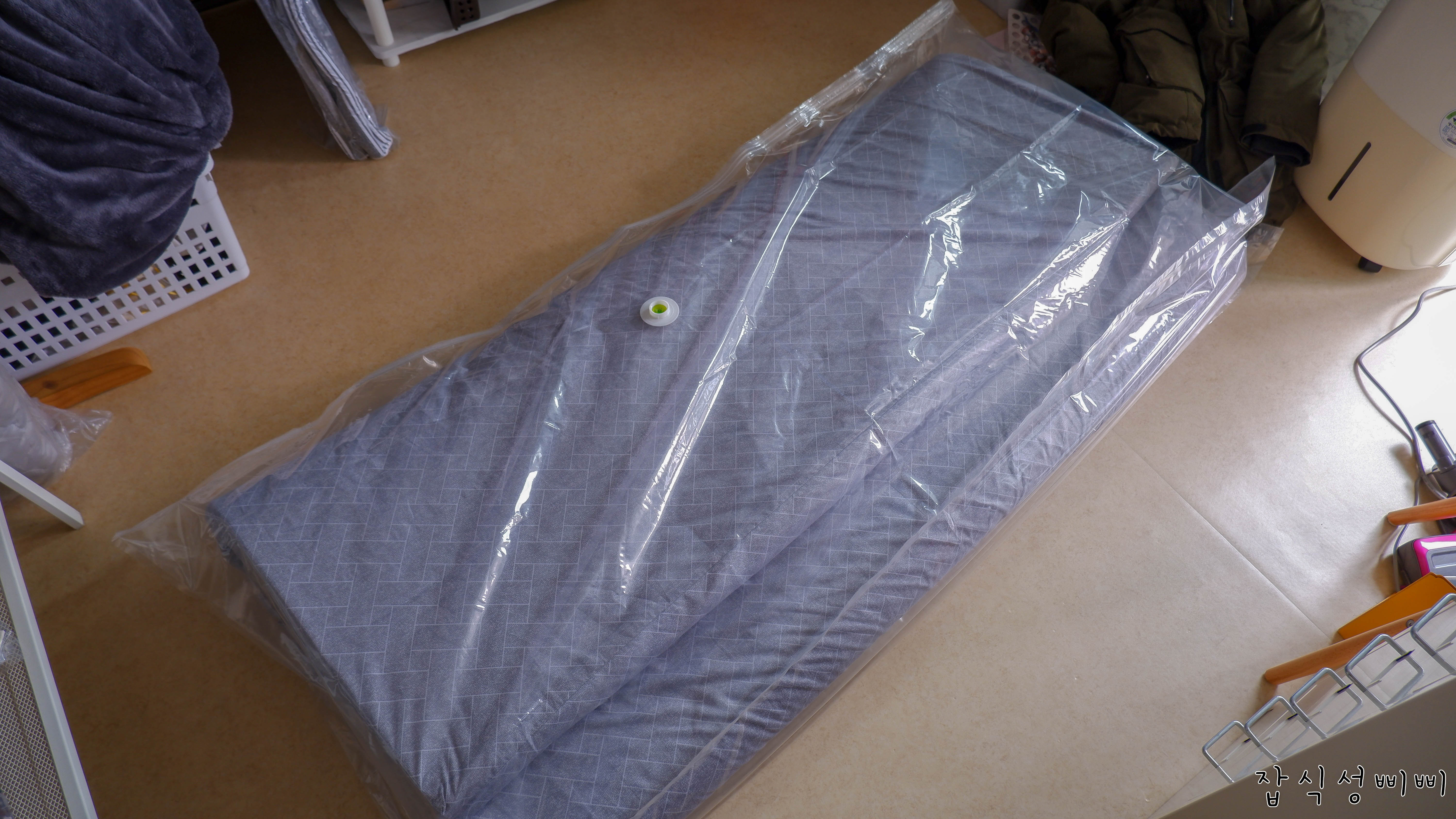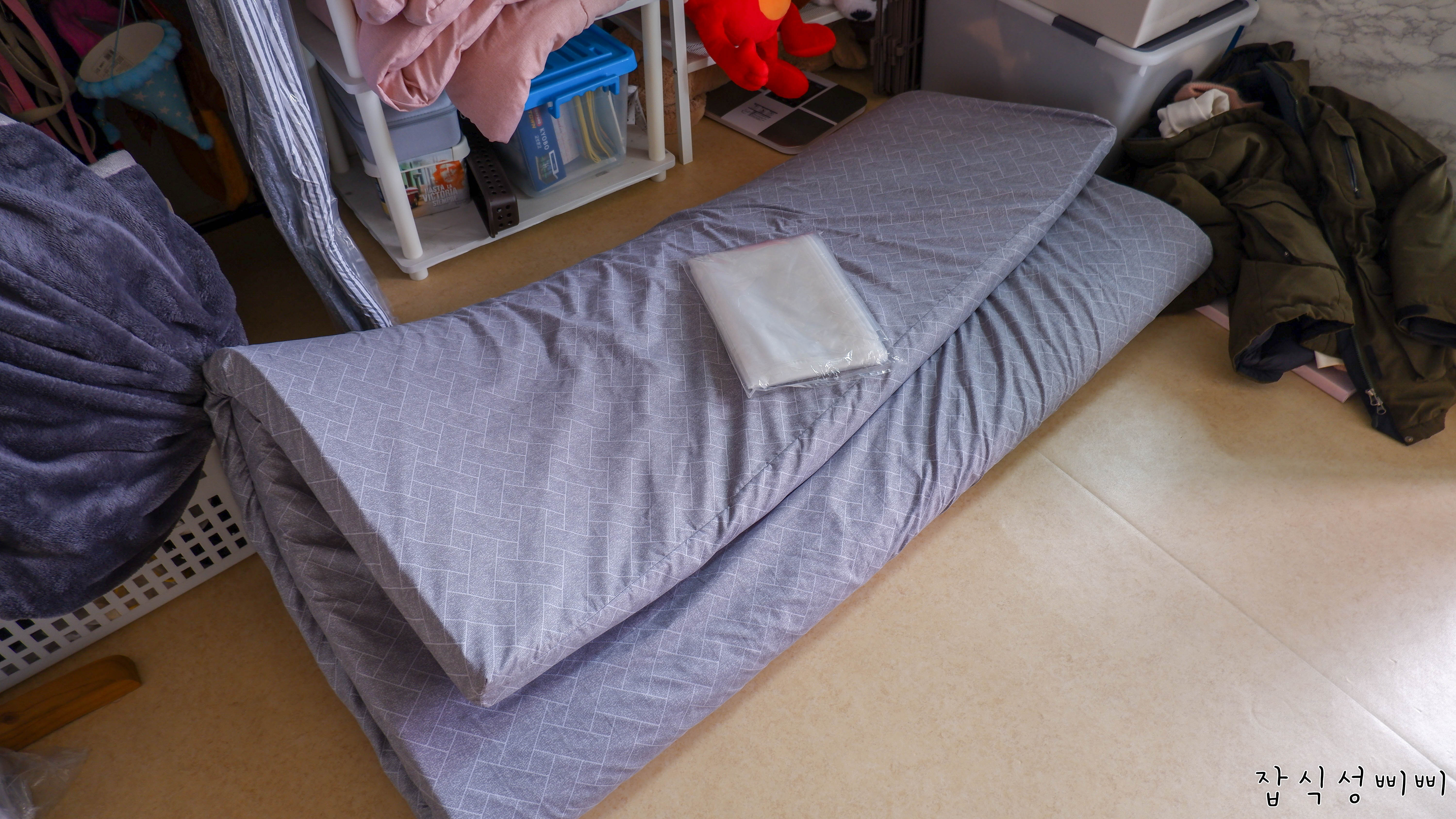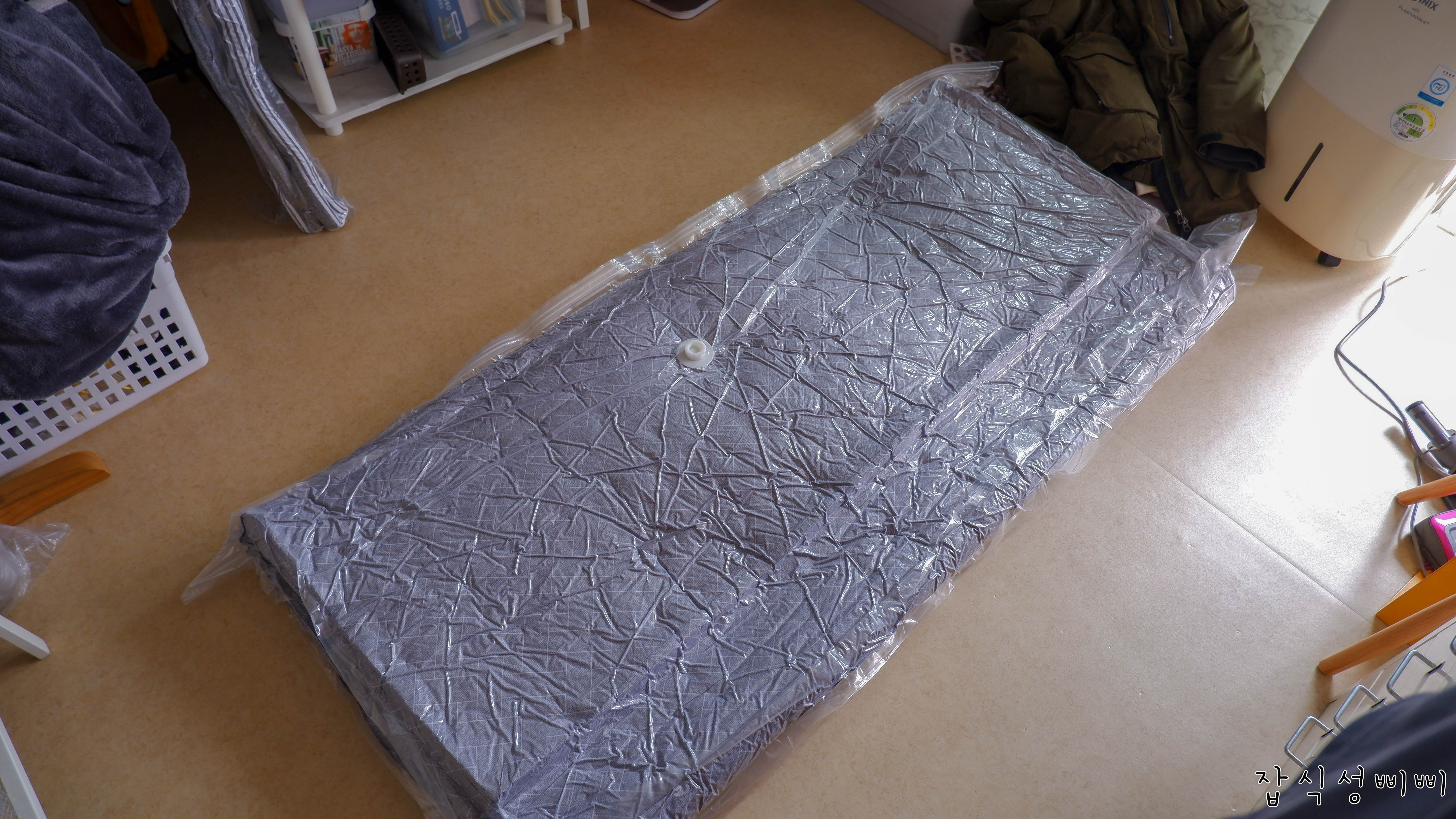 사실 요 매트리스는 부피를 그렇게 많이 차지하는건 아니지만 발에 채이고 공간활용도가 낮아서 압축해요.
