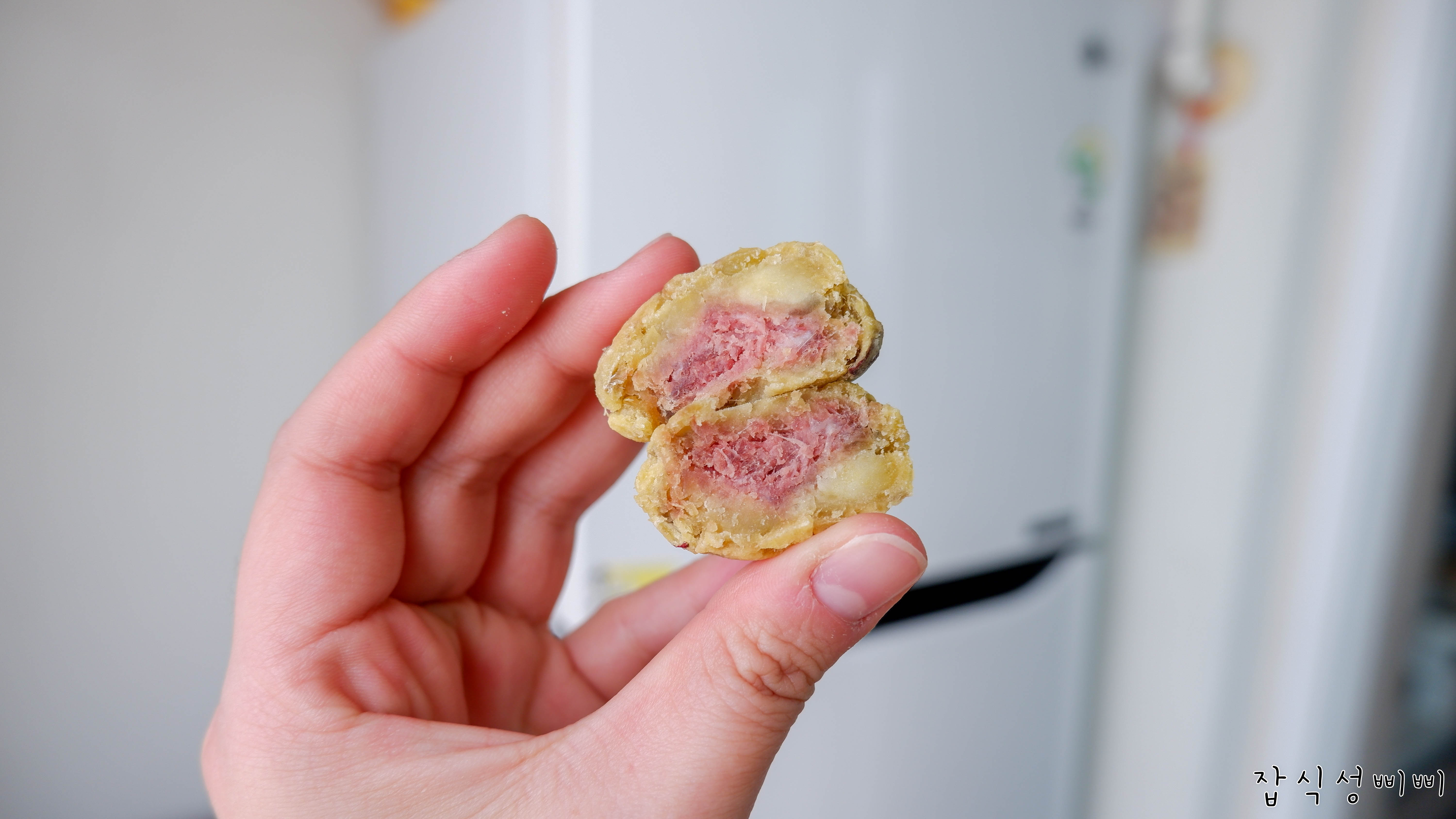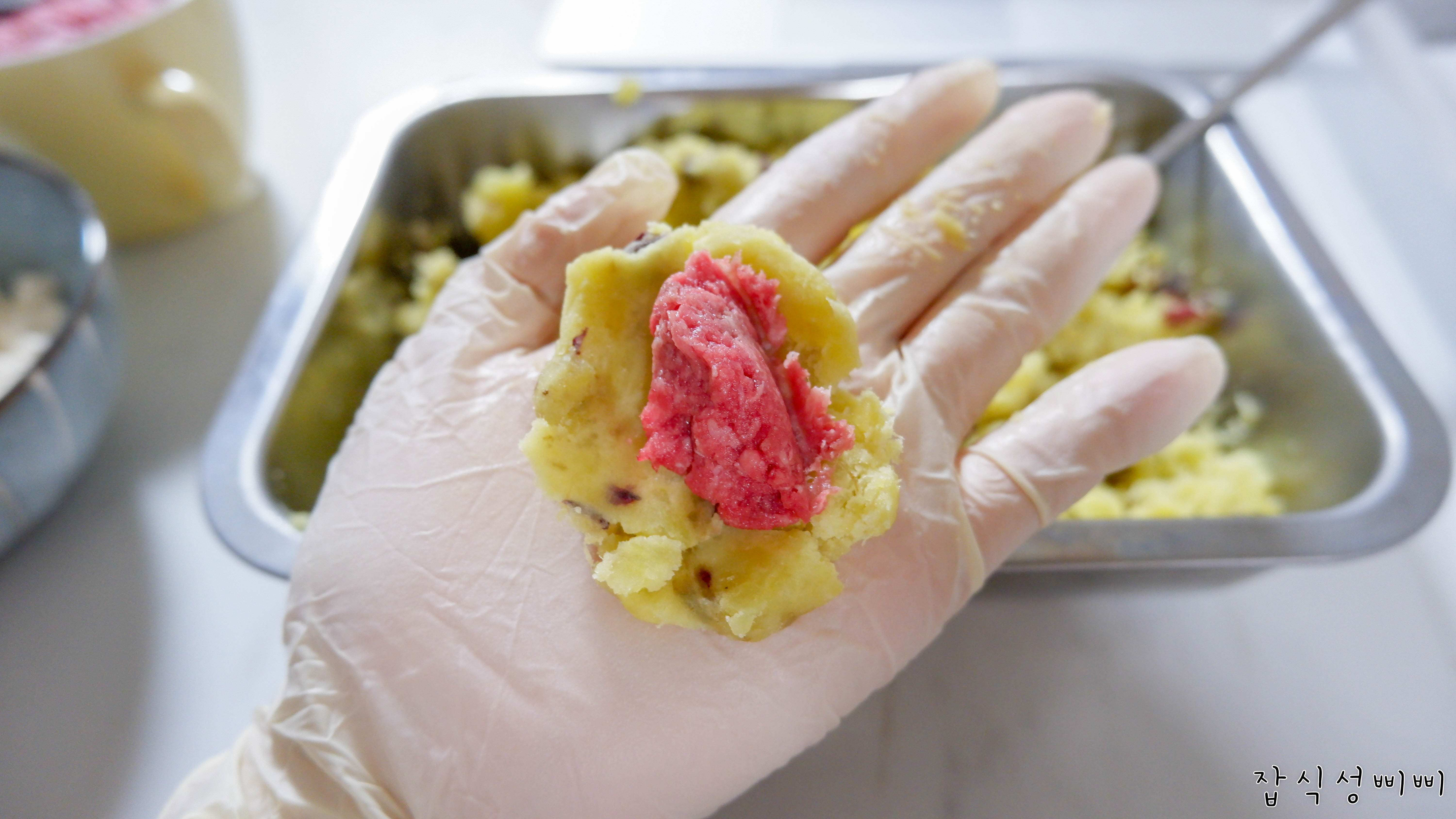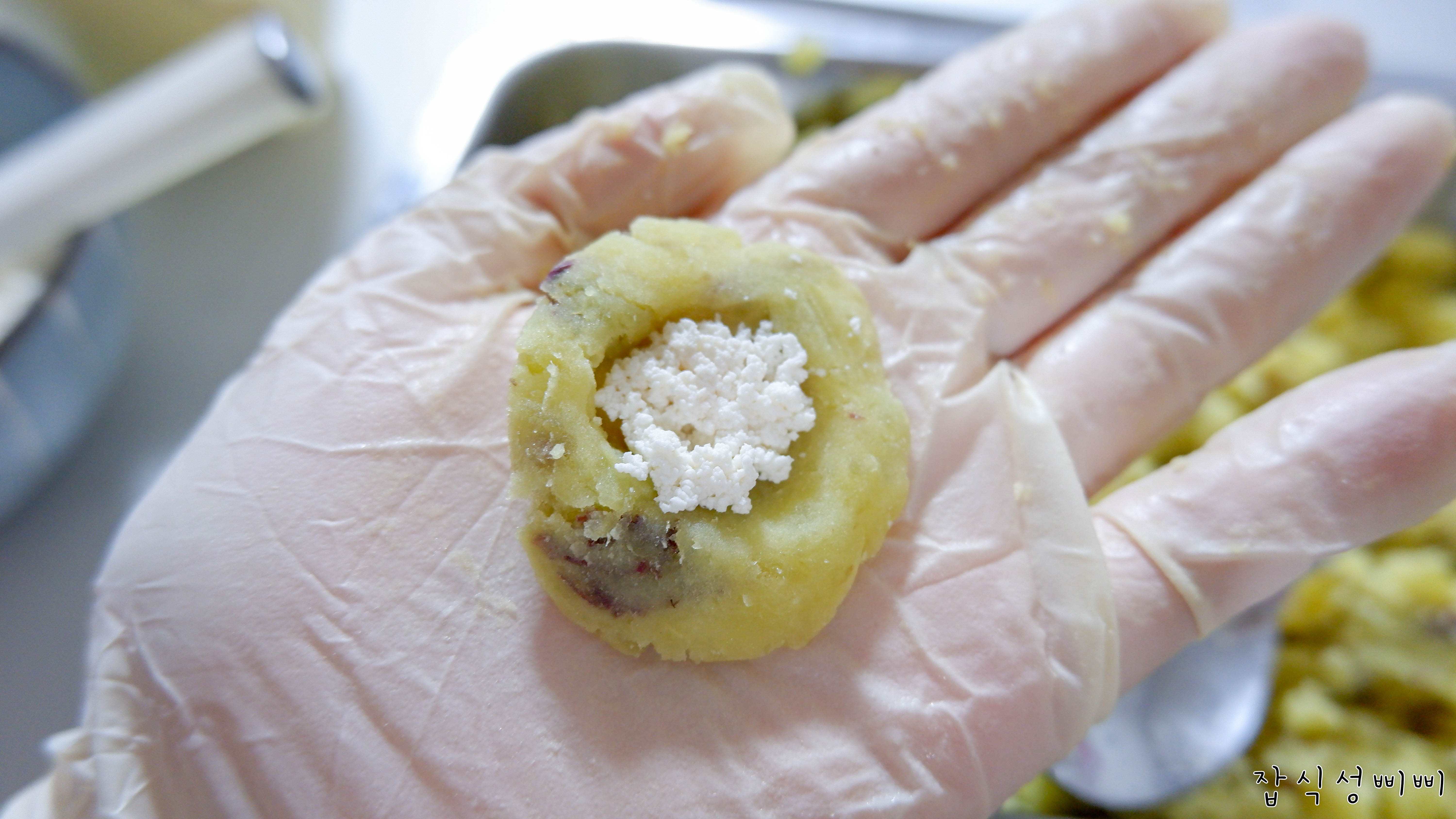 고구마 반죽 속에 소고기와 치즈를 넣어서 모양을 잡아주세요.
