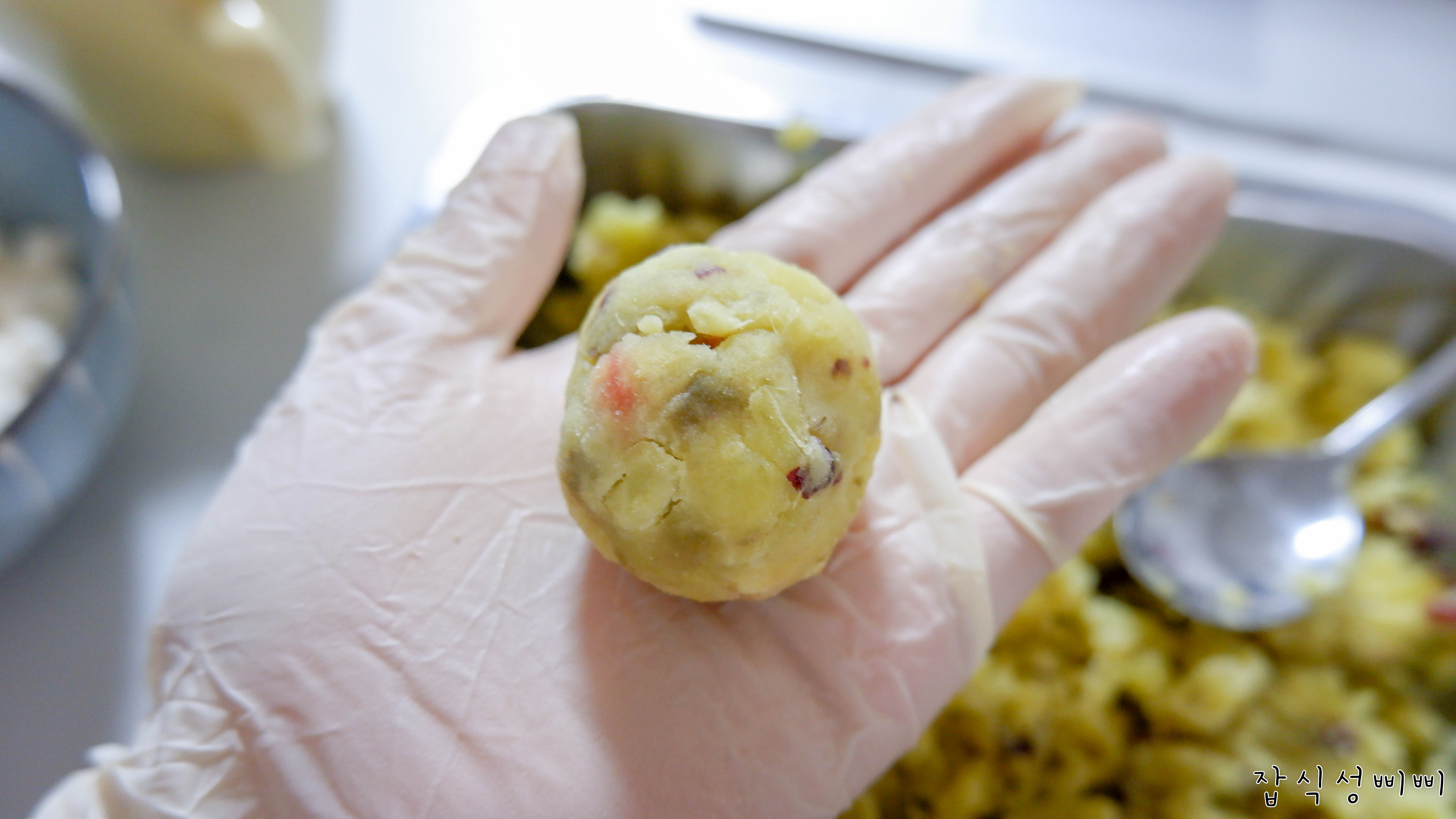 동그란 완자 속에 고기와 치즈가 쏙 들어가있는 완자를 만들거에요. 그런데 고구마로 겉 반죽을 만들기가 힘드네요.