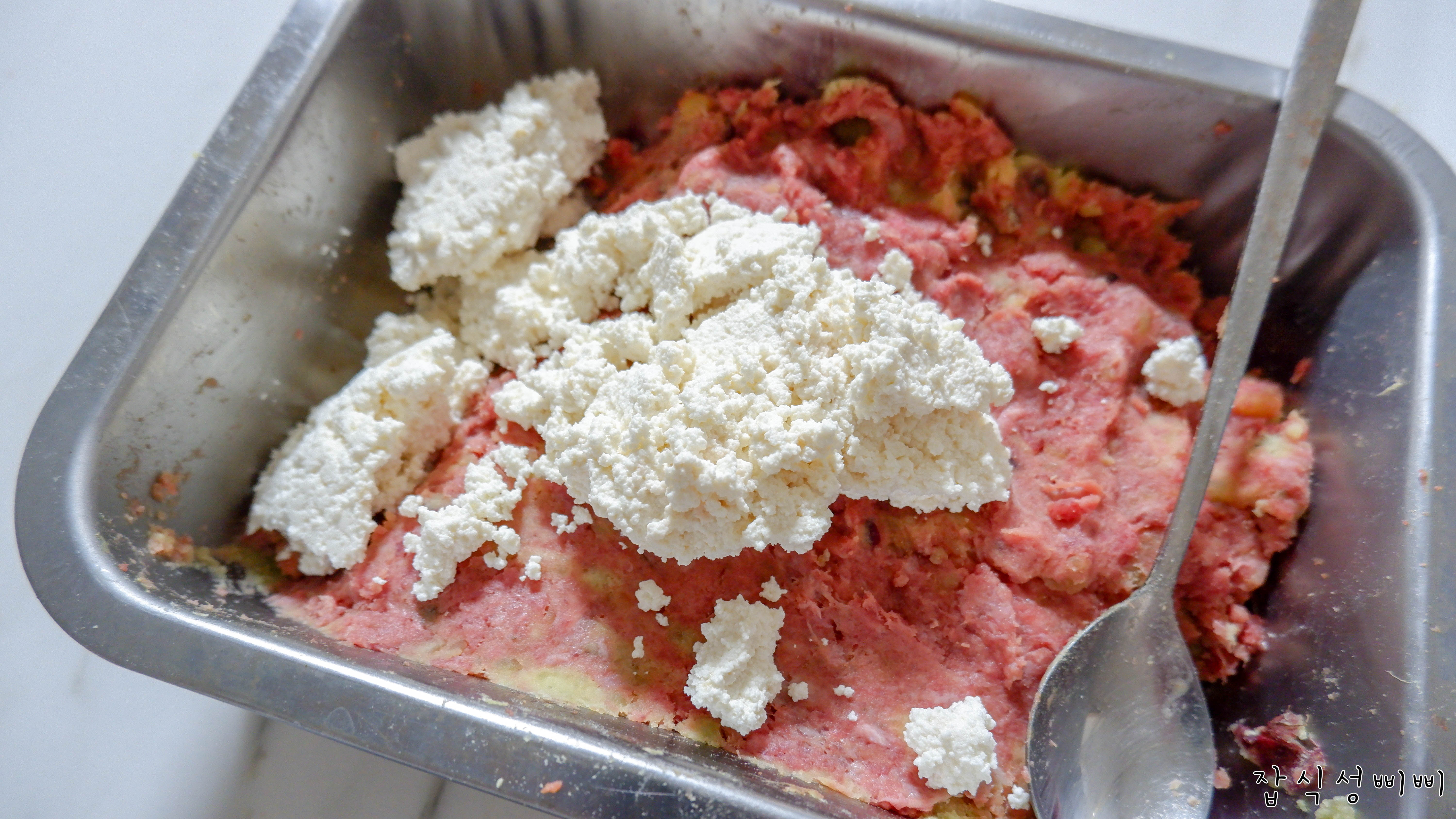 쌀가루를 섞었더니 얼마나 편하게요? ㅋㅋ 반죽 속에는 치즈와 고기를 쏙쏙 넣어주었어요.