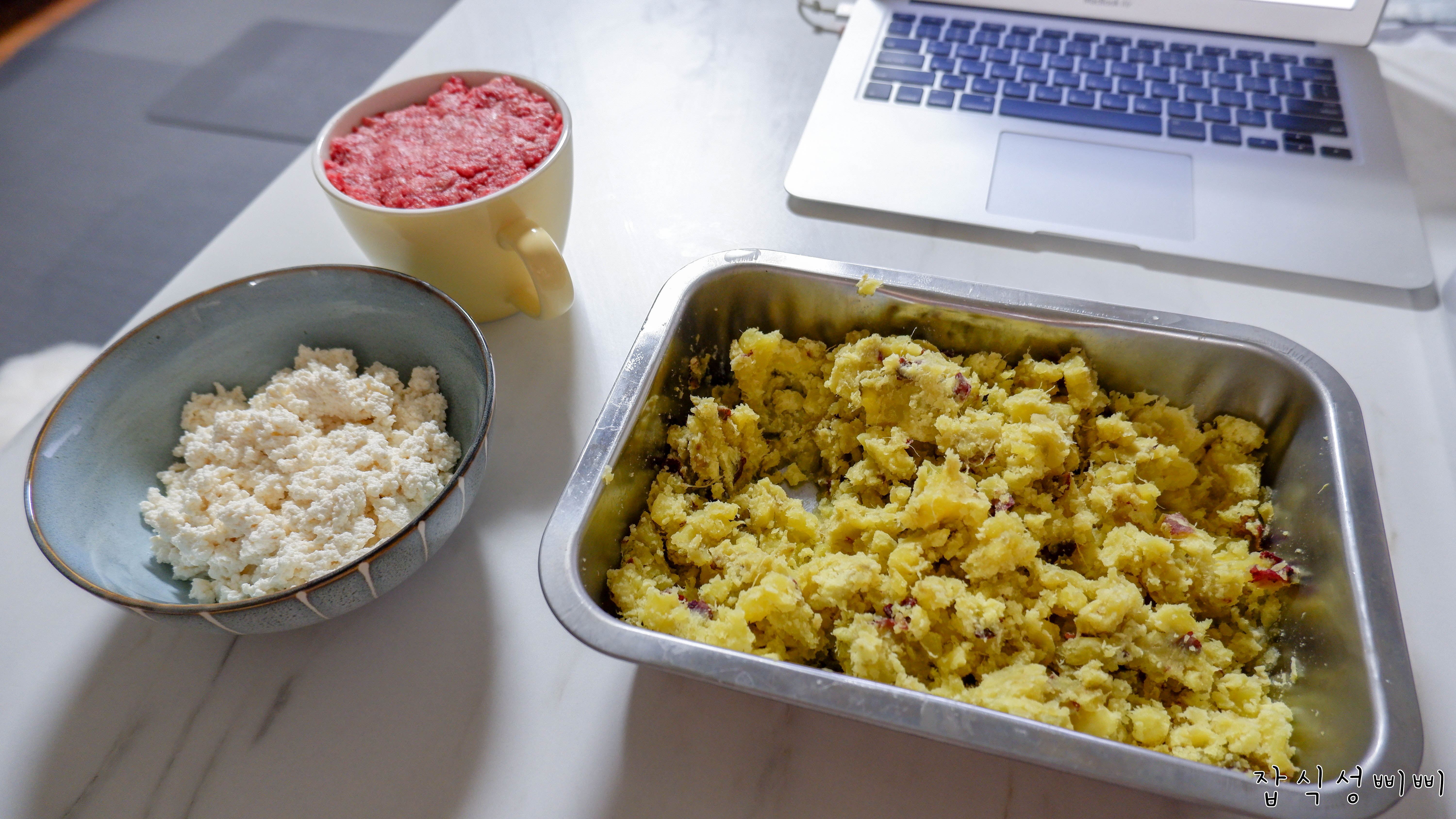 차례대로 소고기 분쇄육과 무염 치즈, 그리고 고구마 으깬걸 사용했어요!