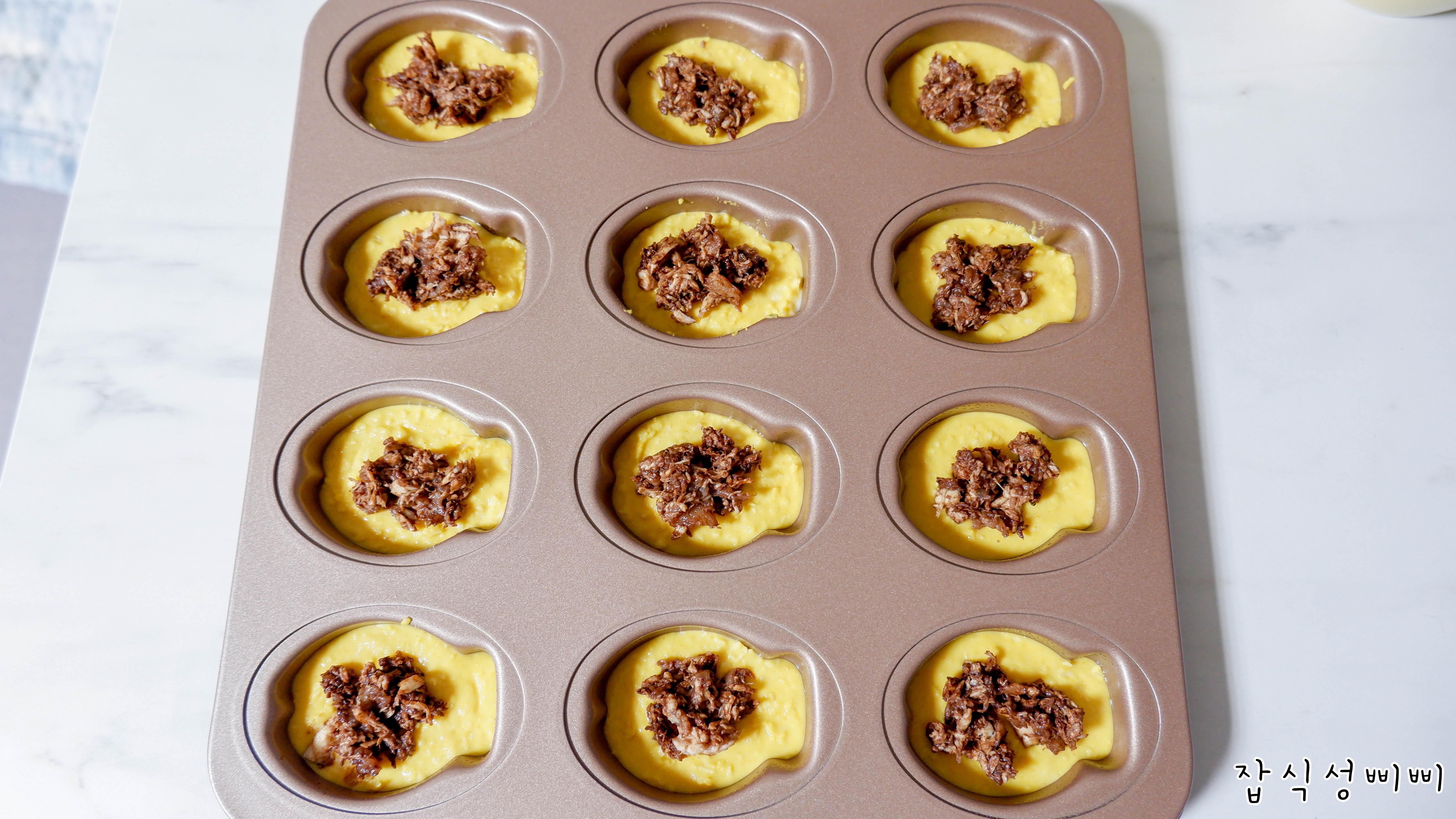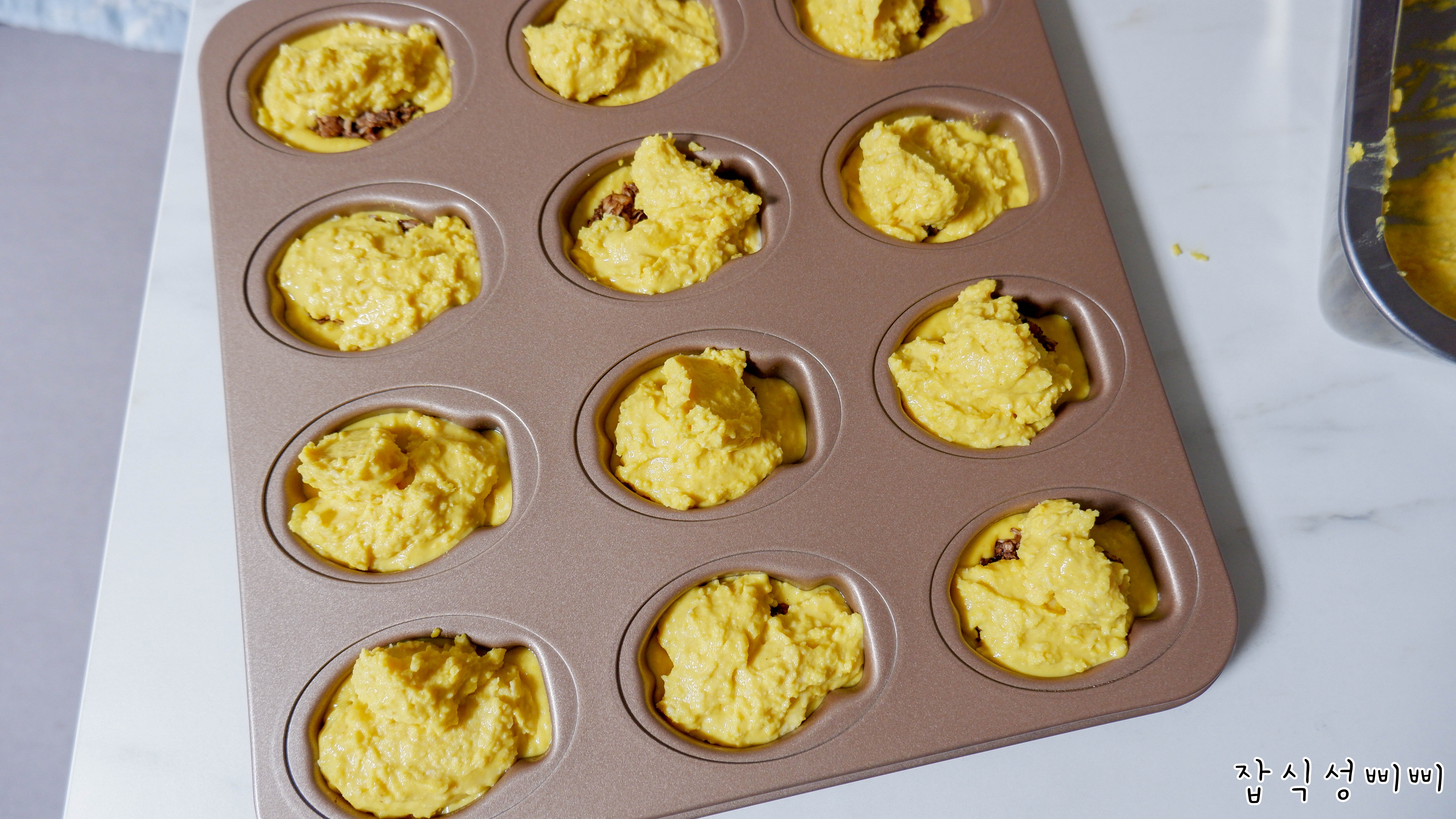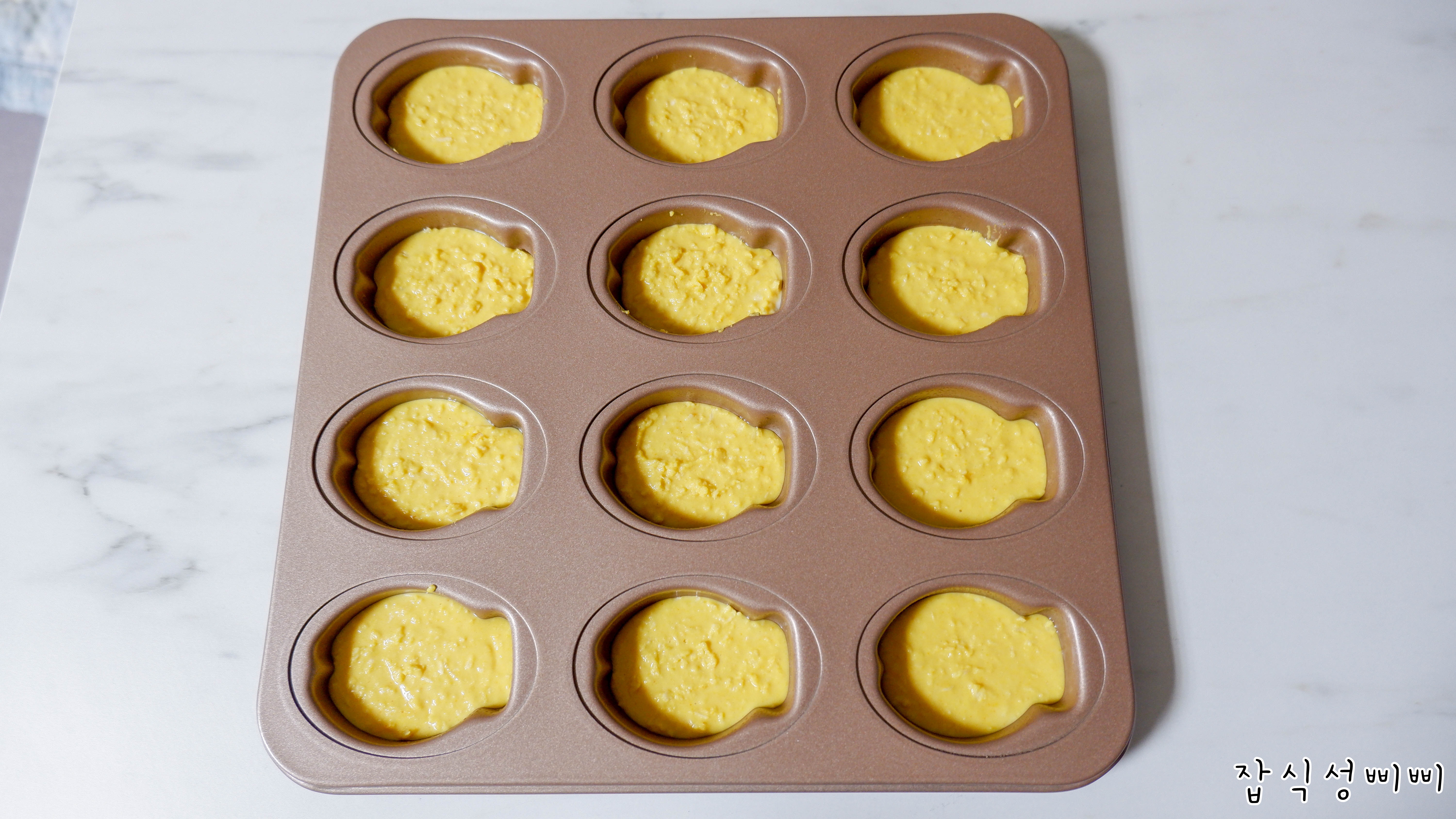 이렇게 되면 완성! 오븐에서 구워지면 살짝 올라오기 때문에 8~90%만 채운다는 생각으로 해주심 좋아요.