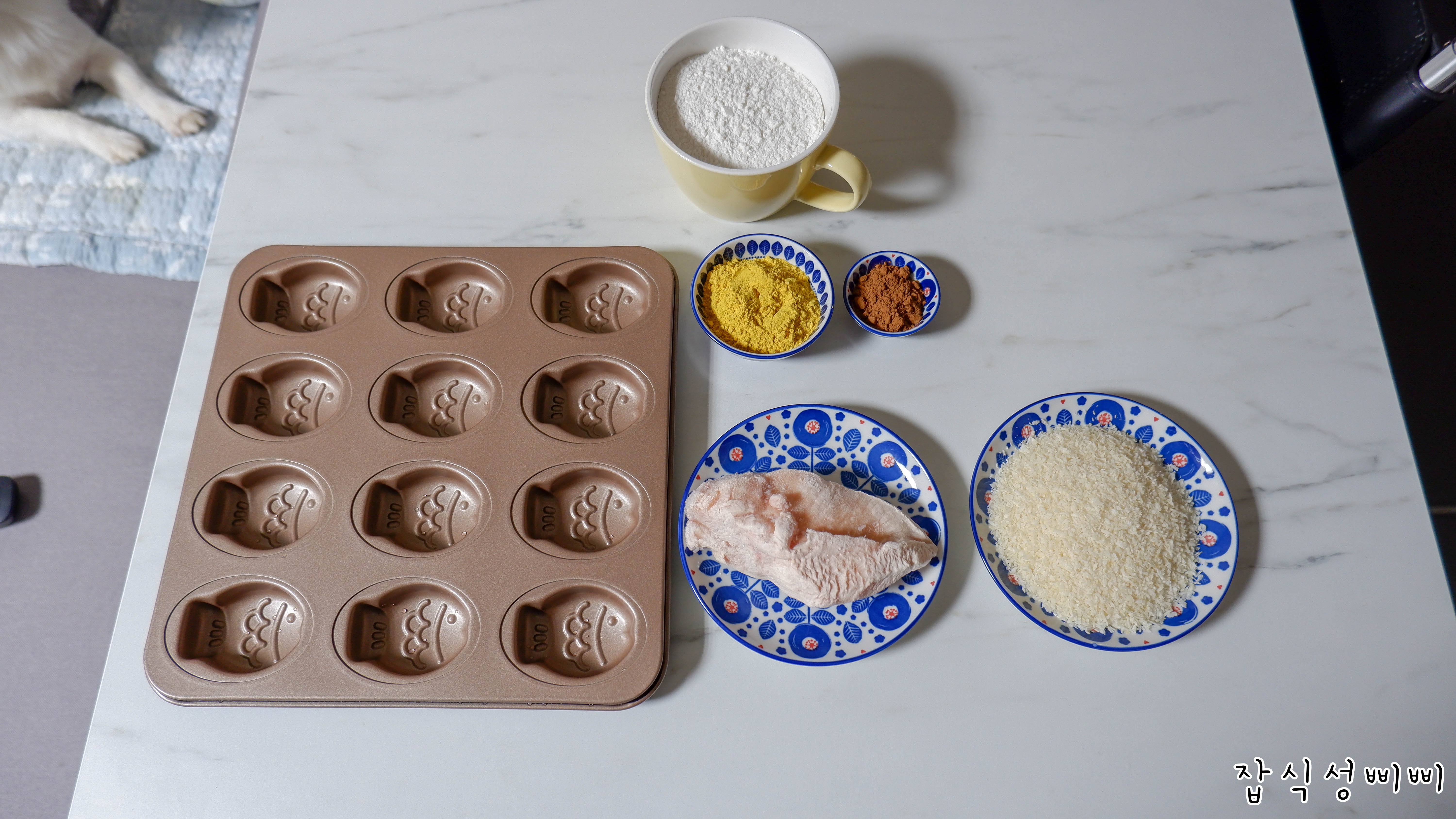 ✔ 재료 : 붕어빵몰드, 쌀가루, 단호박가루, 캐롭파우더, 닭가슴살, 코코넛가루, 계란, 강아지용 우유(또는 물)