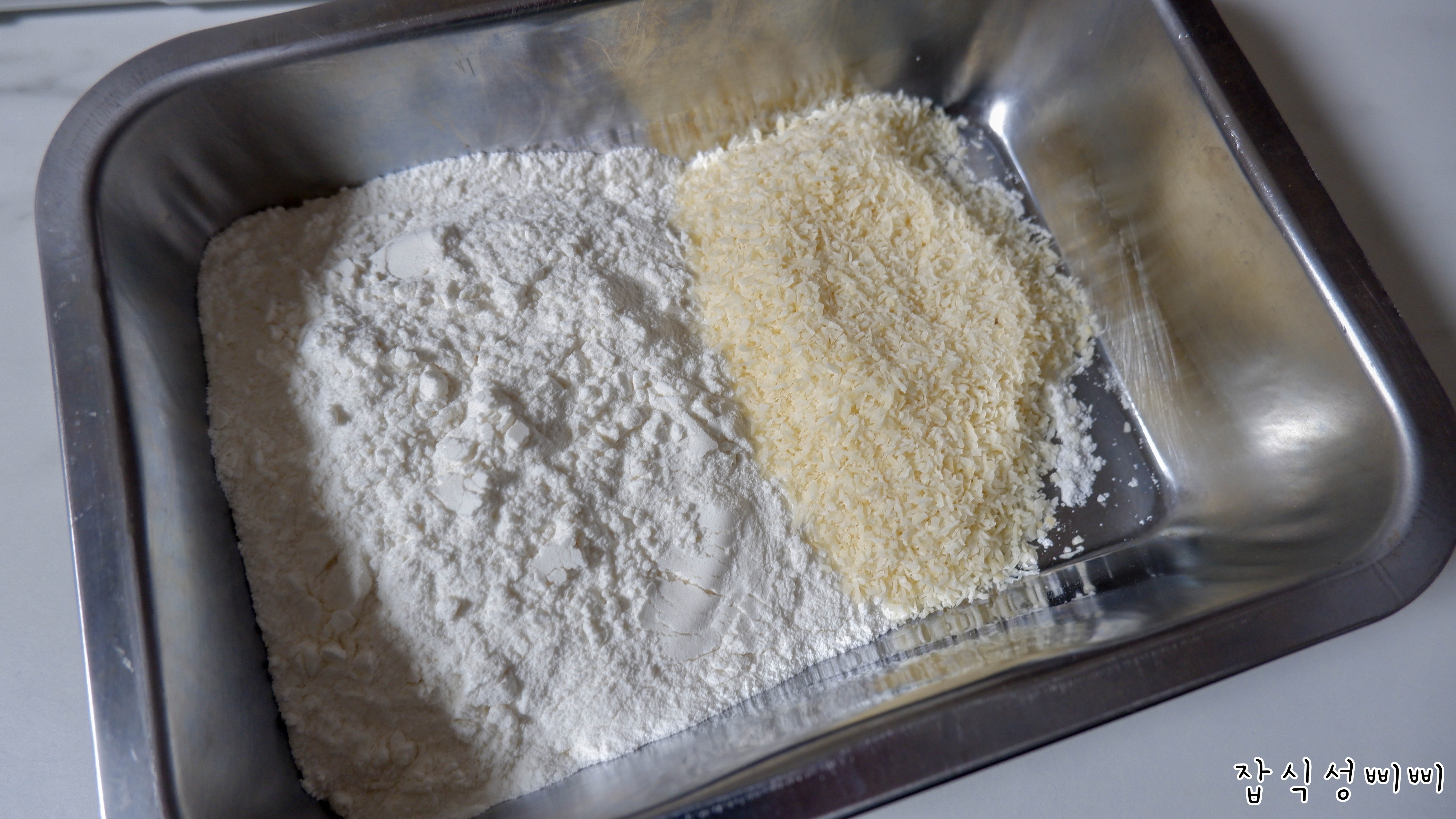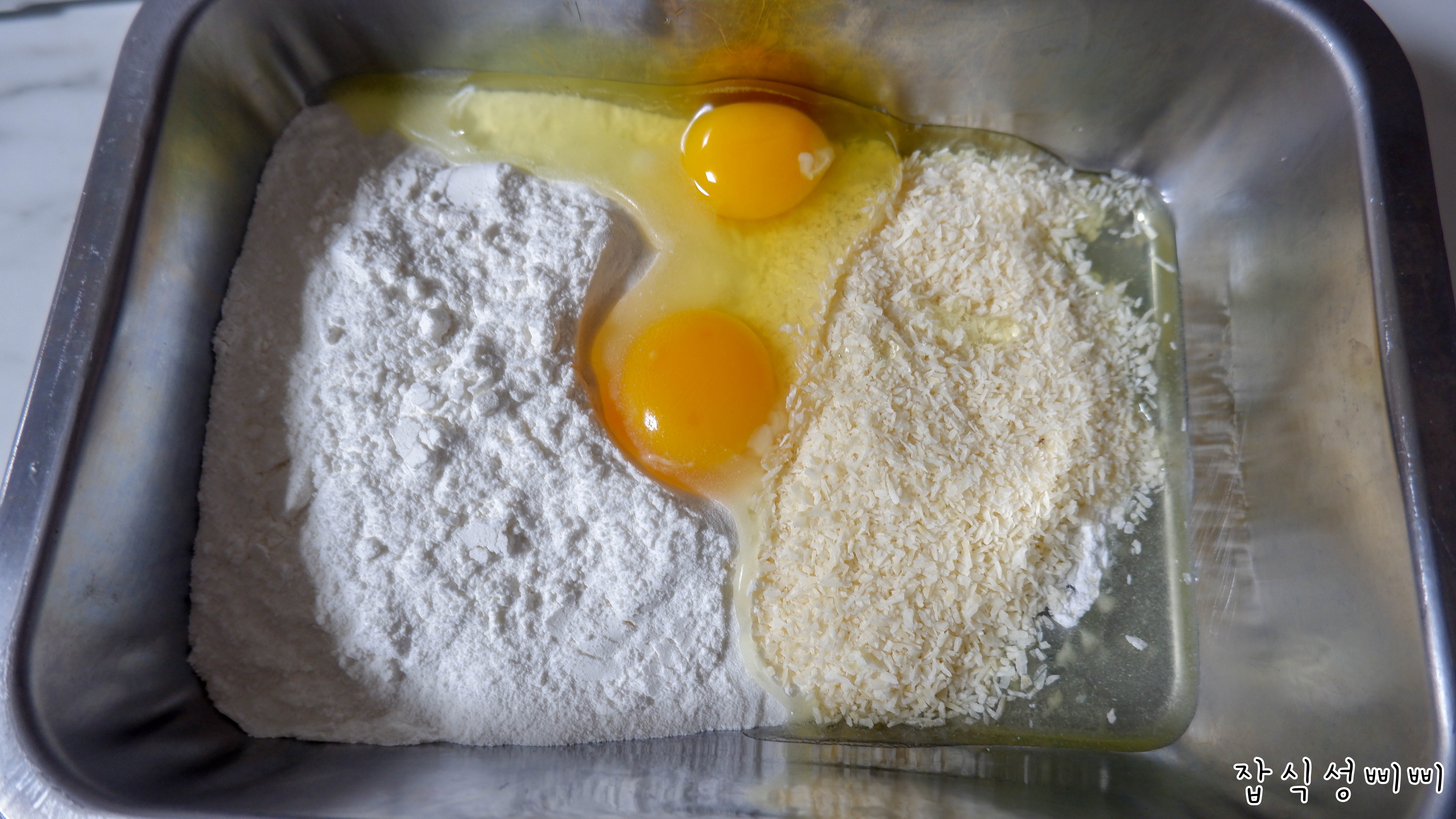 쌀가루와 코코넛 가루를 이용해서 반죽을 만들어줄거에요~