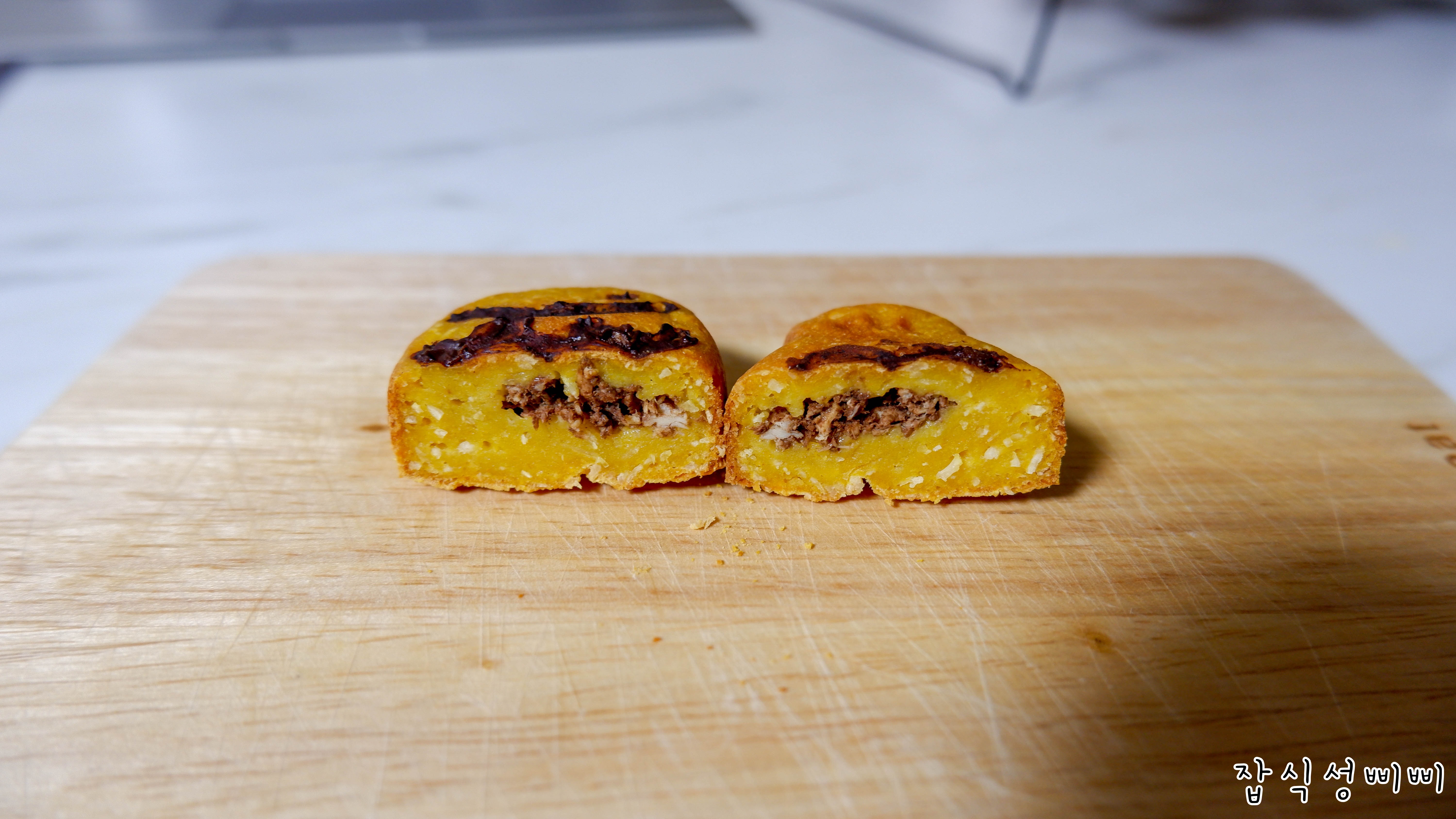 다음에는 조금 더 닭가슴살을 뭉쳐서 앙금을 표현해볼까 해요. 그럼 정말 팥처럼 빡빡하게 들어가있겠죠. ㅎㅎ
