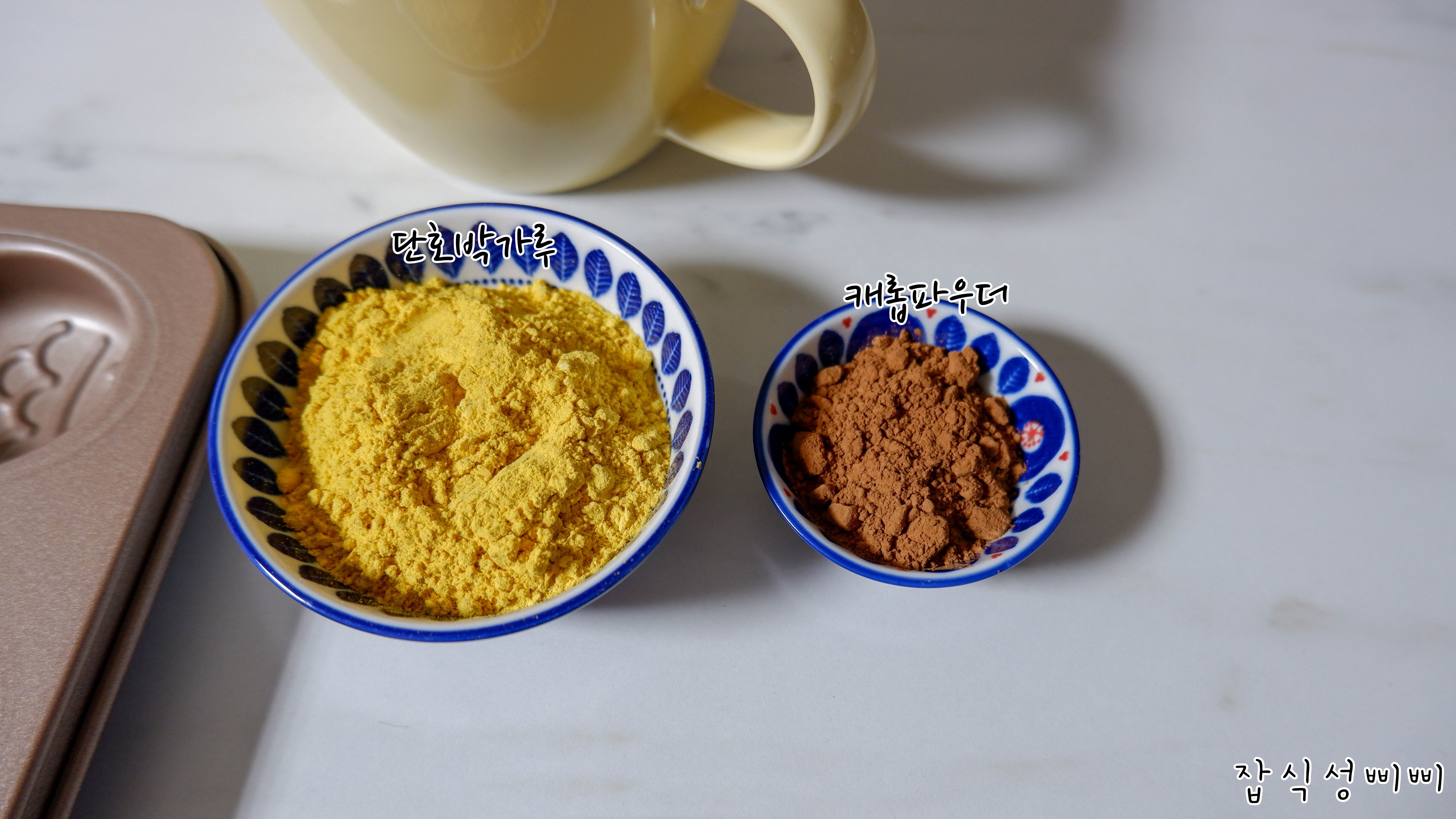 단호박 가루는 필수 재료는 아니랍니다. 붕어빵 반죽에 넣을 재료인데, 노르스름하게 구워진 붕어빵 느낌을 표현하고 싶어서 단호박 가루를 사용했어요.