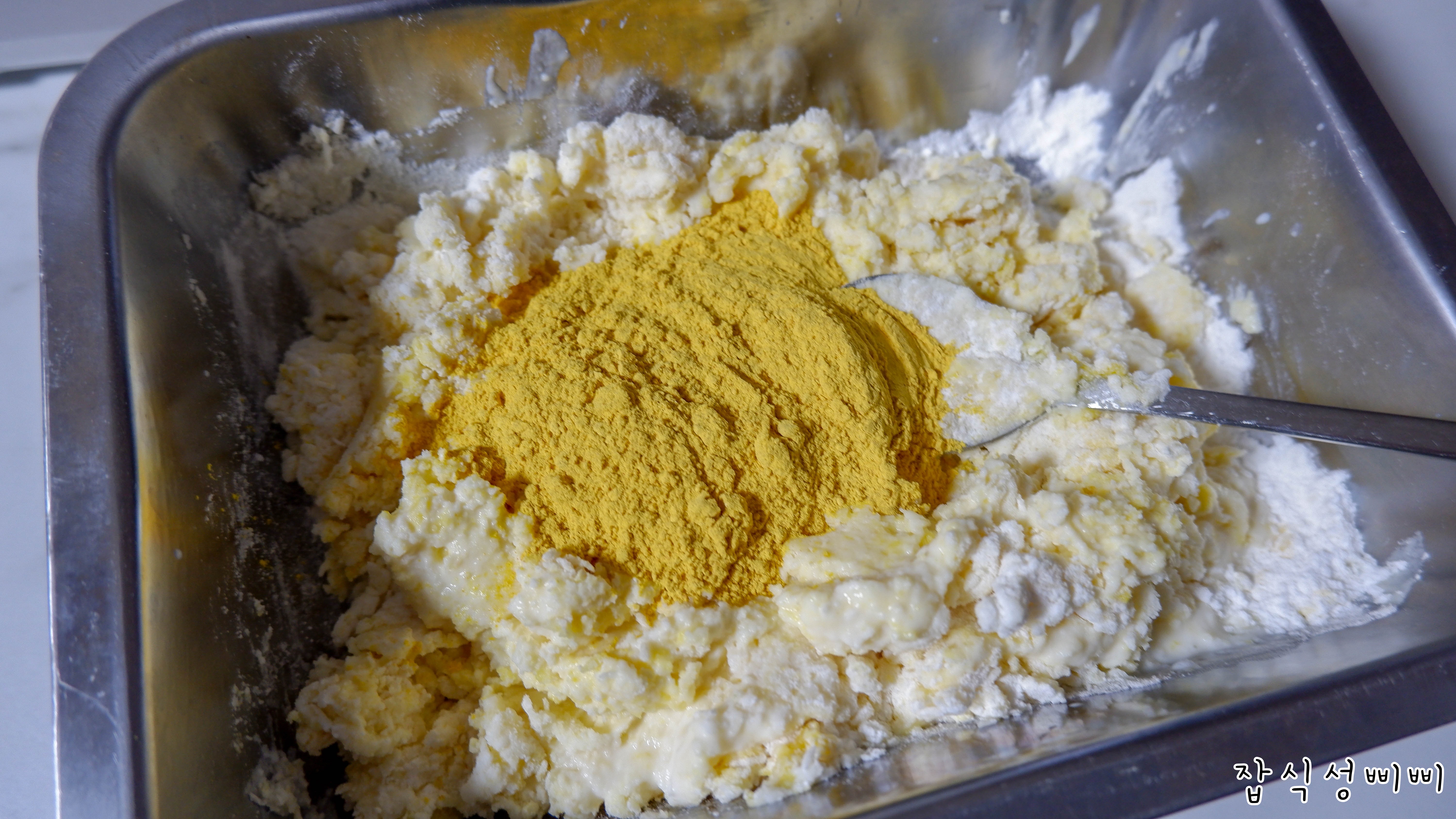 확실히 단호박가루(노란색)을 넣어주니 베이킹 느낌이 확 살더라구요~ 종이컵으로 한 컵 정도 넣어준 것 같습니다.