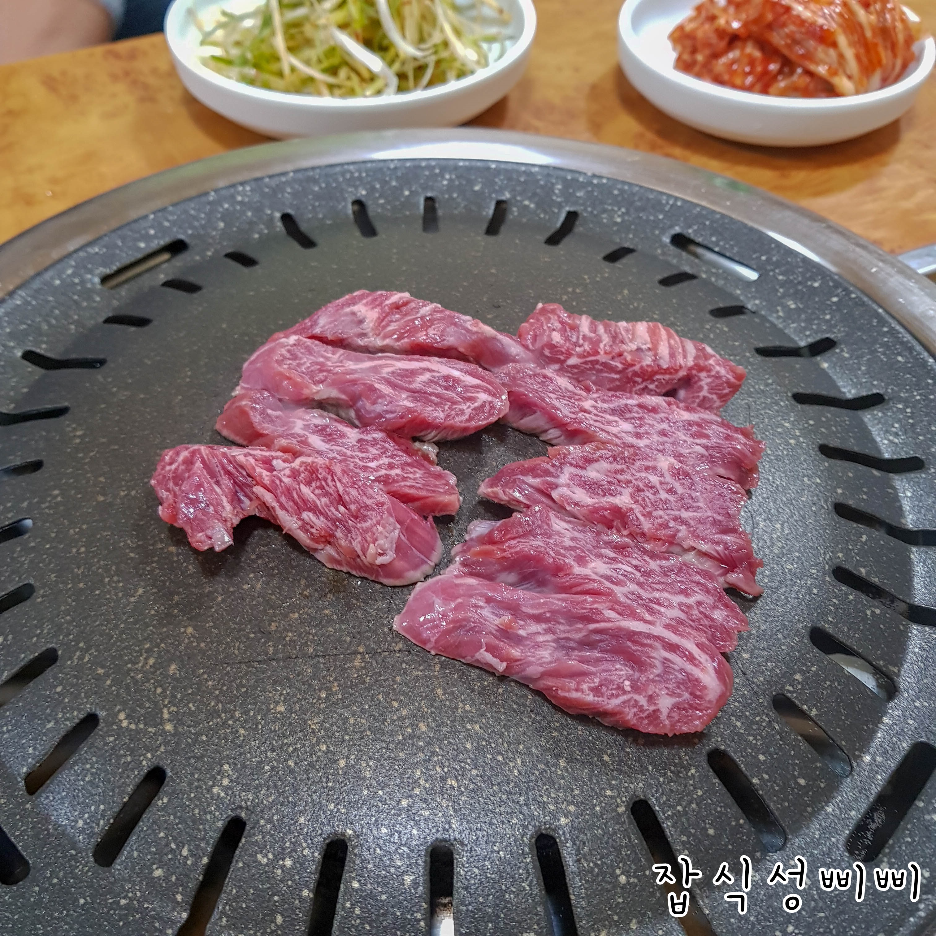 잘 달궈진 고기불판에 소고기를 올려주세용~ 소고기는 개인 기호에 맞게 익혀먹으면 더욱 맛있는! ㅎㅎ