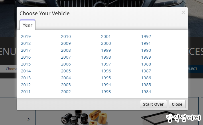 Volvo Parts Webstore의 메인 화면입니다~ 차량 연식을 선택하는 창이 가장 먼저뜨구요.