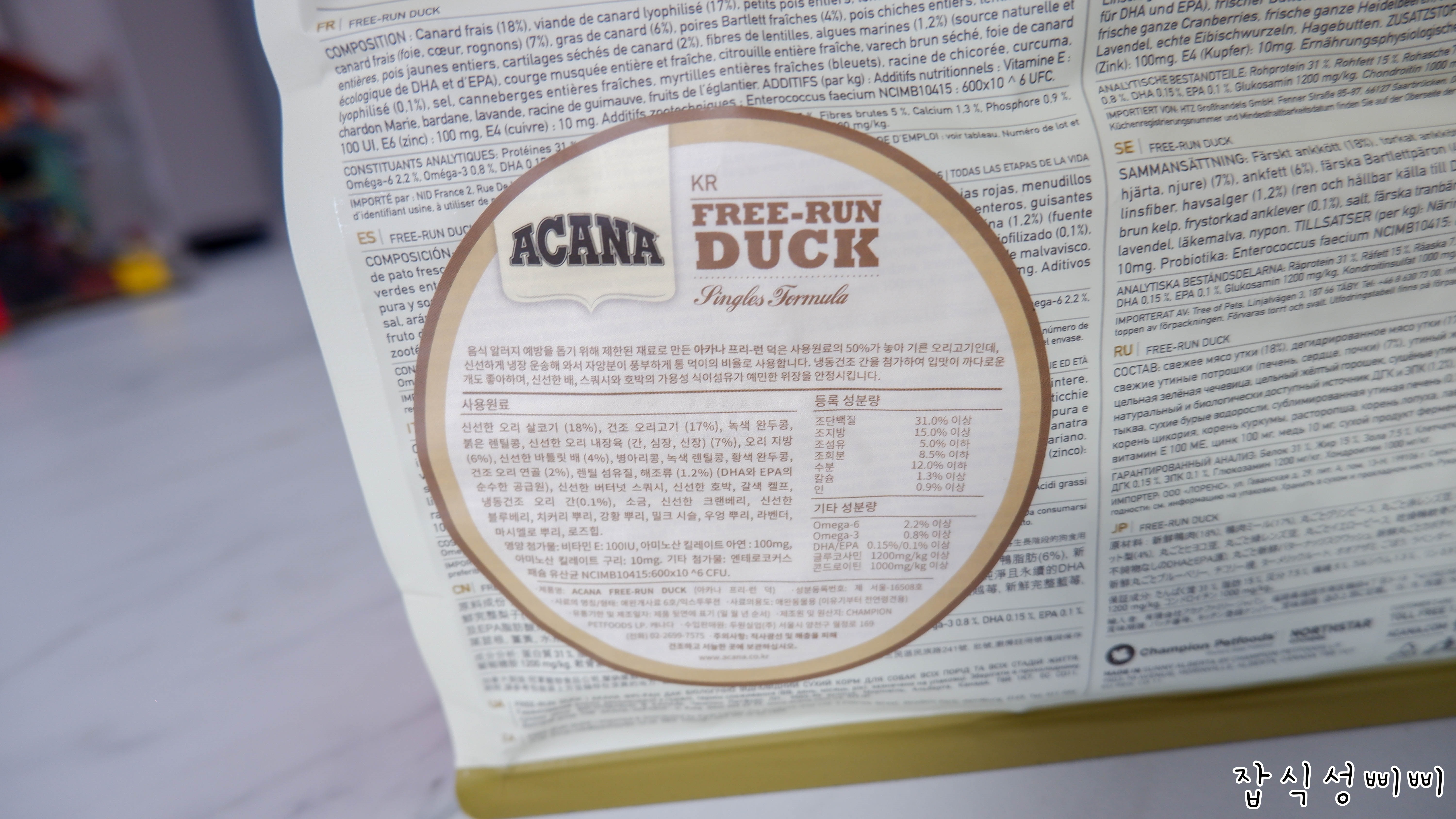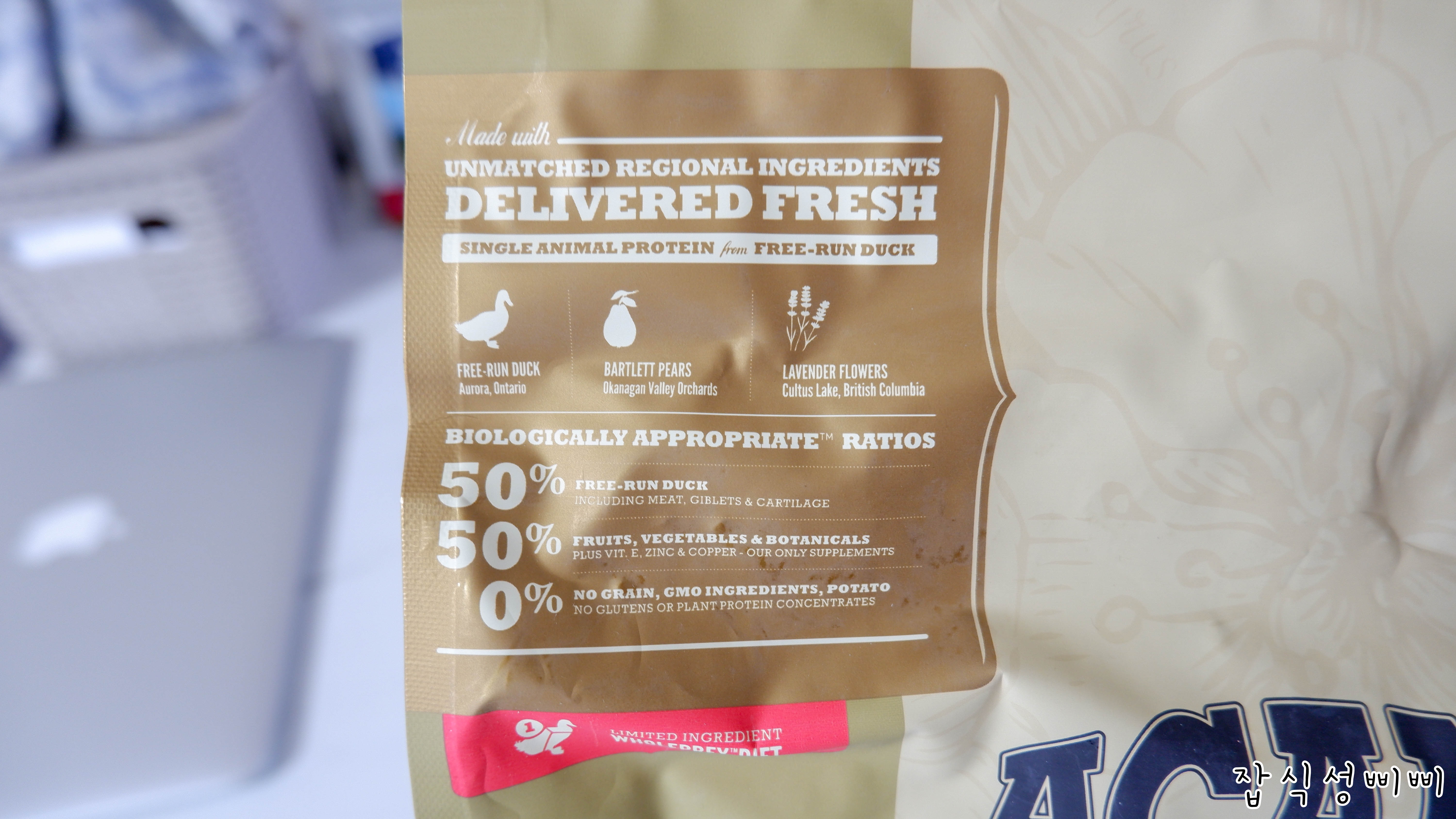 소화를 돕기 위해 신선한 배와 호박을 사용하였고 온타리오 시골에서 풀어놓고 기른 오리고기를 사용해 강아지의 건강과 성장을 도와주는 사료라고 합니다.