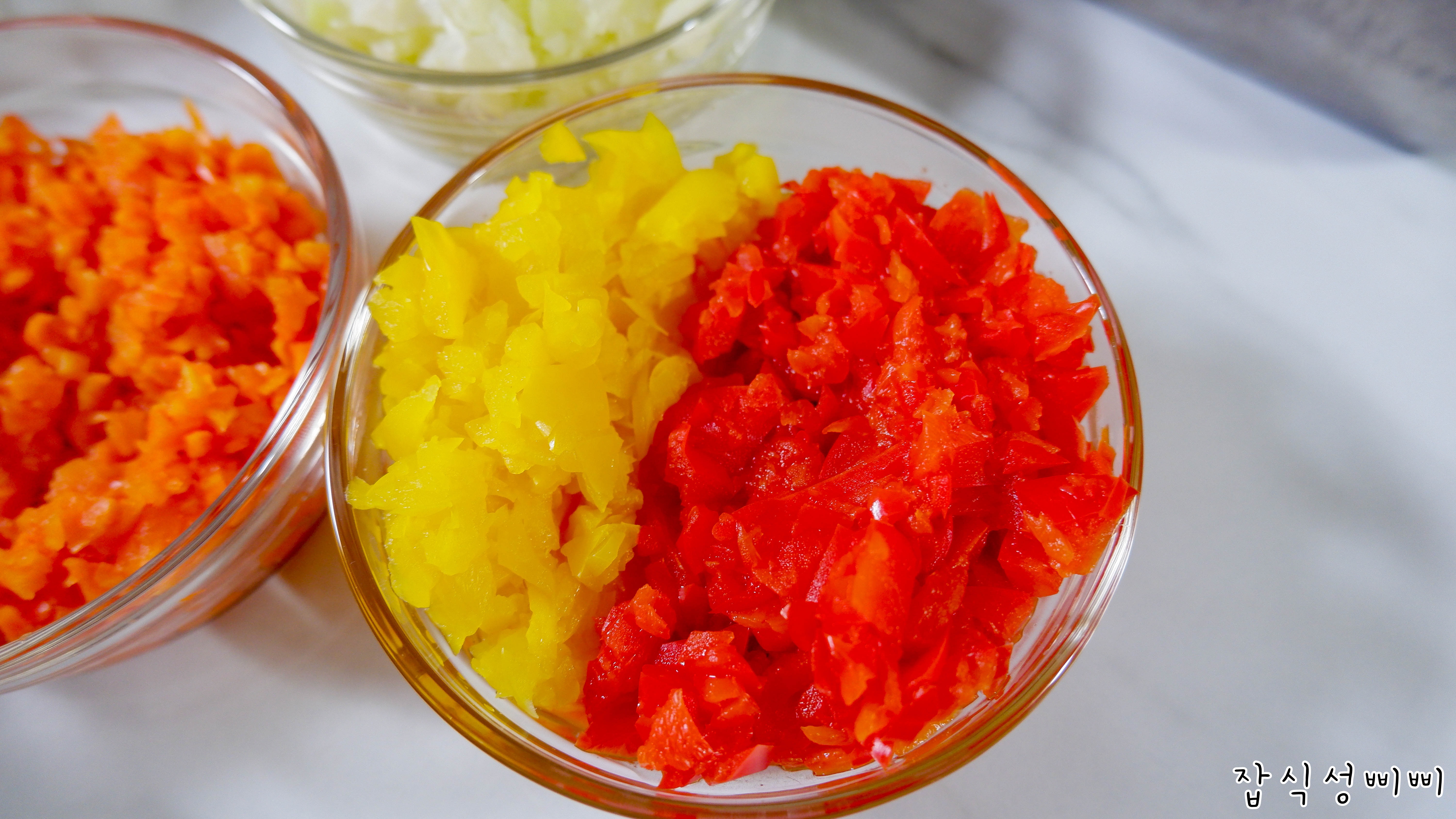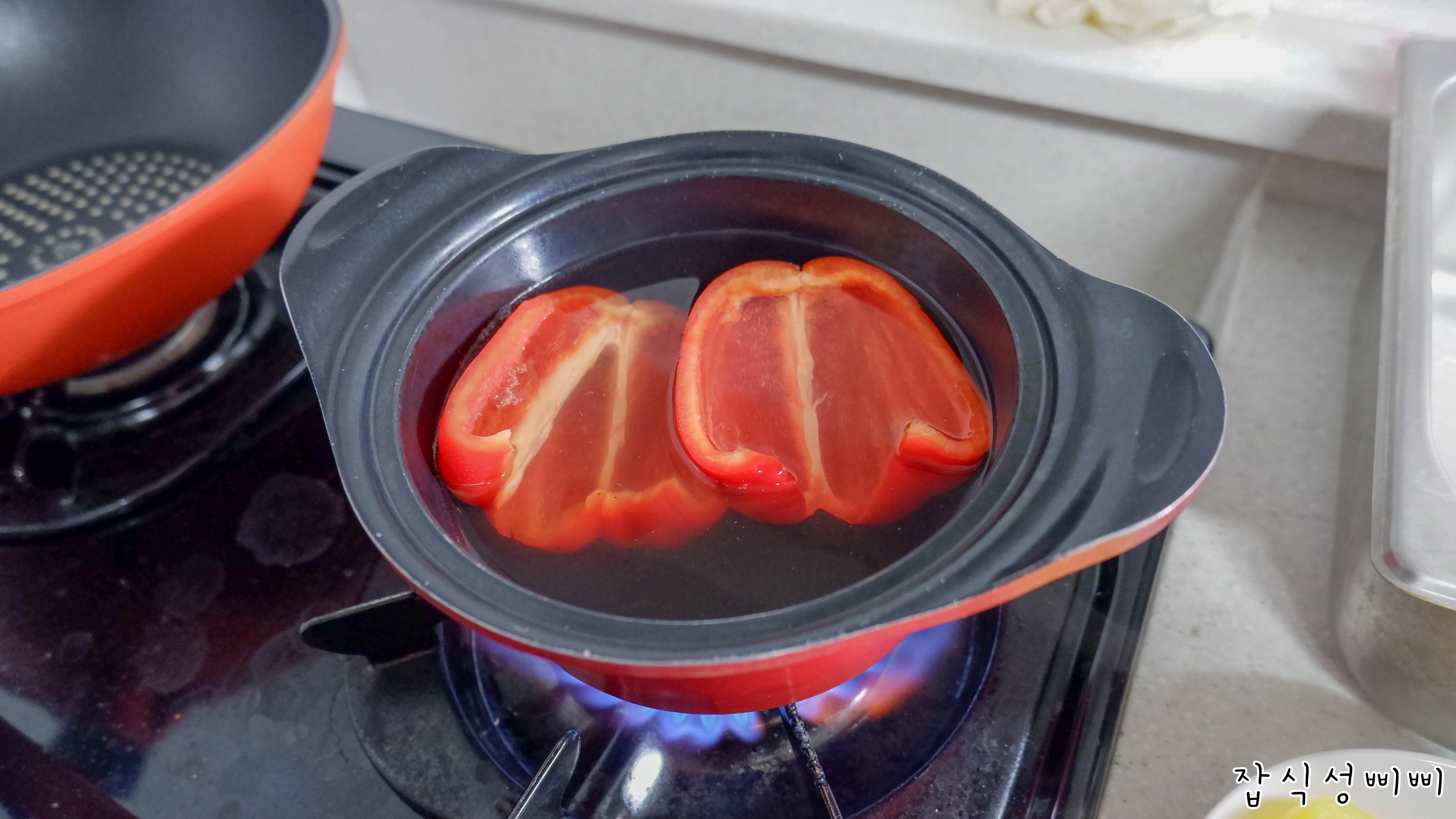 다음은 파프리카인데요~ 파프리카는 안에 씨앗을 모두 빼고 손질해서 끓는물에 데쳐주었어요.