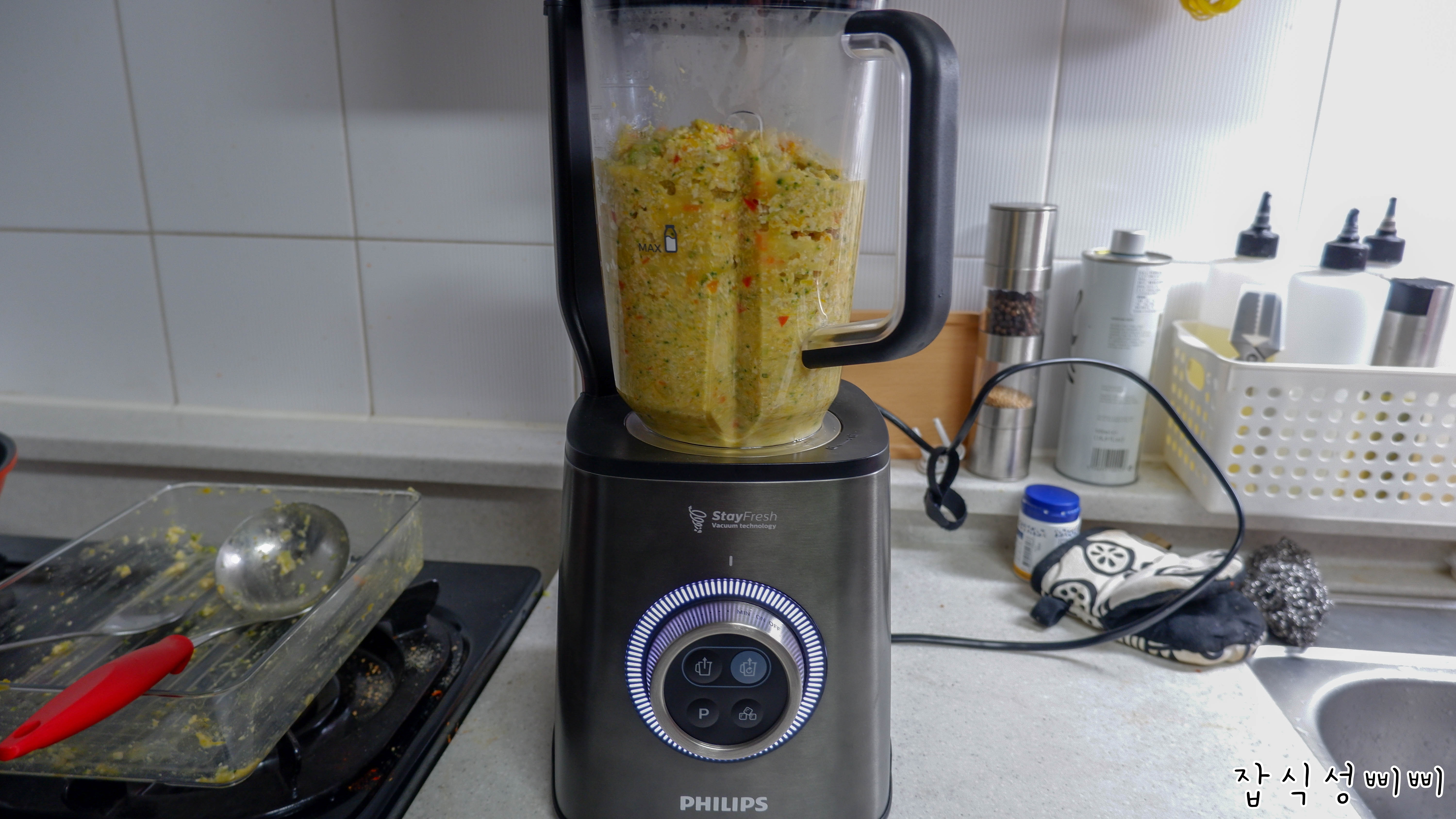 가장 양이 많았던 믹스퓨레부터 필립스 믹서기를 이용해 갈아주었어요.
