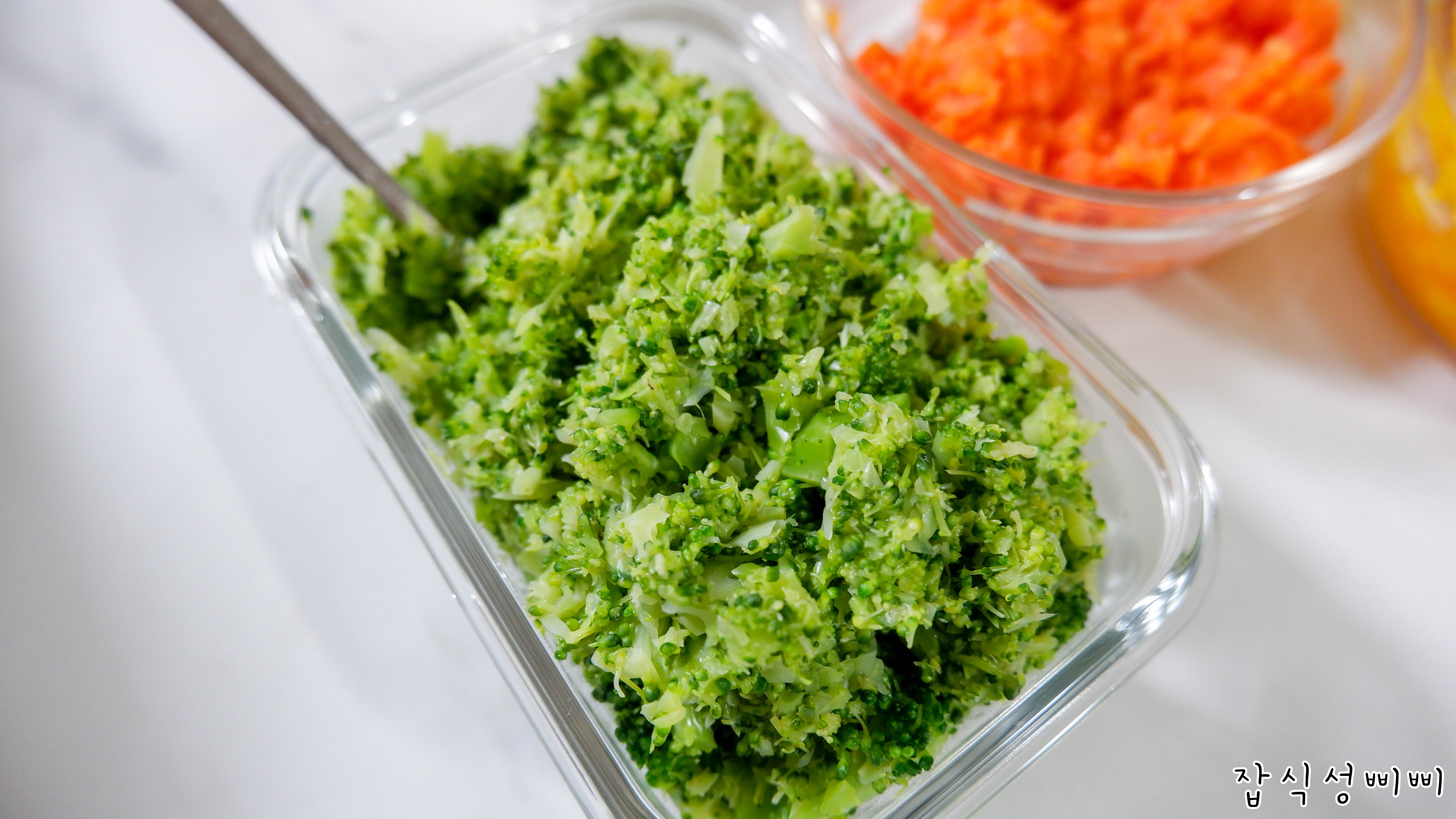 당근은 이유식용으로 다져서 나온 당근과 통으로 썰어져 나온 당근을 같이 삶아주었어요.