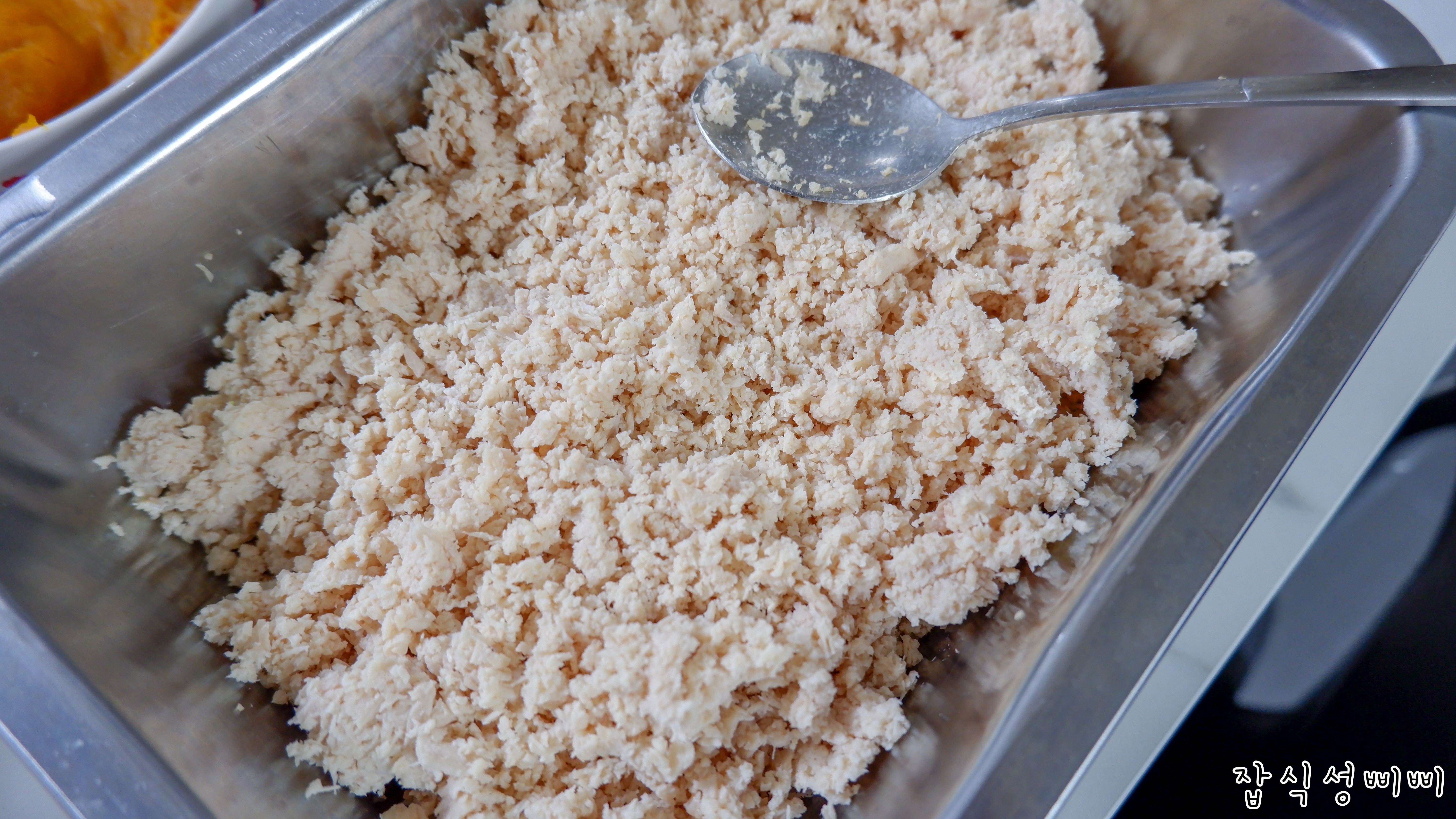 저는 닭고기를 삶고 갈아주었답니다. 여기서 아이들의 알러지, 기호성에 따라 오리고기나 다른 육류를 사용하시면 되겠죠. ㅎㅎ 삐삐도 야매로 만들어서 이것저것 넣어보며 변경하곤 했답니다..ㅋㅋㅋ