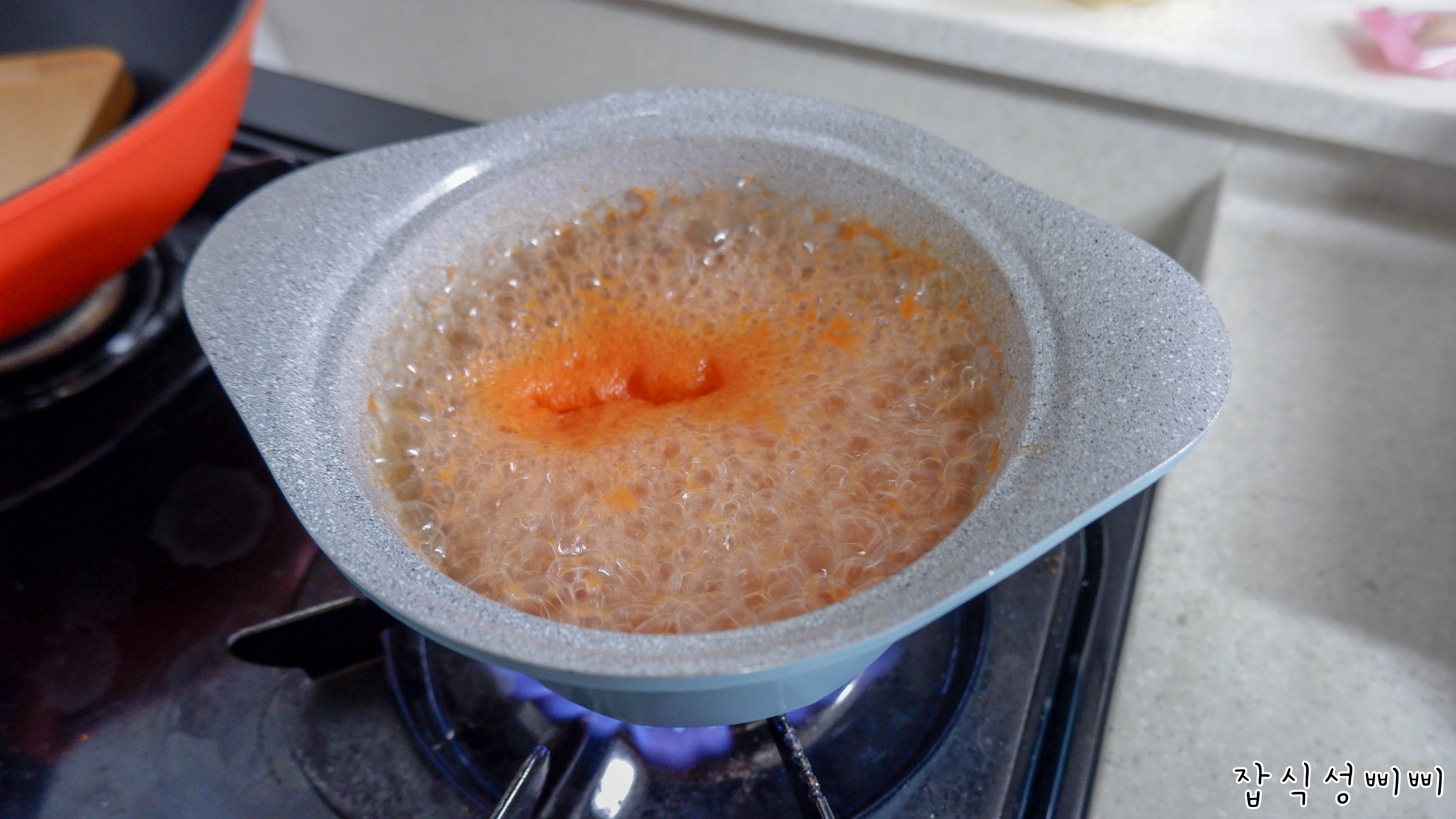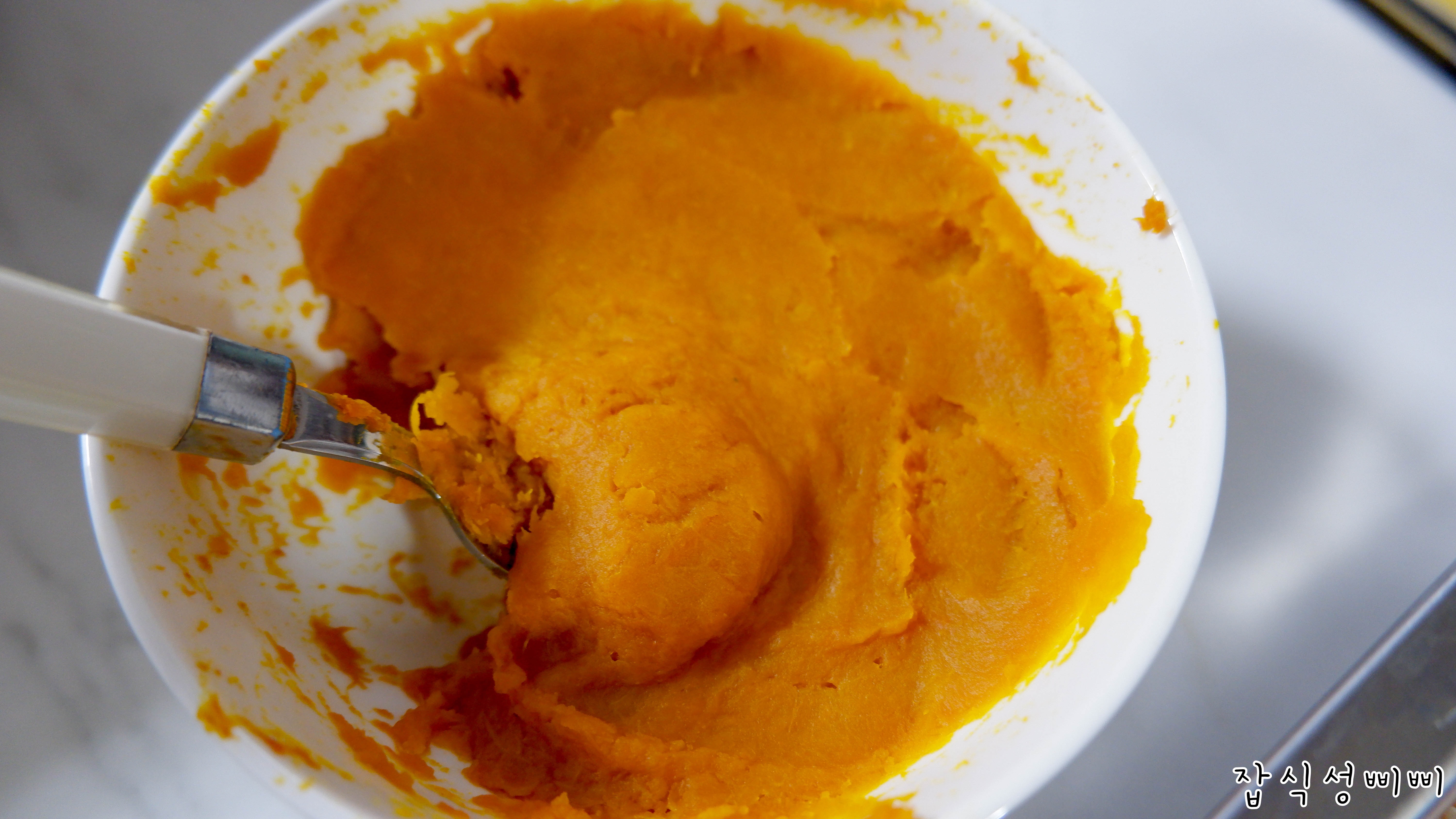 부드럽게 으깨놓은 단호박을 넣어놓고 단호박의 색감과 당근의 색감이 겹쳐서 당근도 추가했어요.