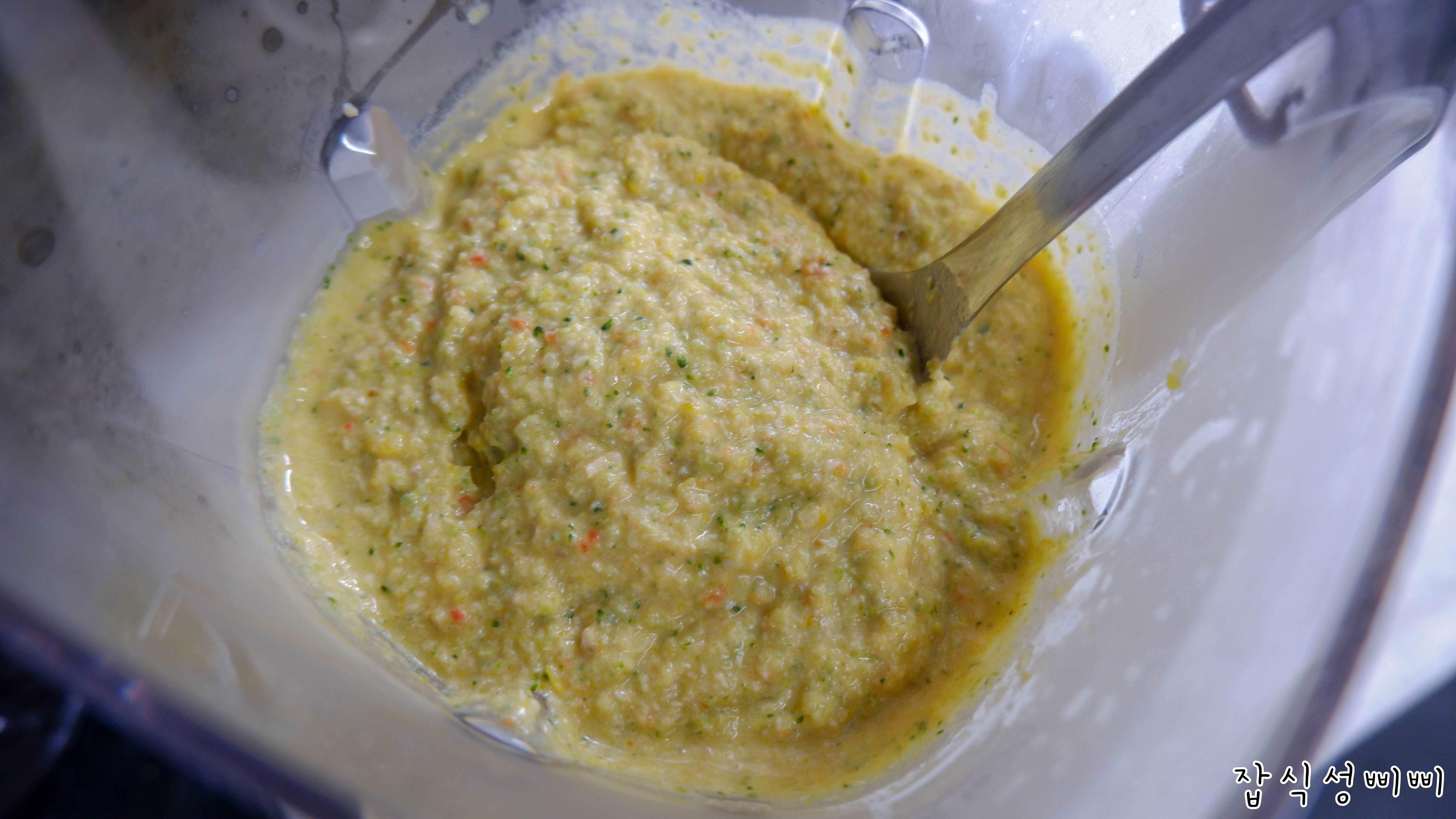 믹서기를 이용해 곱게 갈아주니 이렇게 조금 더 묽어진 모습이에요. 아무래도 채소에 있던 수분이 나온거겠죠.