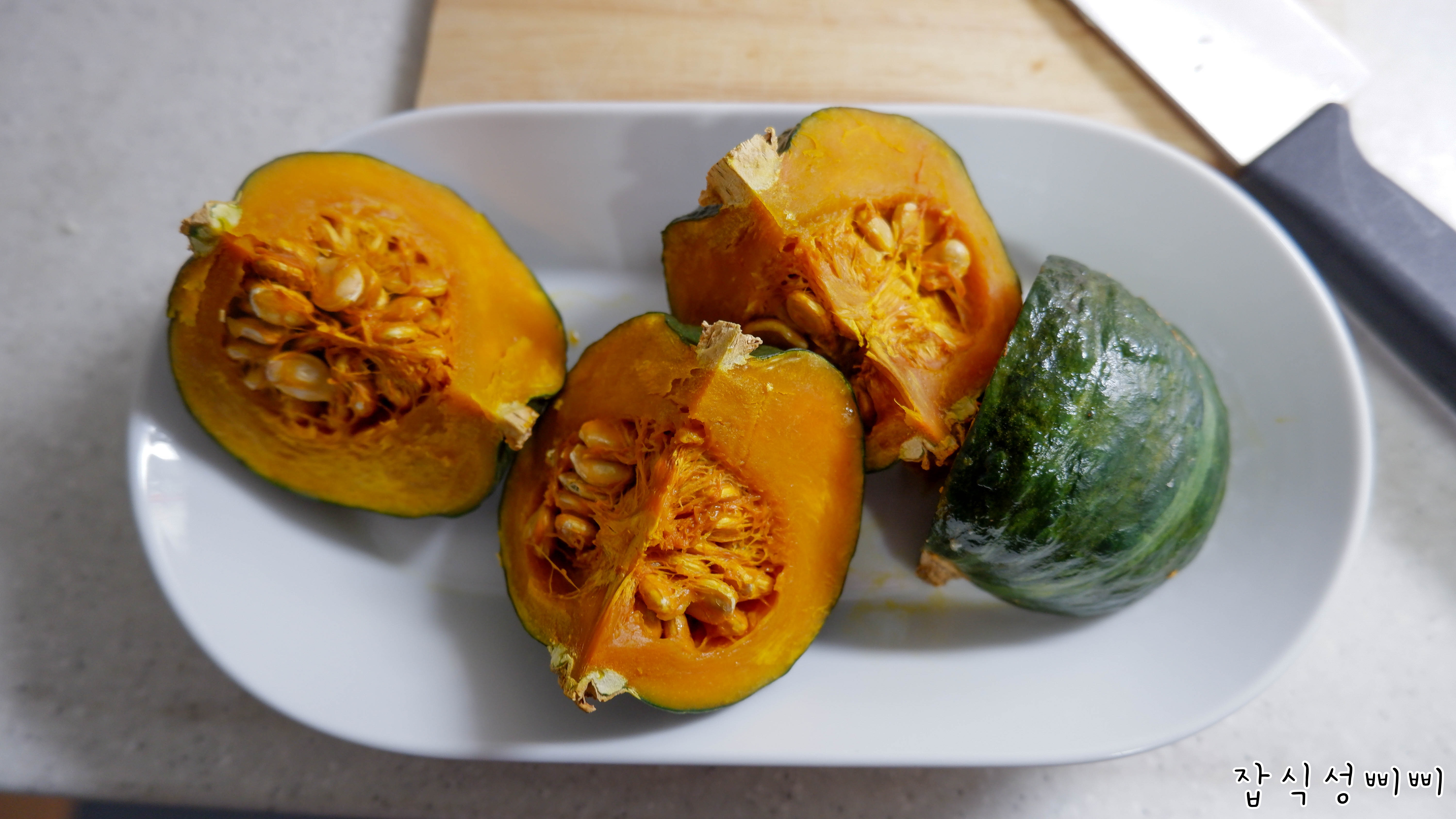 촉촉하게 익은 미니 단호박! 안에 씨는 모두 숟가락으로 파 내었고, 껍질도 버렸어요.