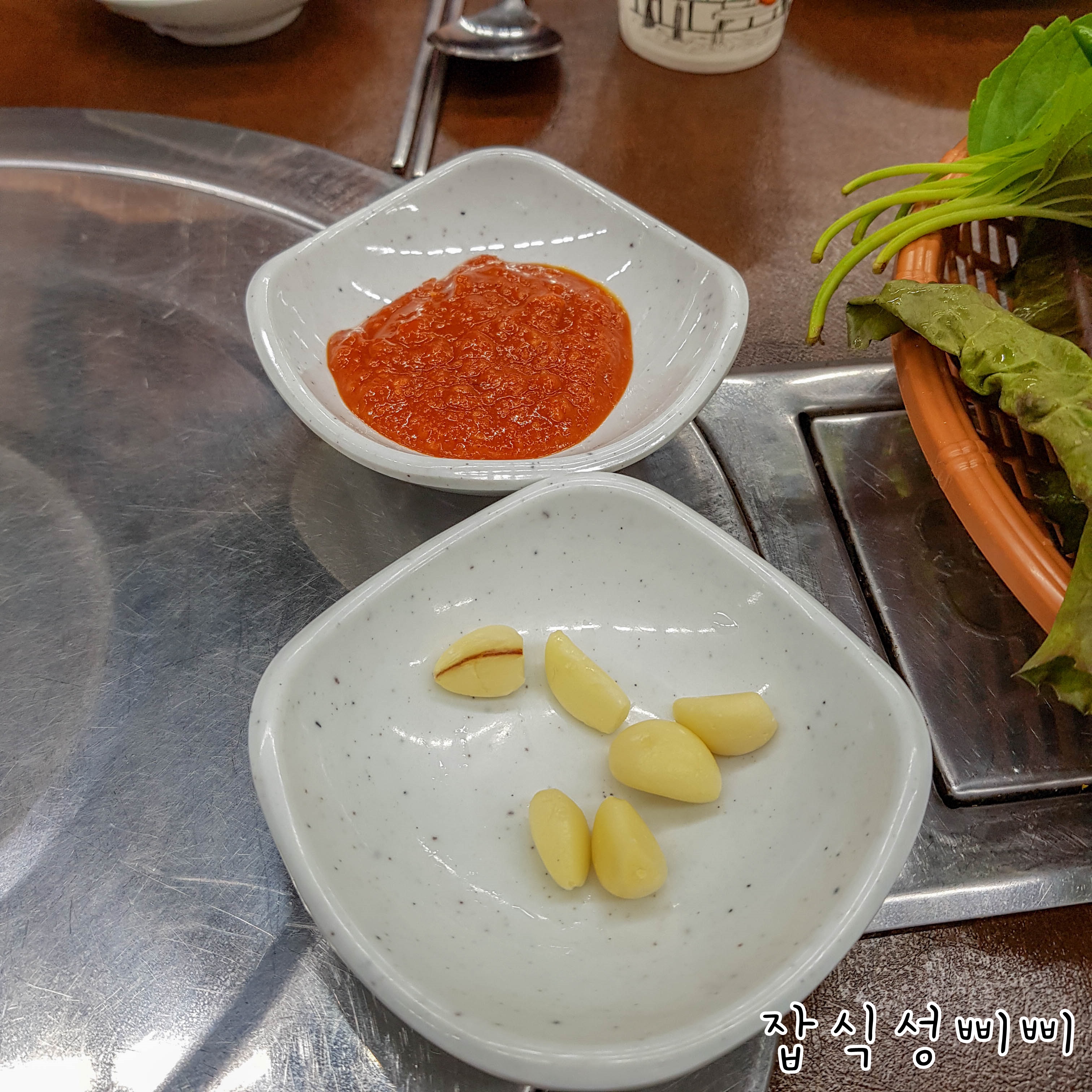 고기를 찍어먹을 기름장, 쌈장, 그리고 생마늘도 같이 나왔구요.