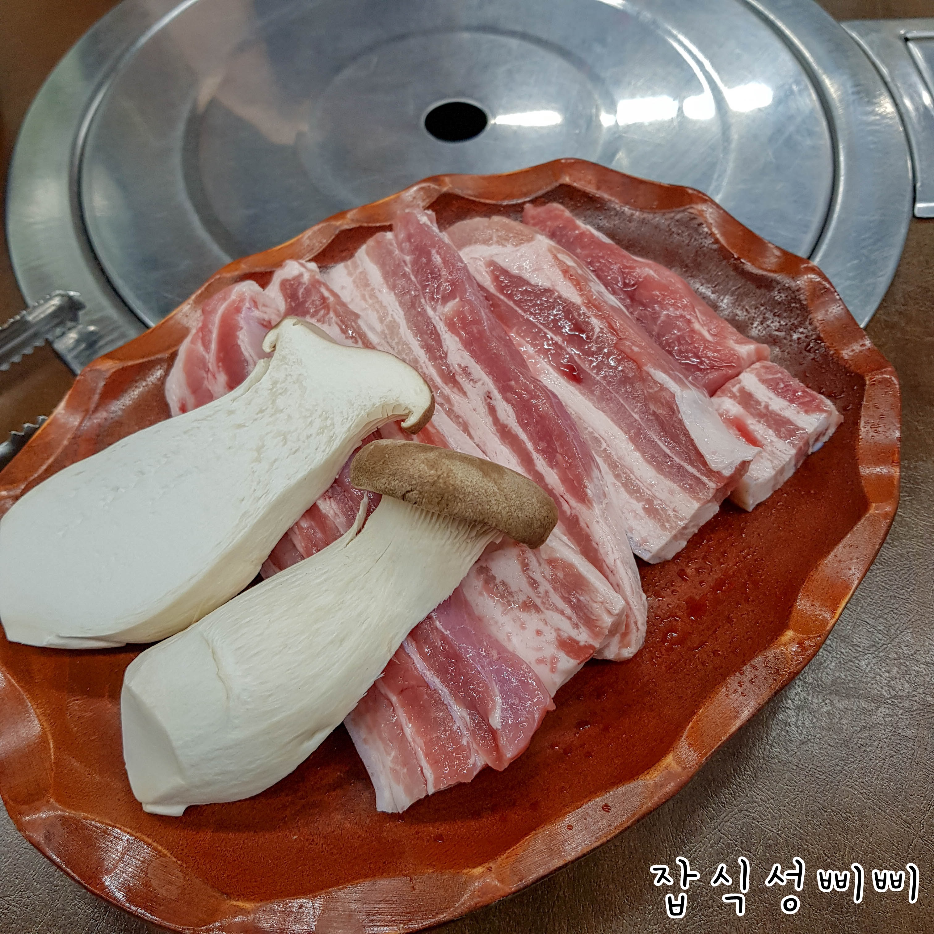 오겹살과 버섯을 불판위에 올려주세요. 아마도 고기가 익는데 시간이 좀 걸려서 고기먼저 준비해주신 것 같아요.