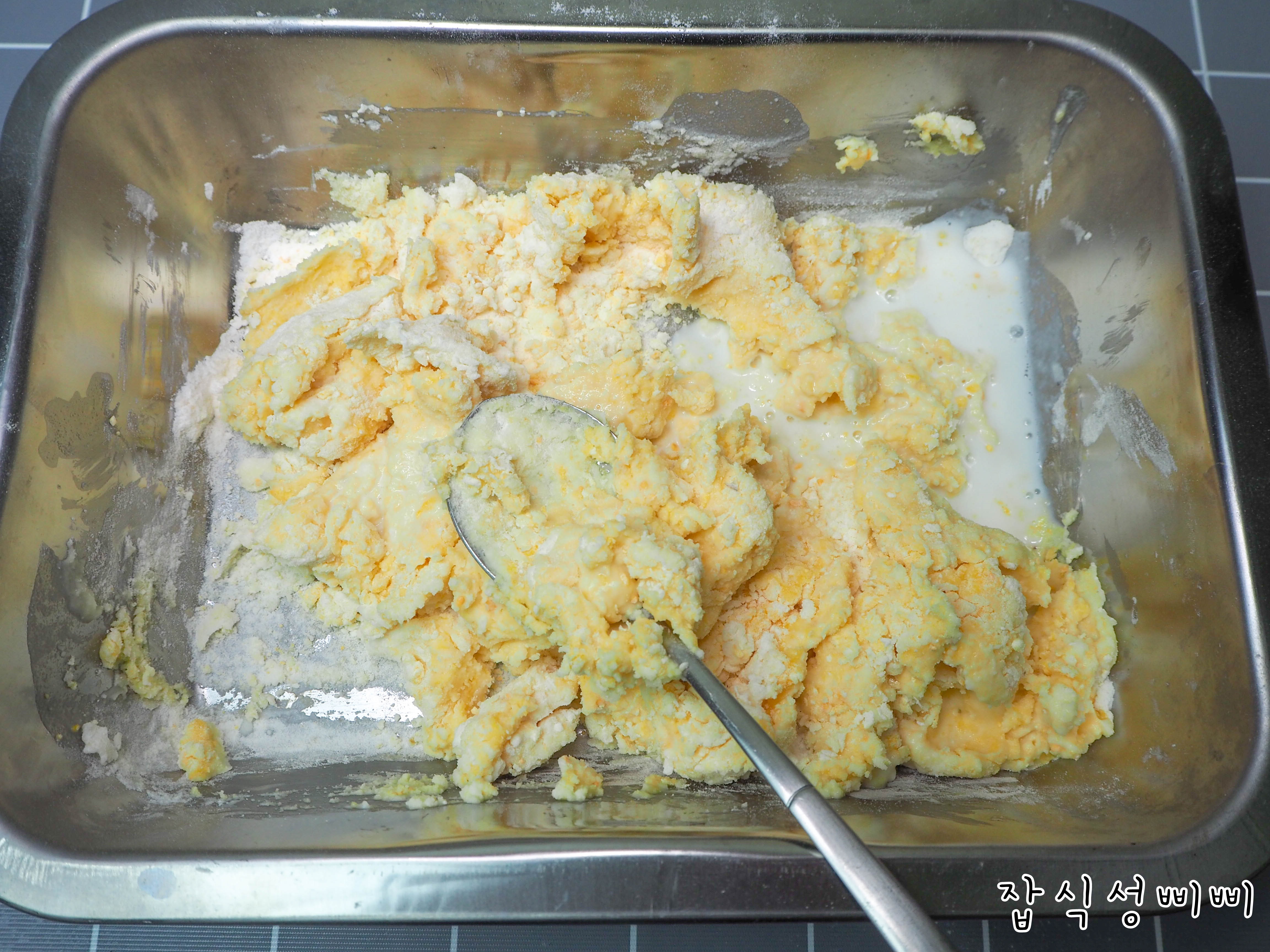 계란을 넣고 우유로 농도를 맞추어주세요. 약간 묽게 농도를 맞추는게 핵심이져!