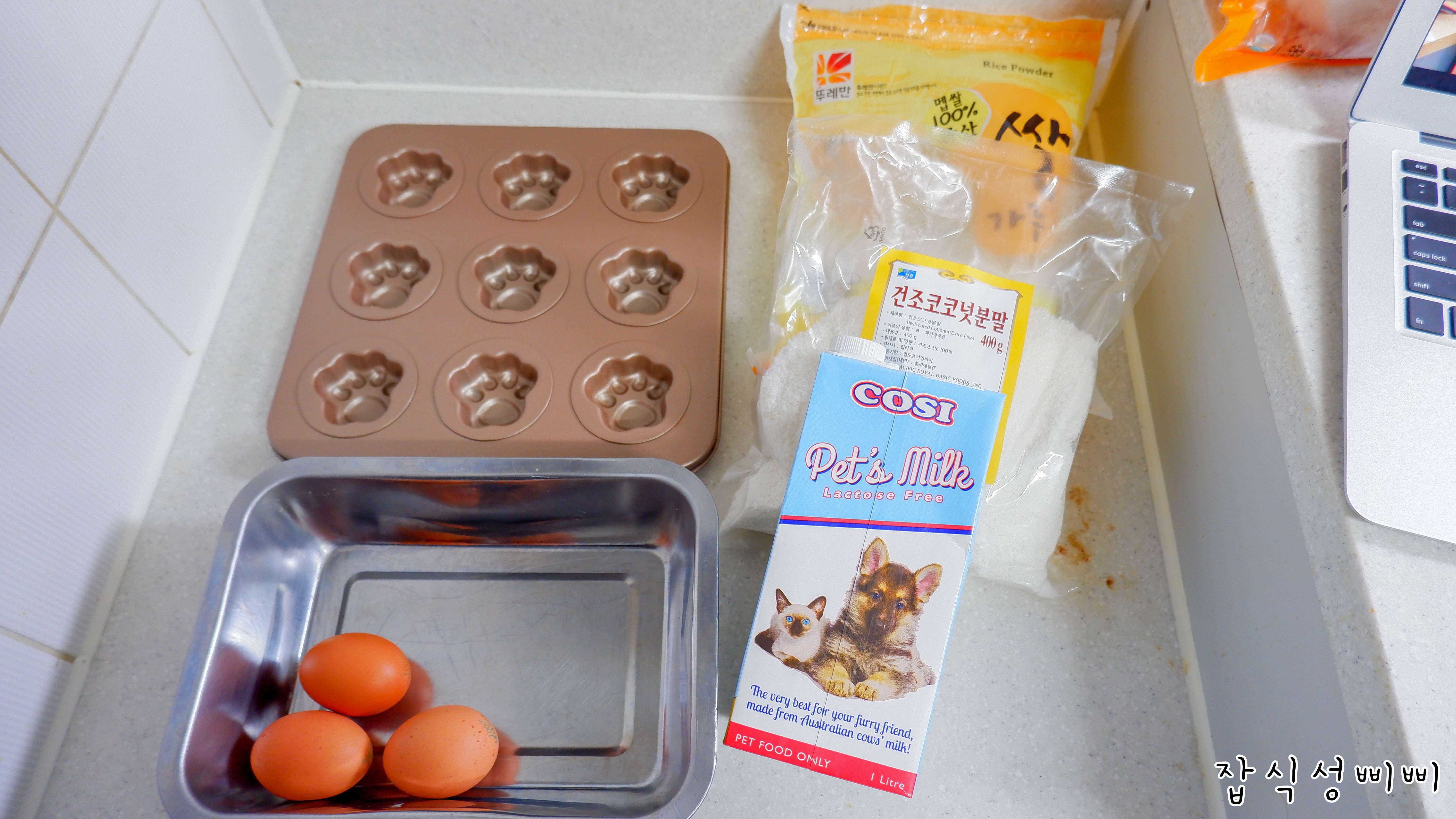 준비물로는 쌀가루, 고구마 분말, 캐롭파우더, 계란, 그리고 락토프리 우유(펫밀크)를 준비해주세요.