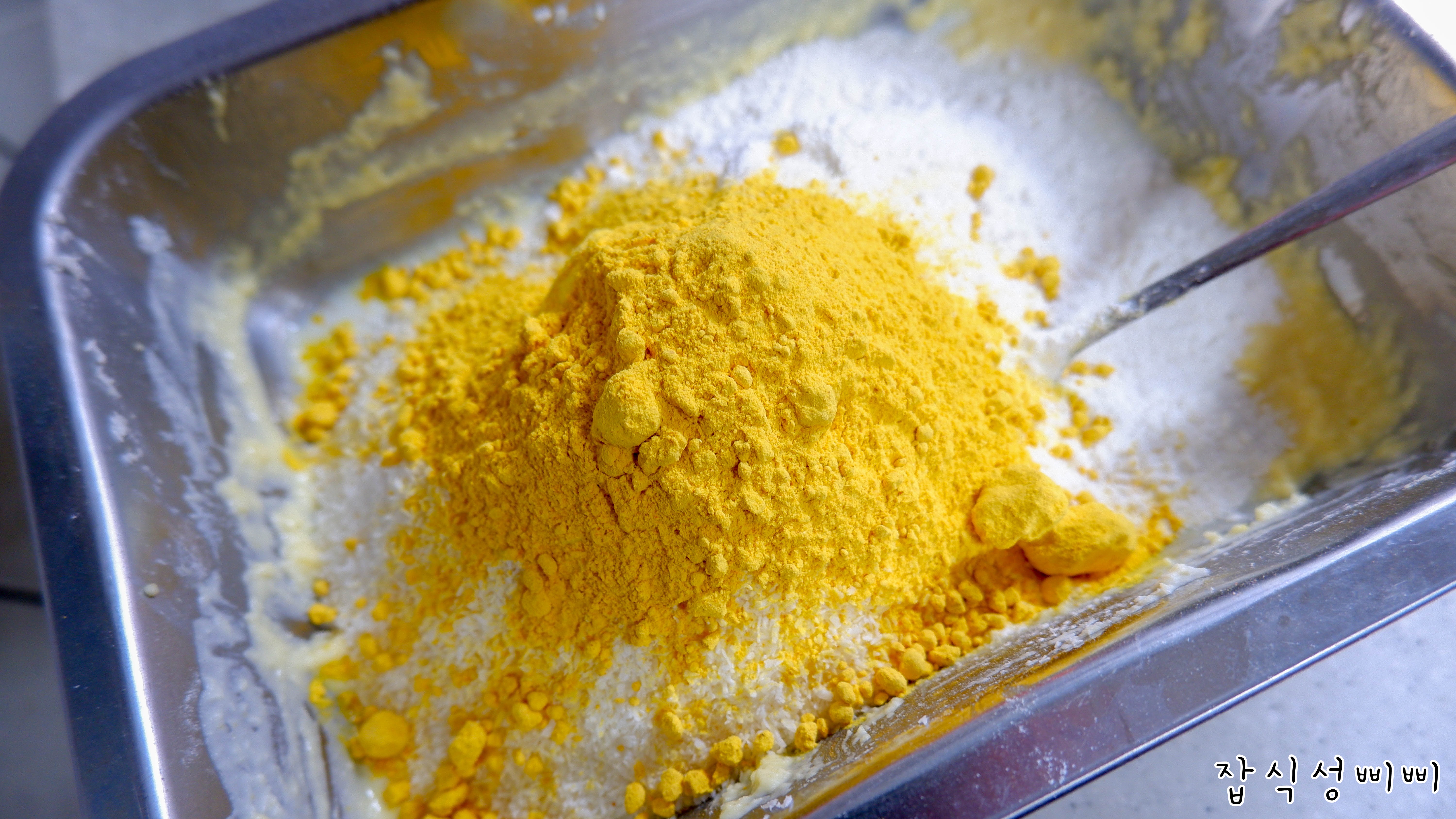 두 번째 반죽은 단호박 가루를 추가해주었어요. 조금 더 노르스름한 색감을 원해서요. ㅋㅋ