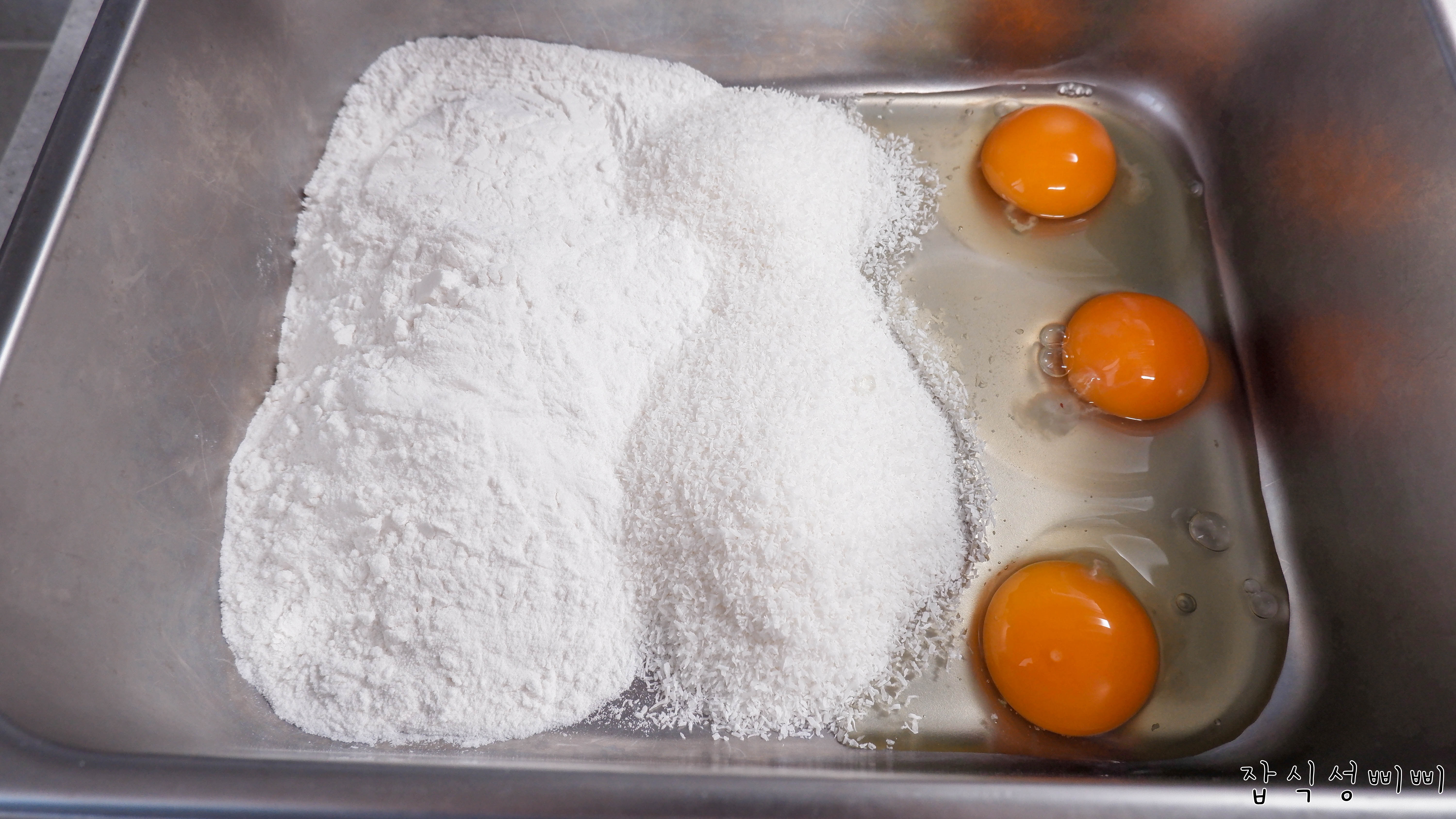 종이컵 기준으로 쌀가루 3컵, 코코넛가루 1컵, 그리고 계란 3개 넣어주었어요. 오븐으로 익힐거라 흰자까지 사용합니다.