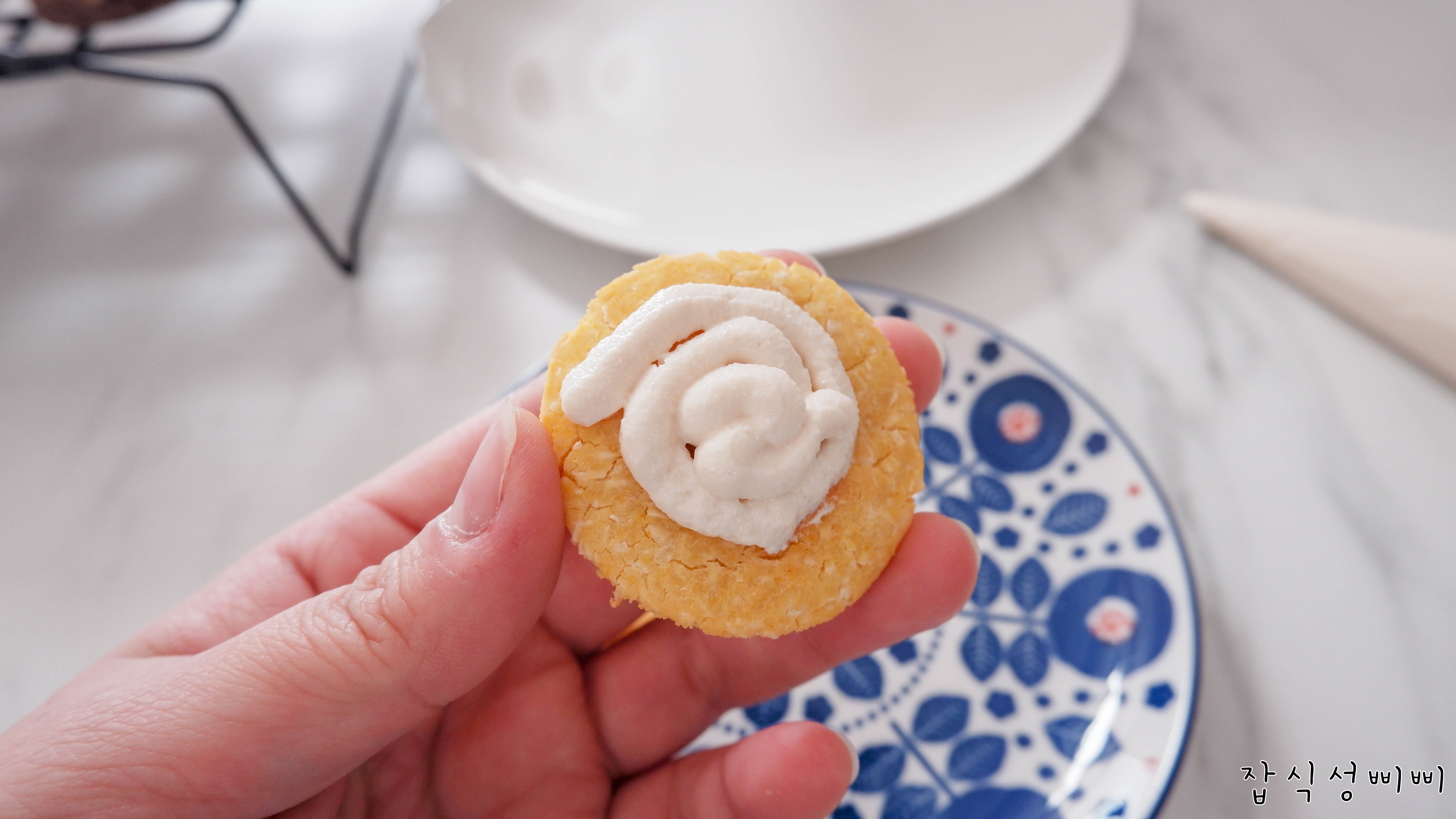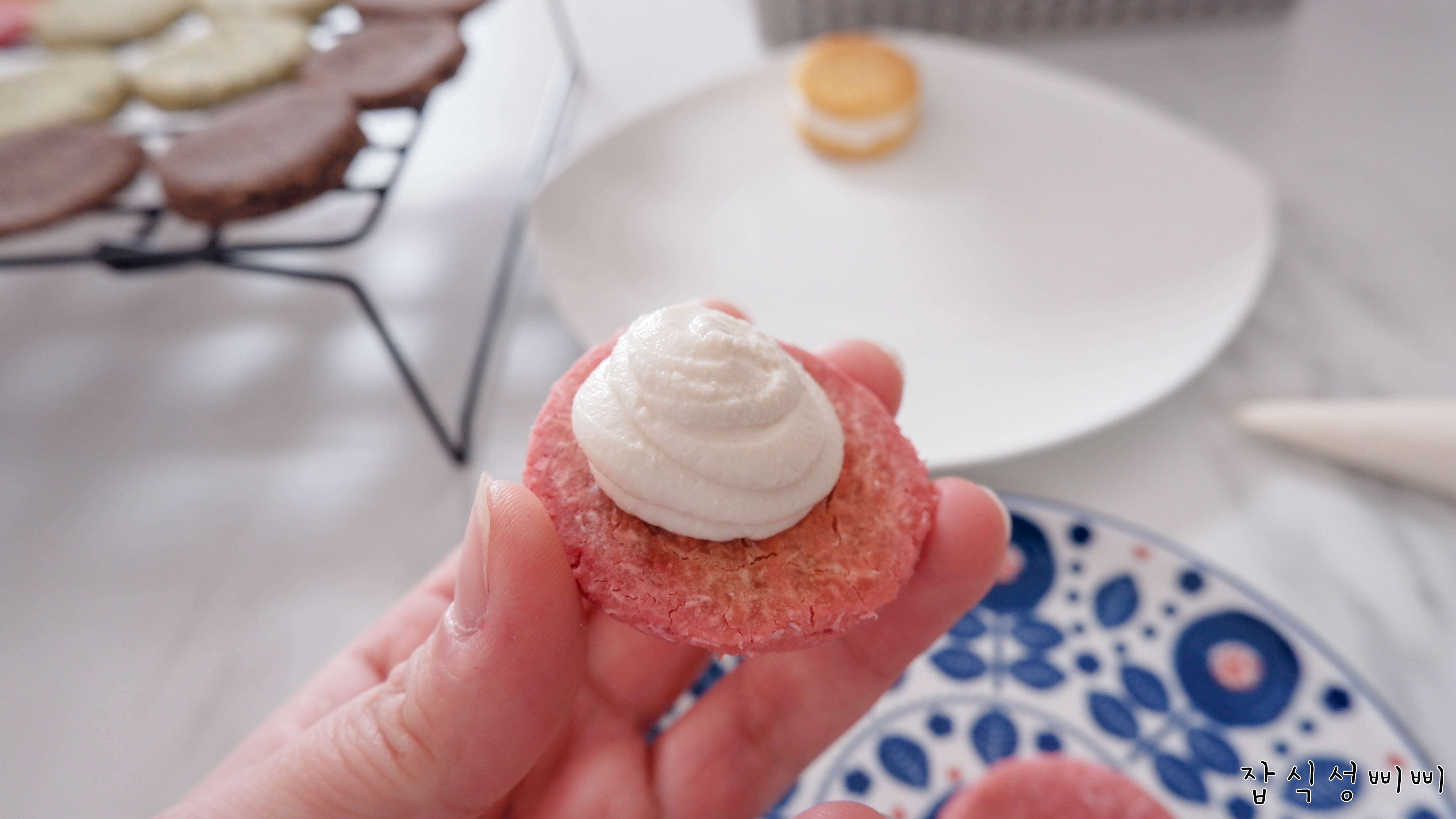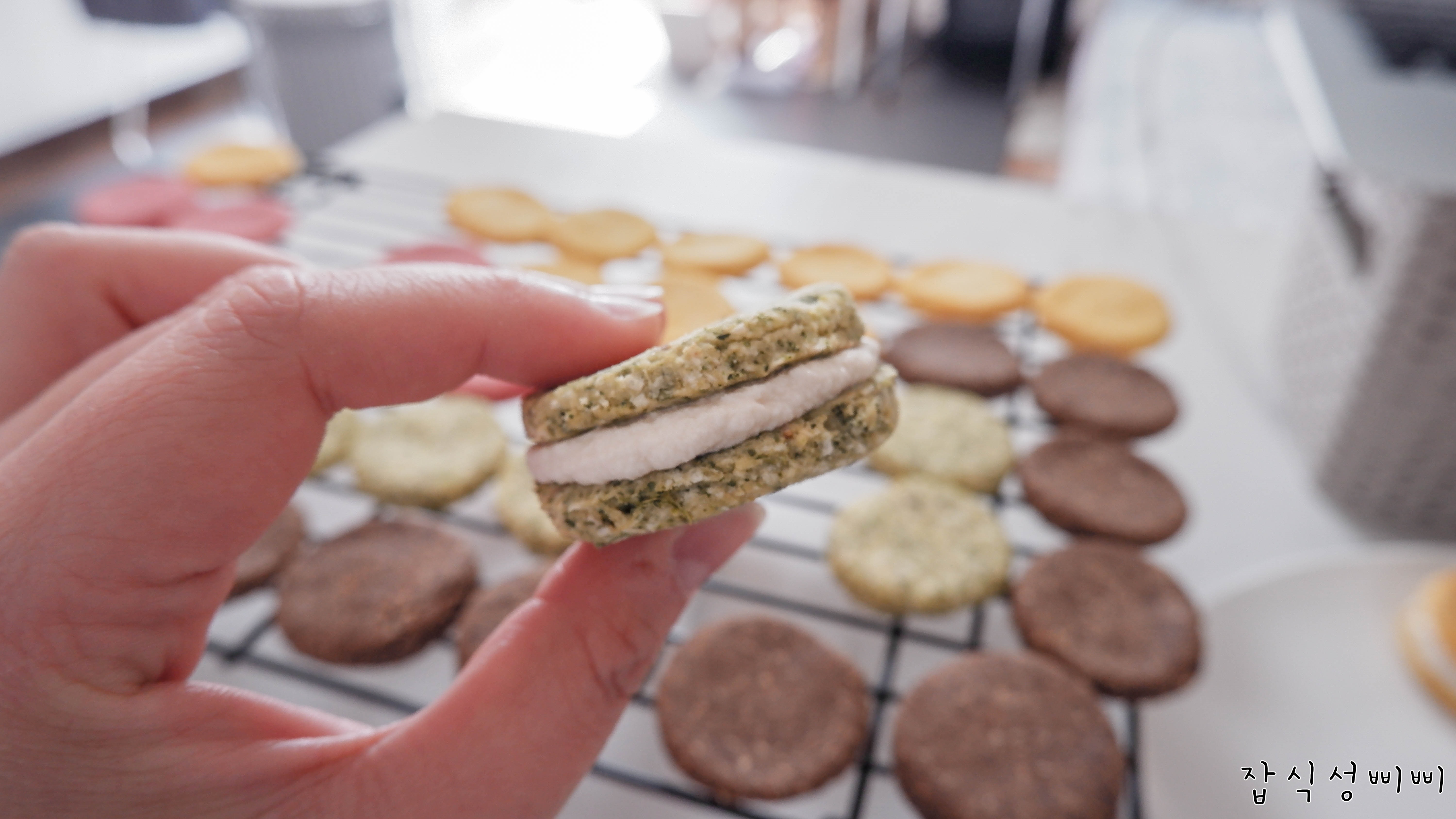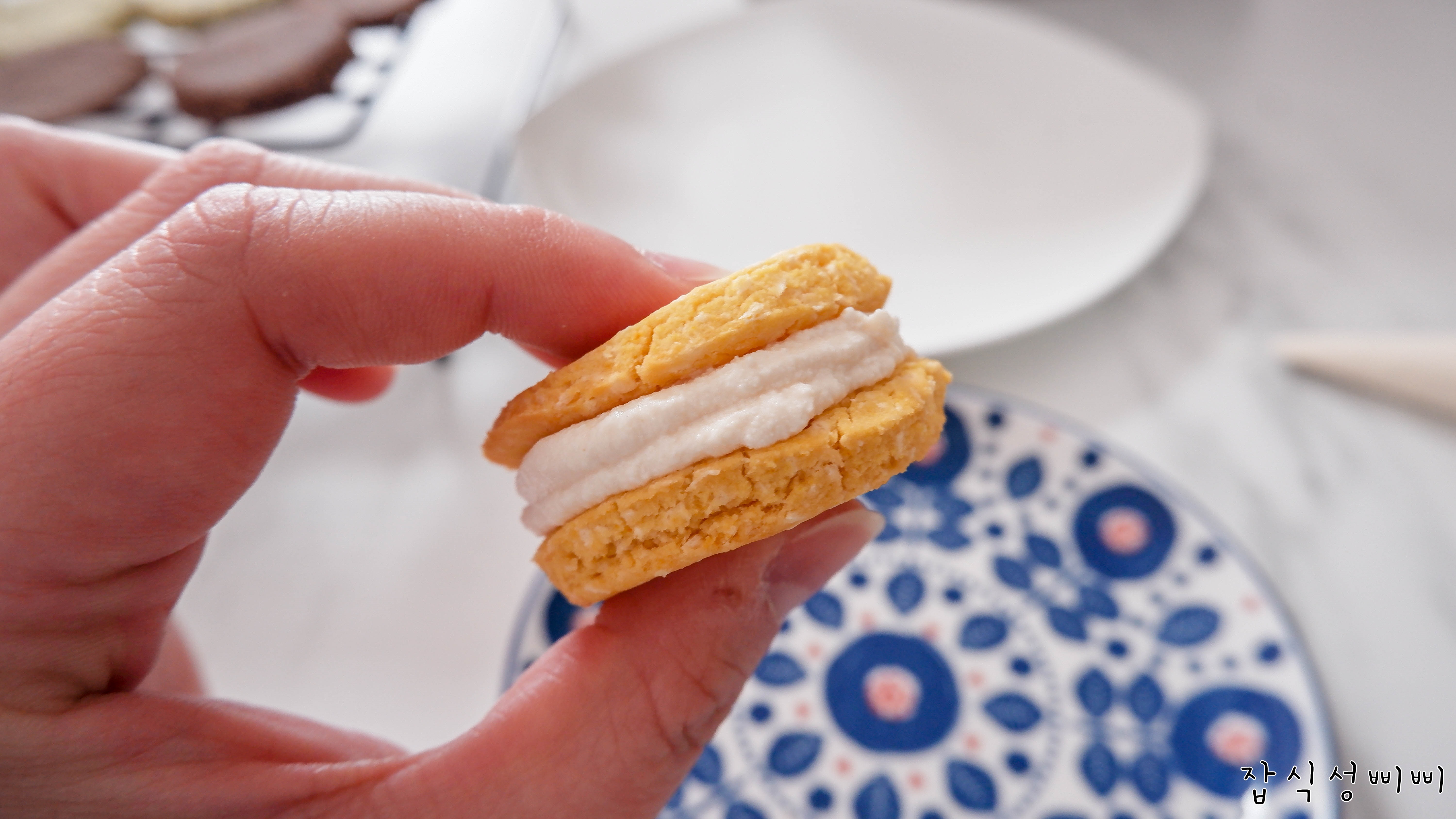 솜씨가 미흡하지만 이런식으로 필링을 채워넣고 크기가 비슷한 꼬끄를 짝지어 마카롱의 모양을 만들어주면 완성입니다!