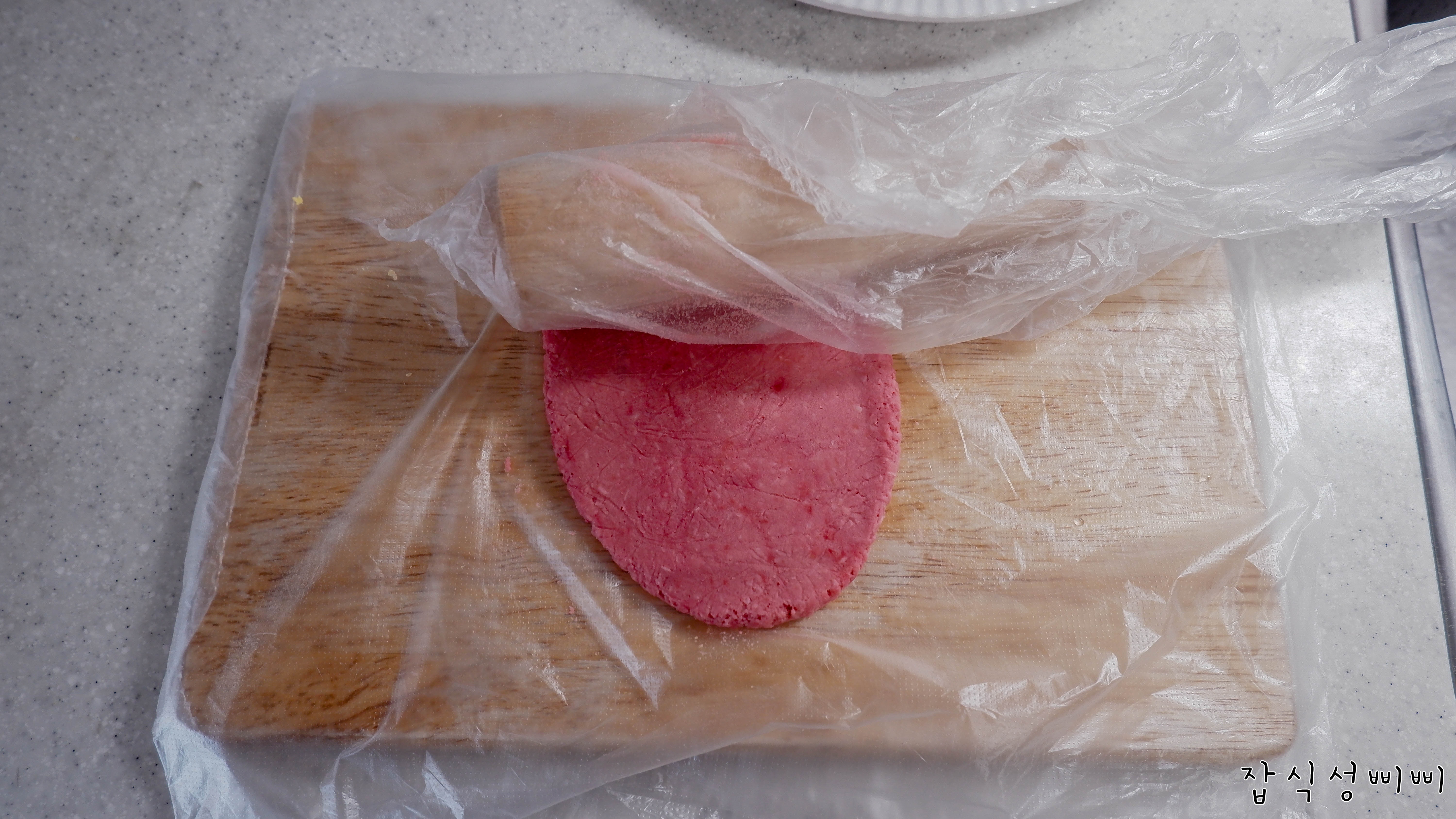 저는 밀대에도 비닐을 씌워서 밀어주었어요. 쌀가루를 뿌려서 밀면 더 부드럽게 밀리지 않을까? 잠깐 생각만 했네요. ㅋㅋ