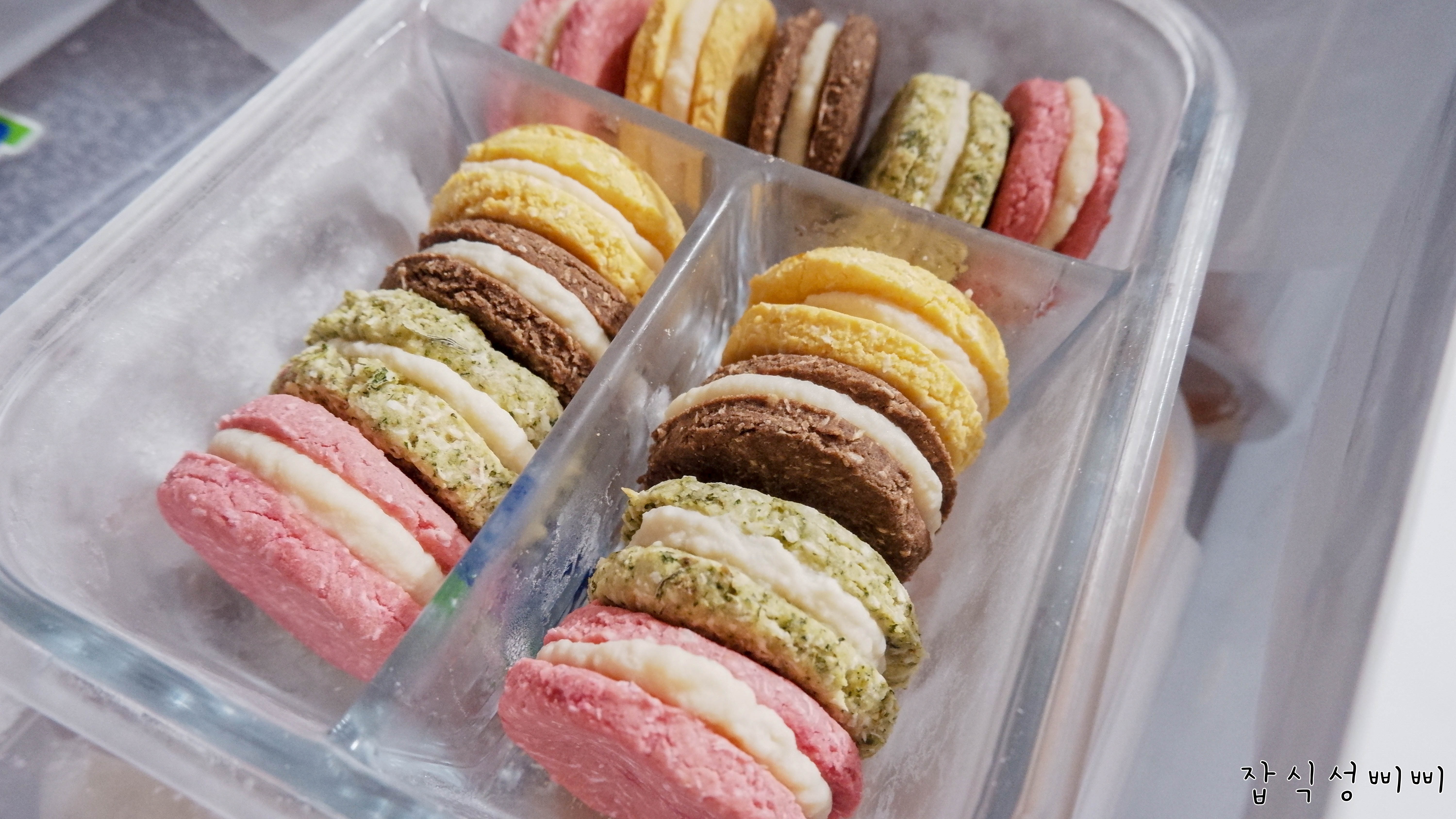 차갑게 식은 마카롱은 용기에 넣어 냉동고에 넣어 보관합니다. 급여하기 전에는 살짝 해동하거나 전자레인지에 살짝 돌려서 급여합니다.