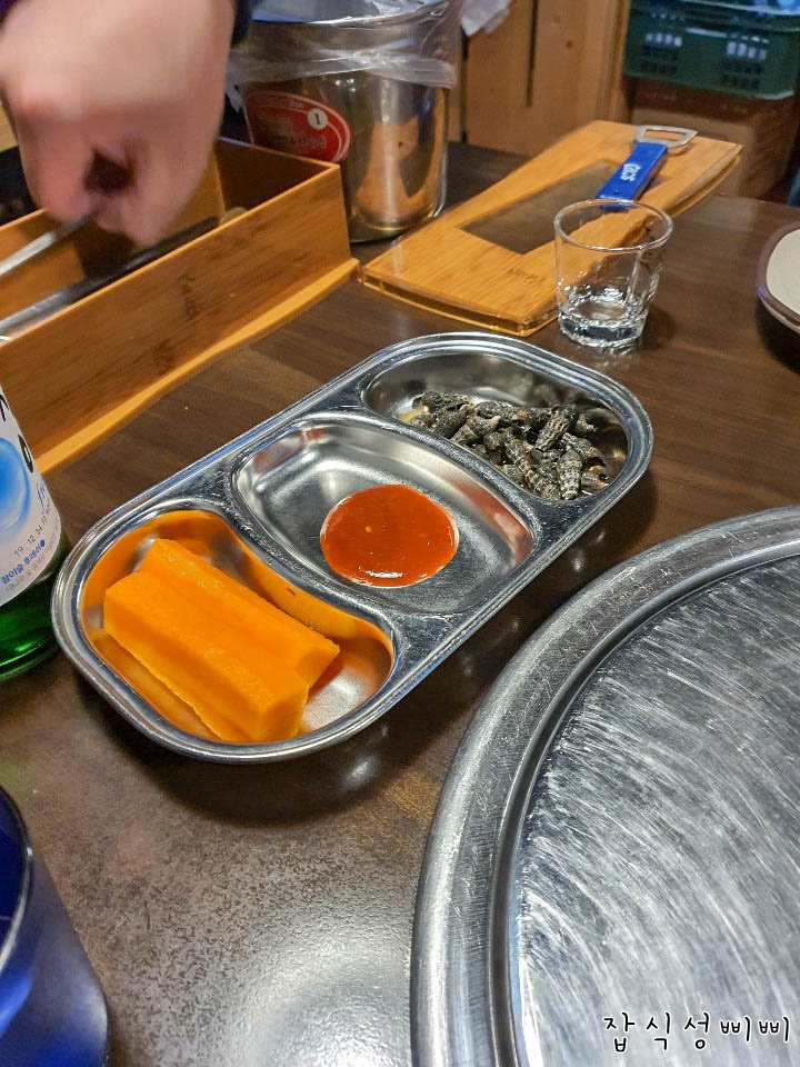 기본으로 나오는 안주에요~ 초장, 당근스틱~ 그리고 저건 고동이라고 하나요? ㅎㅎ