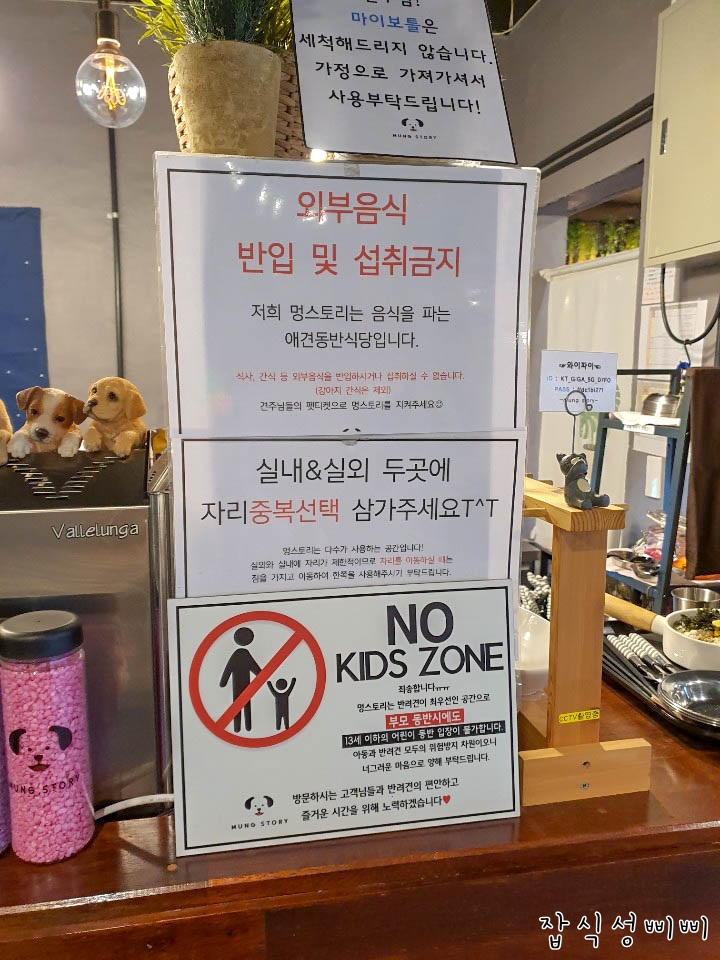 멍스토리는 노 키즈존이에요. 13세 이하의 어린이는 동반 입장이 불가한 곳! 사실 애견카페에서 어린 아이들 만나면 강아지들도 예민해지고 덩달아 삐삐까지 신경이 곤두서거든요. 노키즈존이라 조금은 마음 편하게 놀 수 있겠어요~