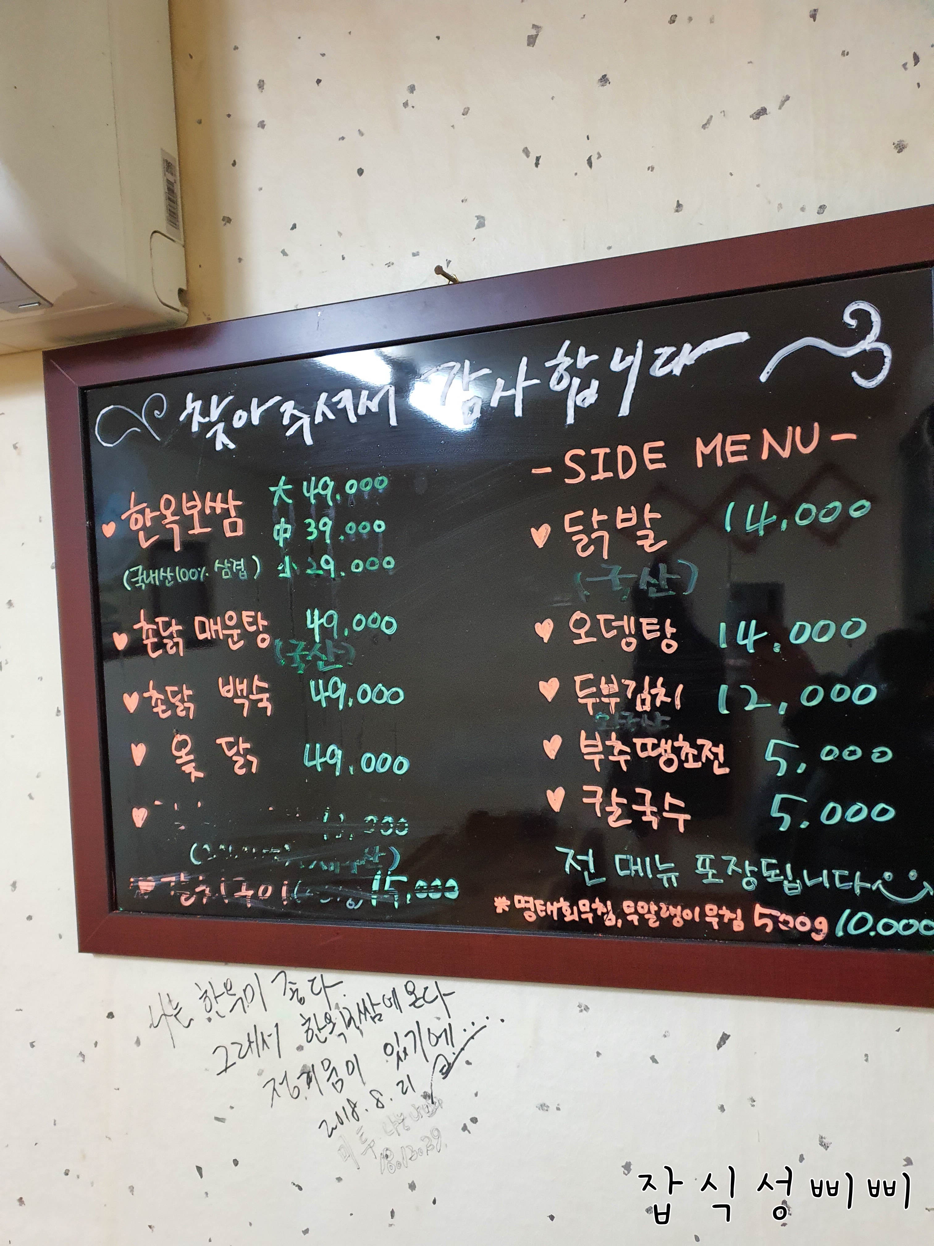 삐삐가 주문한 메뉴는 한옥보쌈 소, 촌닭 매운탕, 칼국수 입니다 :)